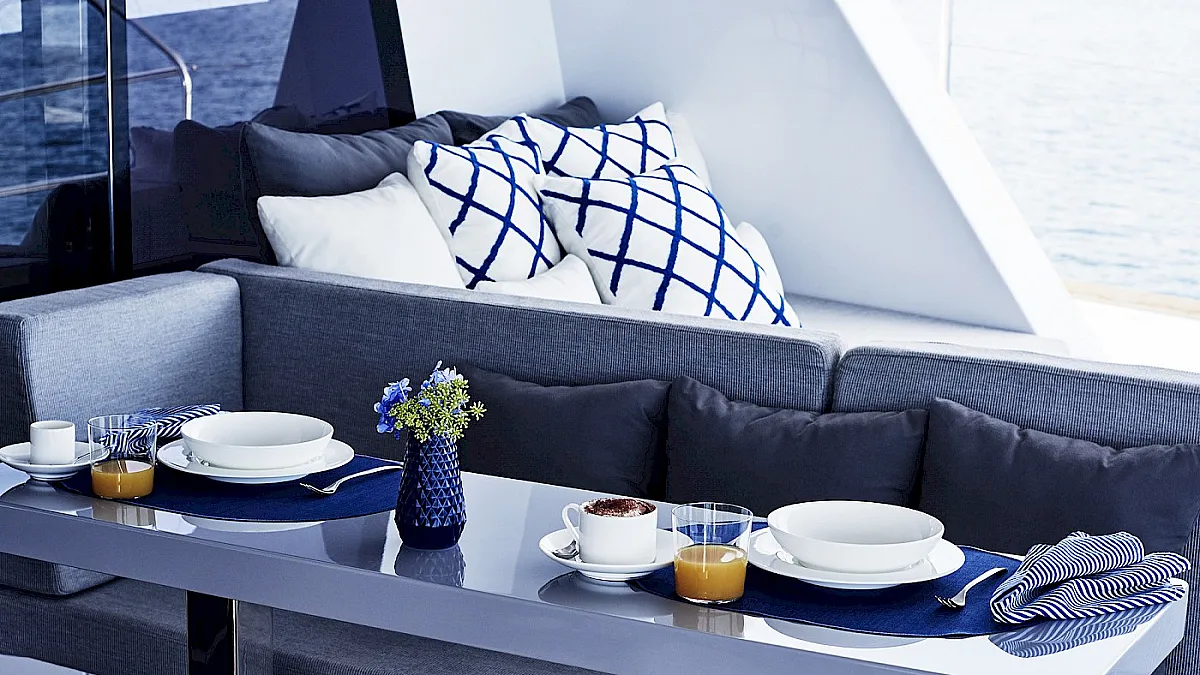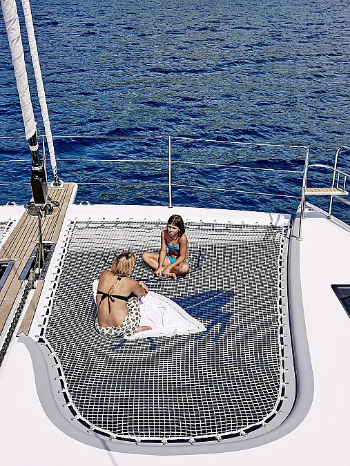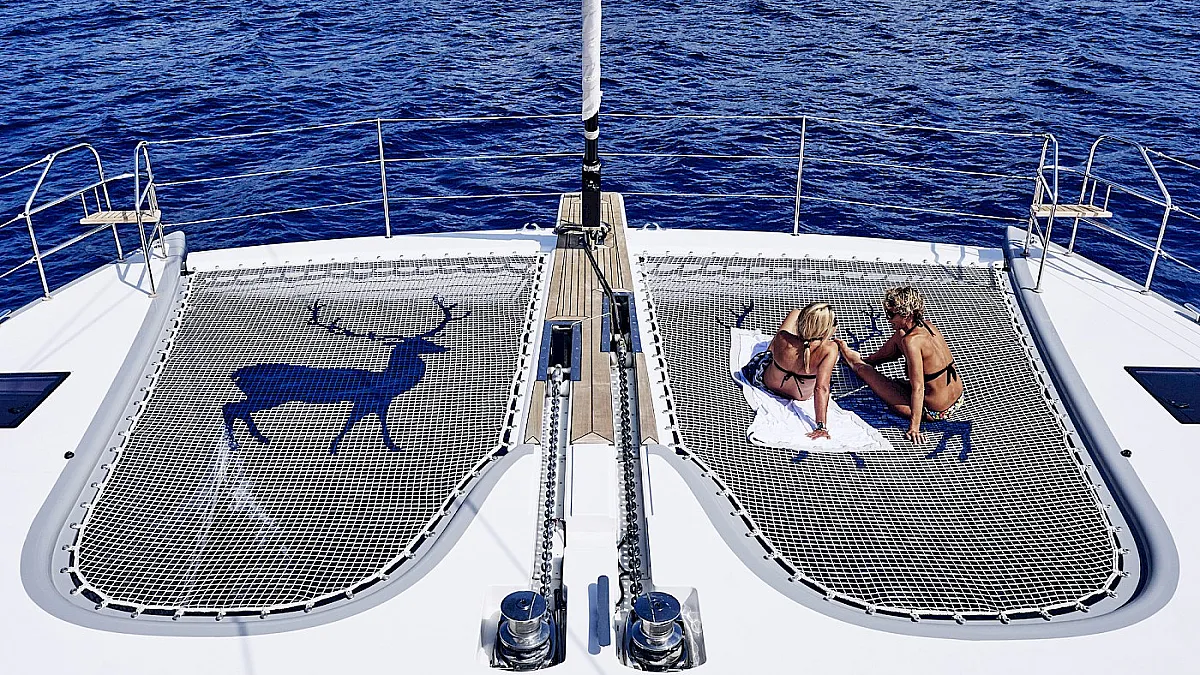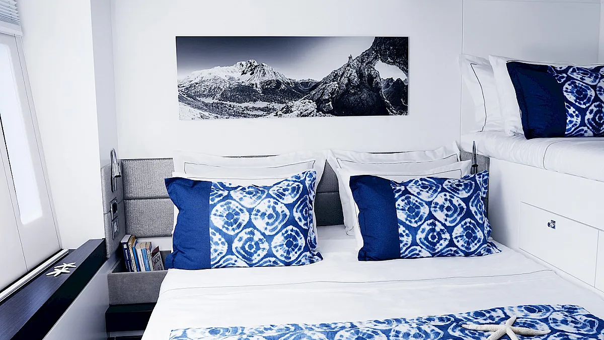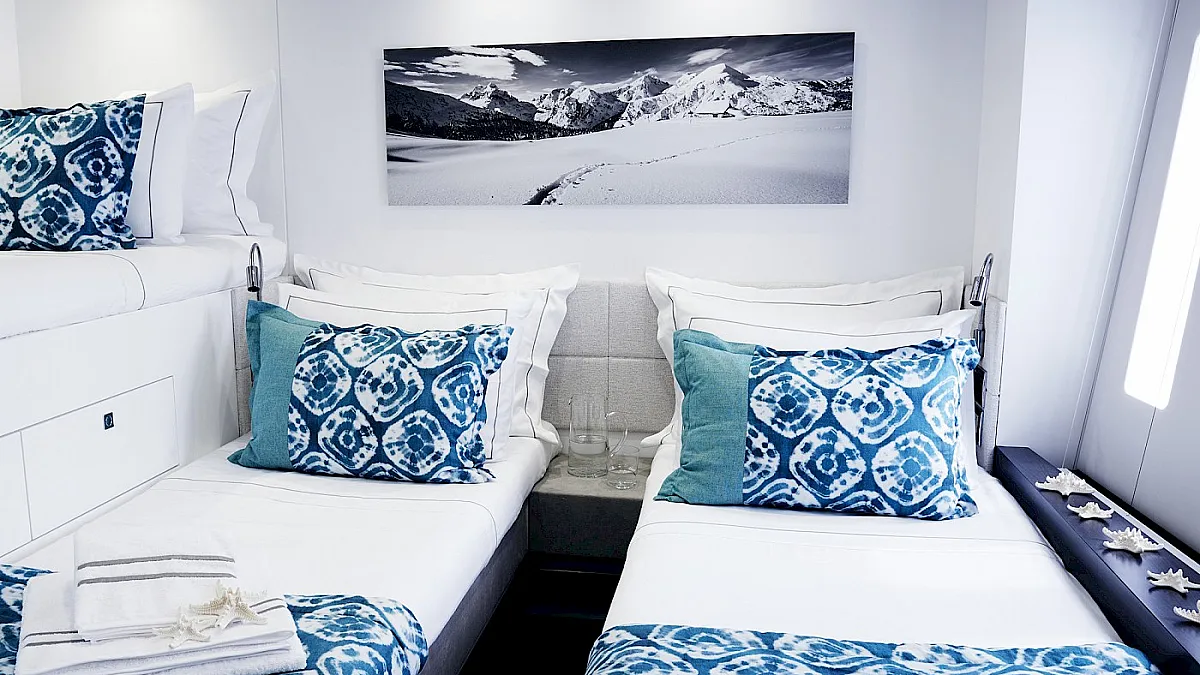 Accommodates up to 8+2 guests in four separate spaces in the hulls including 2 deluxe cabins and 2 VIP cabins. 2 Twin cabins can be converted in 2 Double cabins