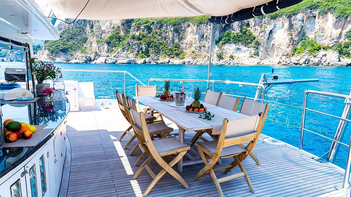 Teak afterdeck with 10 person dinner table