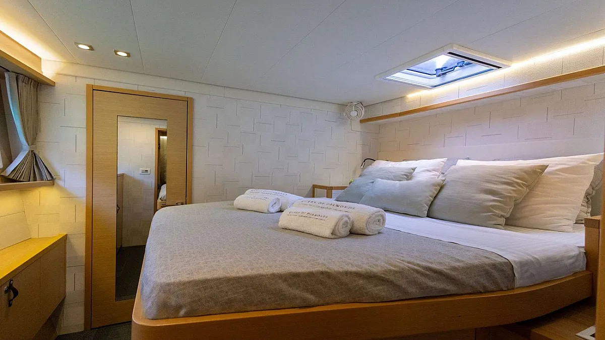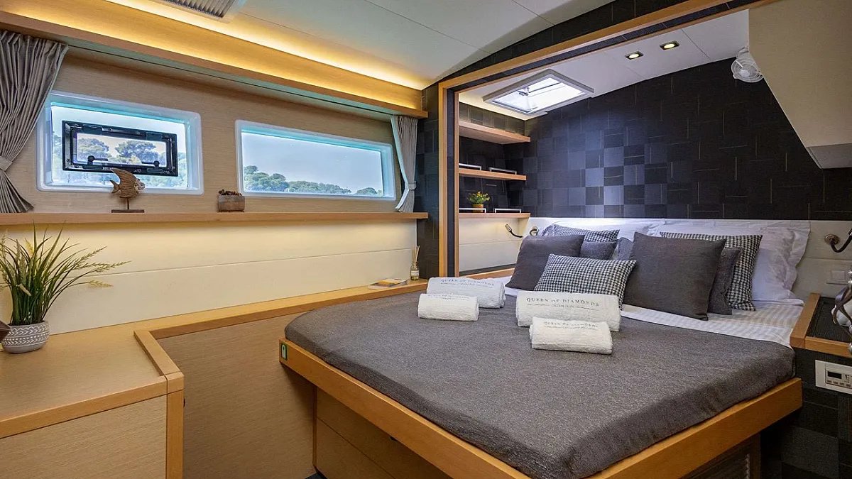 1 Master cabin with queen bed, 3 Double cabins with queen beds, 1 cabin with bunk beds