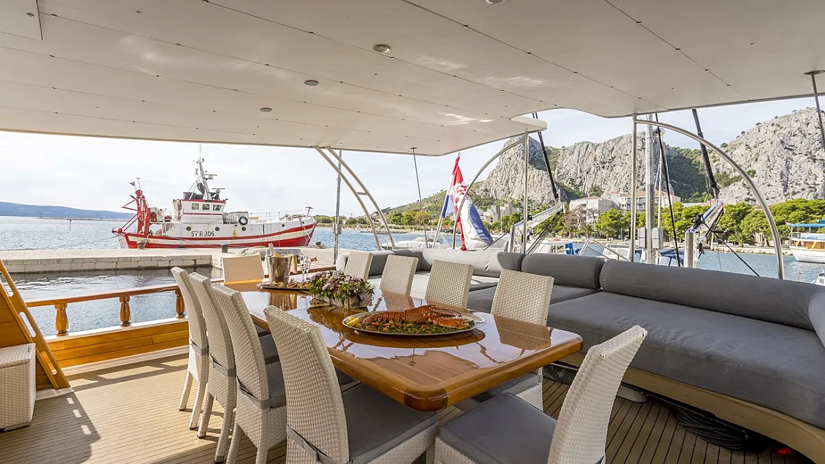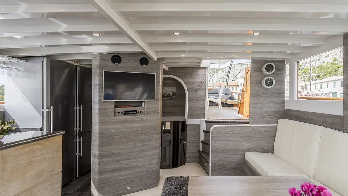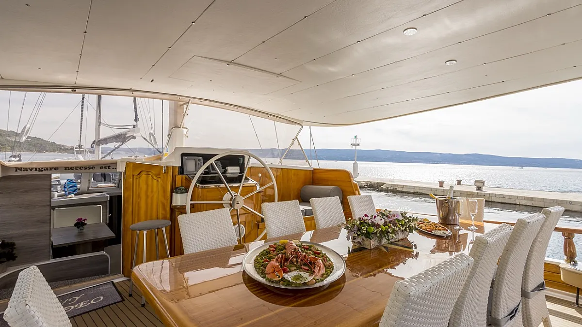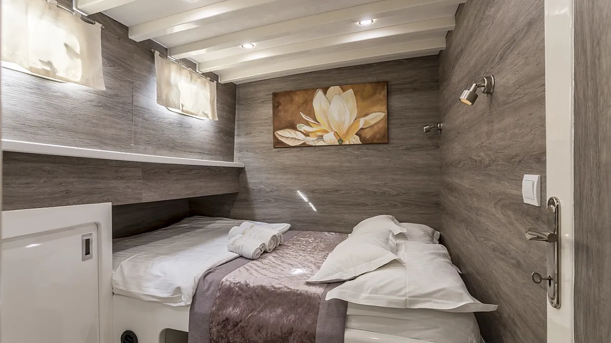 Charter rate includes, accommodation for maximum 10 guests in 5 cabins, crew of 3 and their expenses, insurance of the yacht, fuel for 4 h of the engine work daily, generator work 24/7, fuel for tender transfers to/from the vessel, use of recreational equipment (SUP, kayak, snorkeling gear, fishing equipment, assorted floats), tourist taxes, Wi – Fi, VAT of 13%.