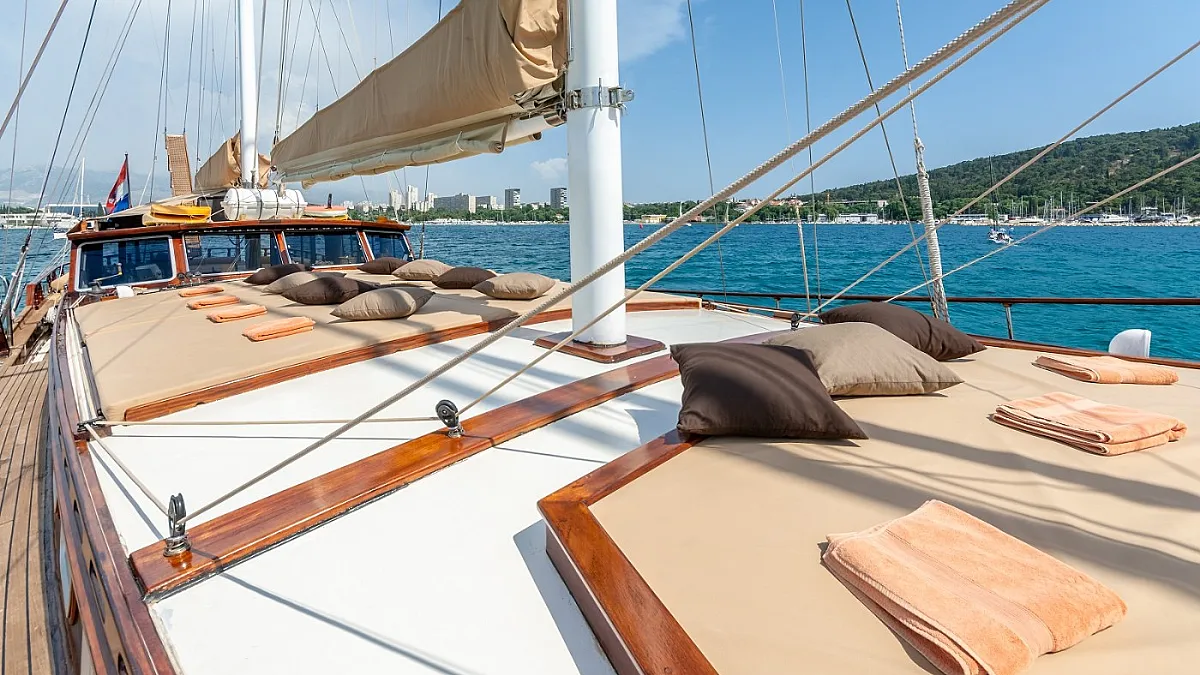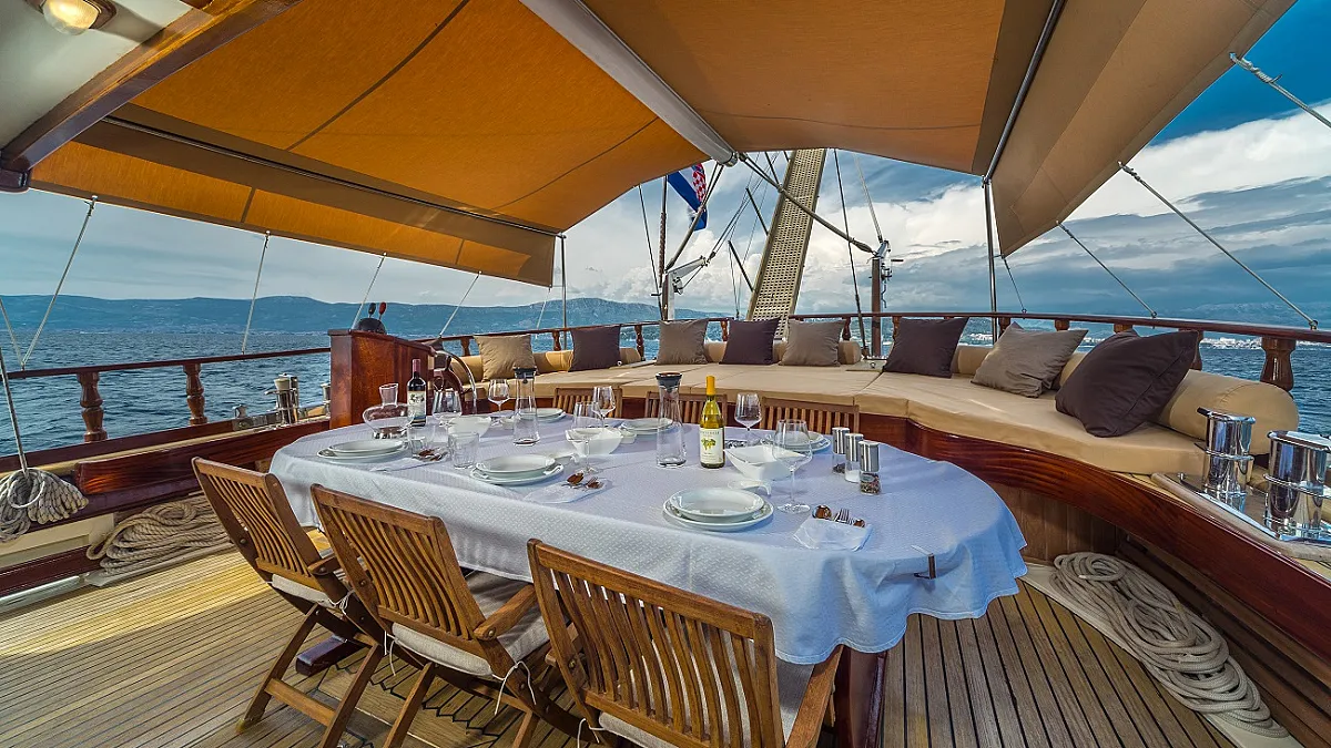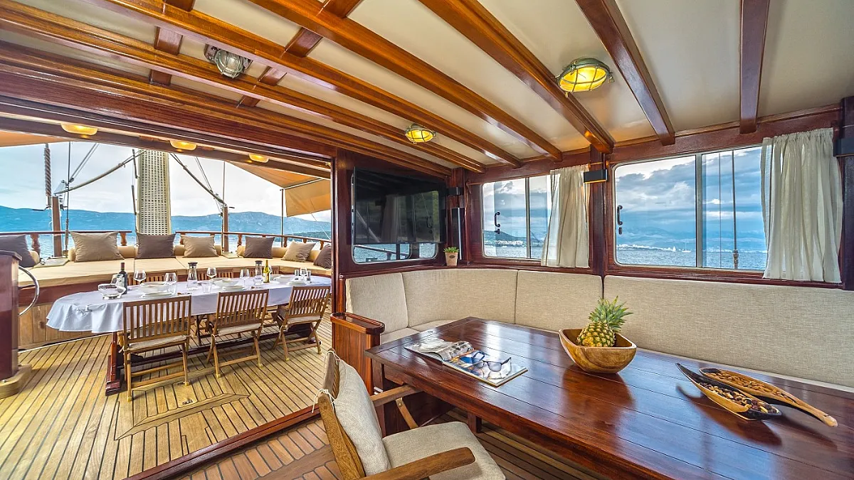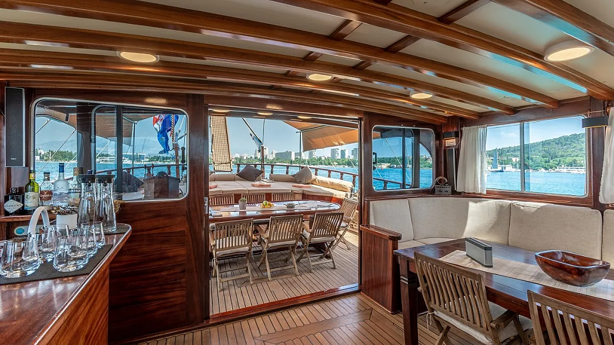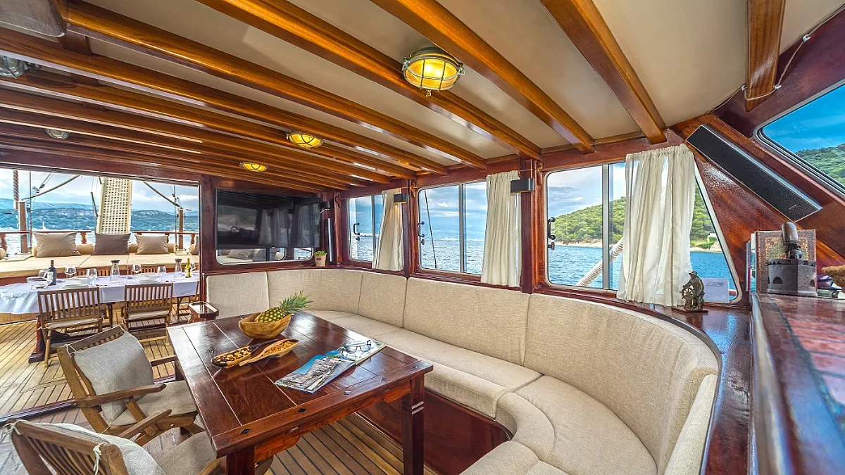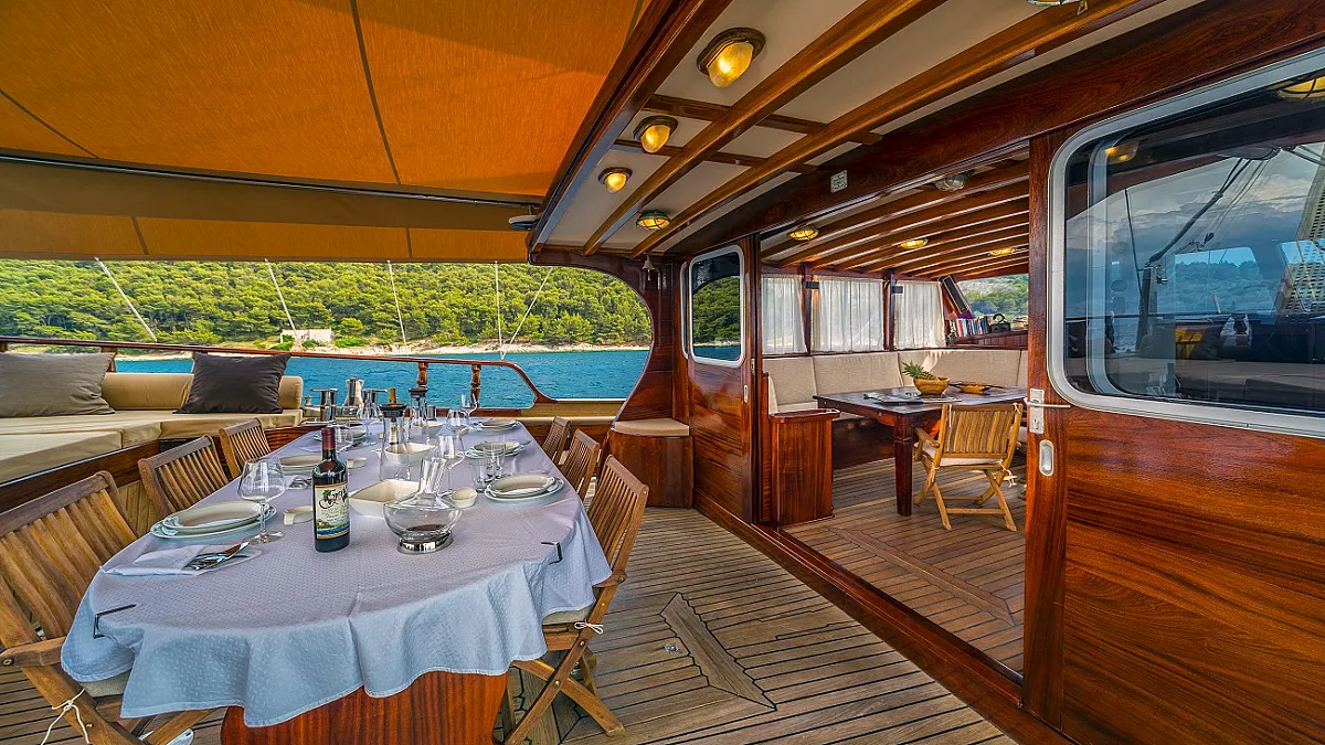 You will enjoy the yacht’s salon. It is a cosy living space that features music and TV systems, a settee and a bar. If the weather is capricious, dining takes place inside the salon. Otherwise there’s a beautiful option aft deck with a big table for 10 guests.