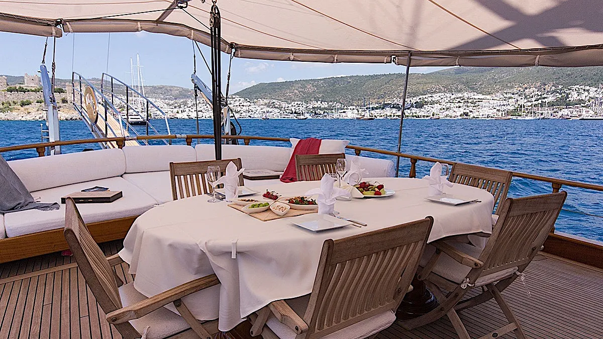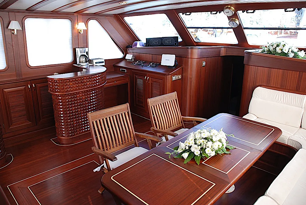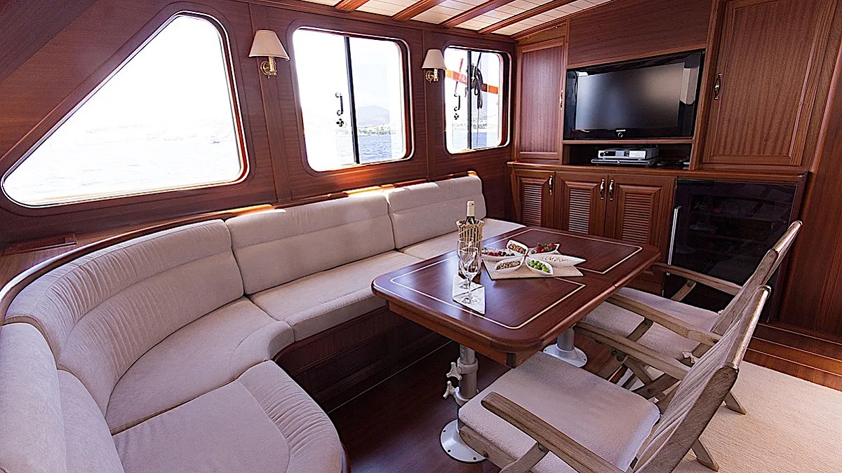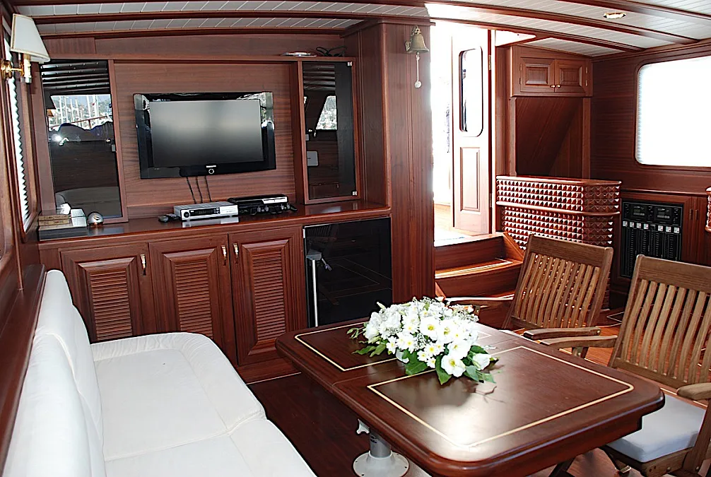 The yacht’s saloon is a pleasant place where it’s possible to repose from vitamin D, watch a movie or some entertaining program, play board games, or have a tea time with snacks prepared by the chef. If the weather is not in the mood, then dining can be easily moved from the aft deck to the salon. However, southwestern coast of Turkey is one of the sunniest places at least from May until October. The weather grizzles very rarely here during the season.