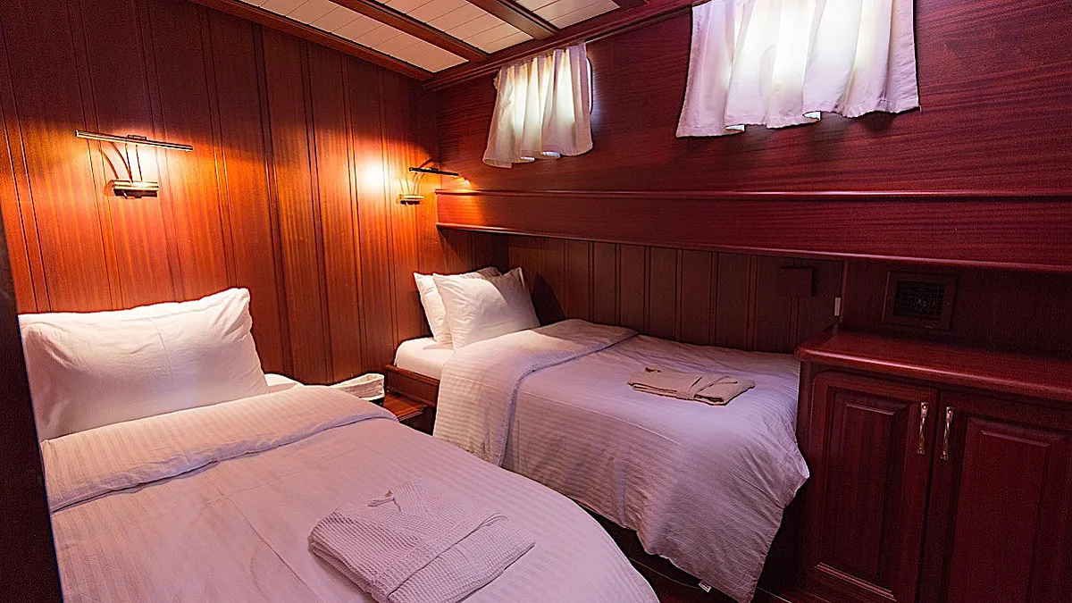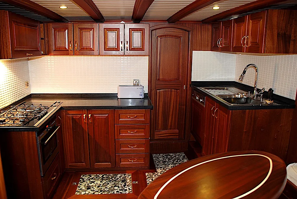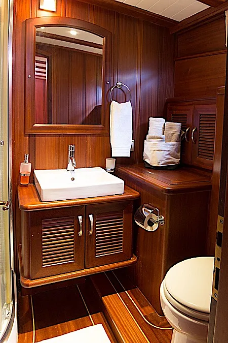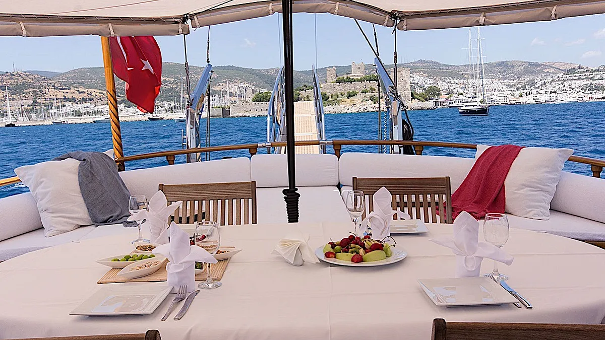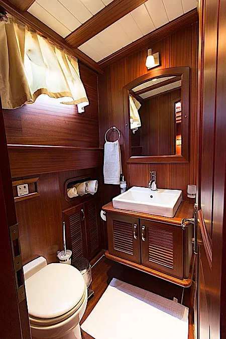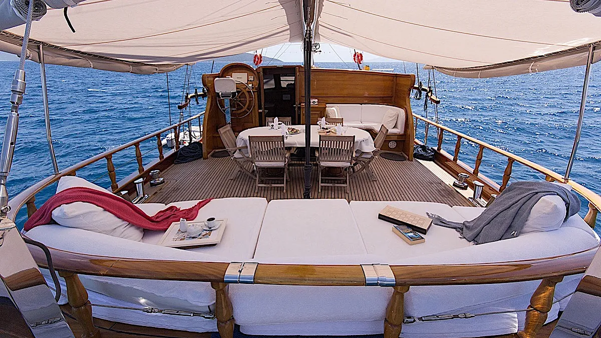 The yacht’s saloon is a pleasant place where it’s possible to repose from vitamin D, watch a movie or some entertaining program, play board games, or have a tea time with snacks prepared by the chef. If the weather is not in the mood, then dining can be easily moved from the aft deck to the salon. However, southwestern coast of Turkey is one of the sunniest places at least from May until October. The weather grizzles very rarely here during the season.