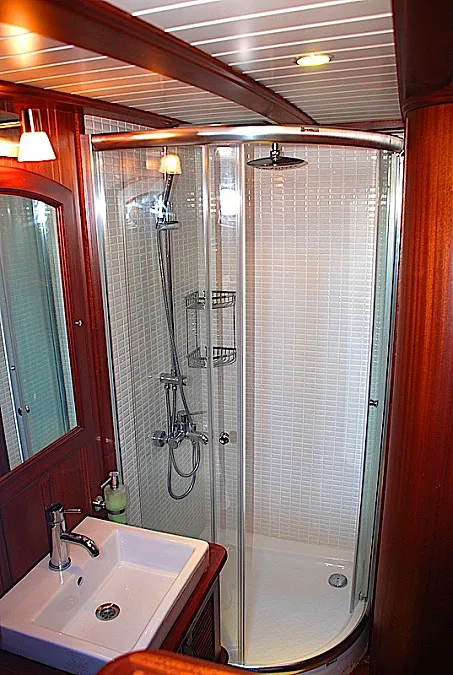 ATALANTE accommodates her guests in four beautiful cabins each with private ensuite, comfortable beds, good quality bed-linen and home-like decoration. Two double and two twin staterooms are located forward of the saloon. Berths in the twin cabins are convertible, thus two single beds can become a one double. As for the entertainment, each cabin features a TV, DVD, and a Satellite system. So whenever guests wish, they may watch a movie or simply navigate through various channels before heading to sleep, or check the news in the morning. And all this is available without the need to leave the bed.