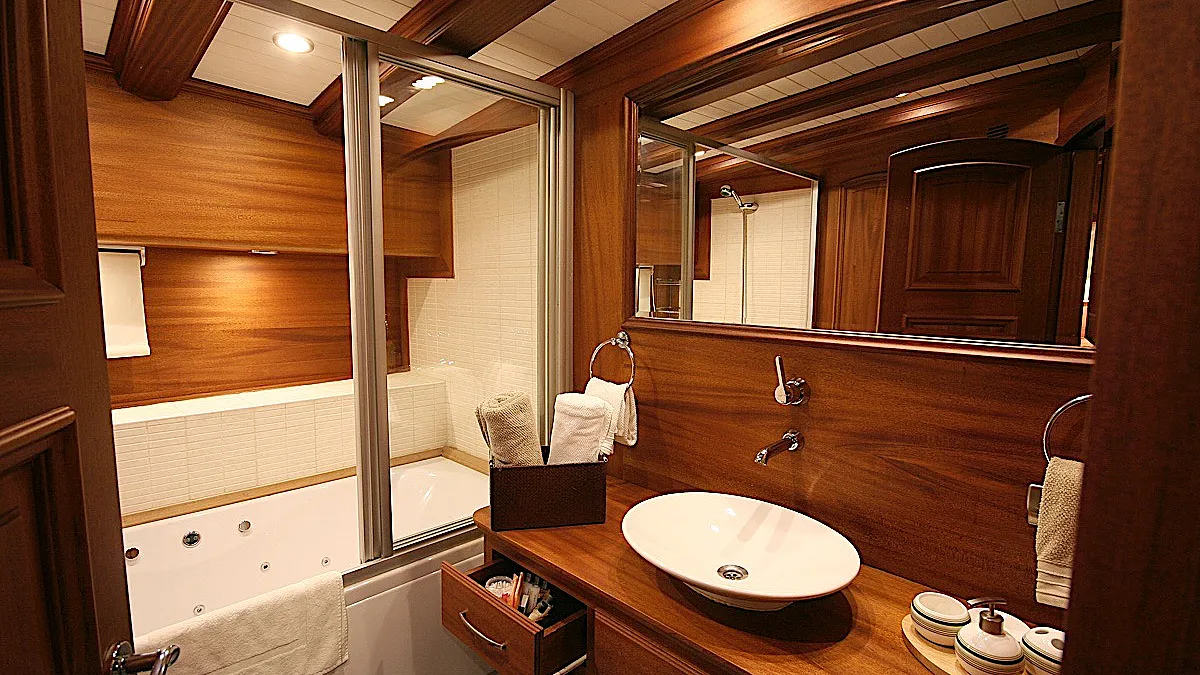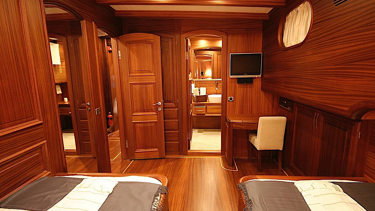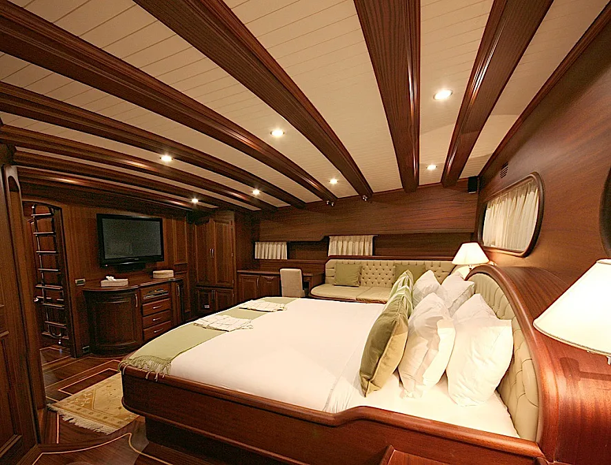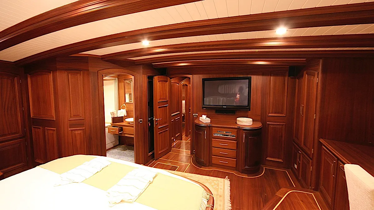 Charter yacht CANER IV boasts one of the most luxurious accommodation for 12 guests. It comprises two spacious master staterooms, two double and two twin cabins. All of the staterooms are air-conditioned for absolute comfort of guests and have a TV entertainment system. All cabins feature ensuite bathrooms decorated with marble tiles and rich mahogany, with shower boxes or jacuzzi tub.