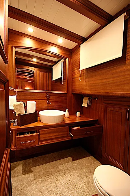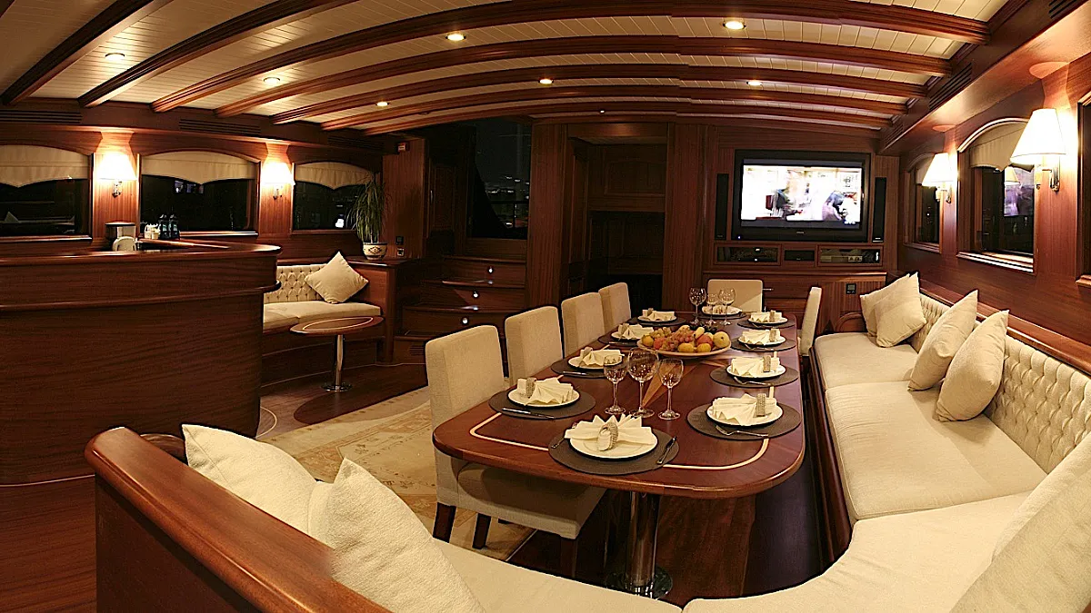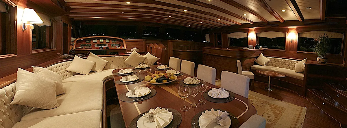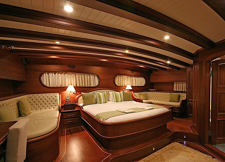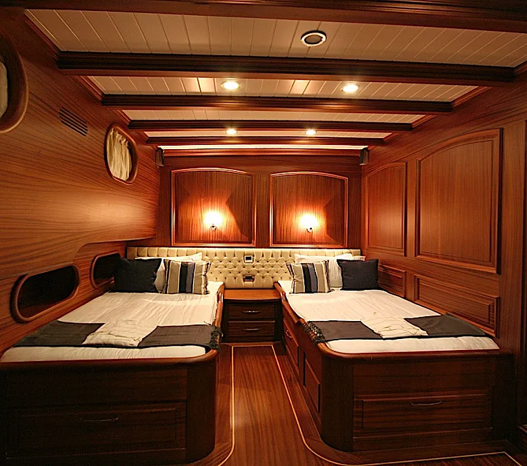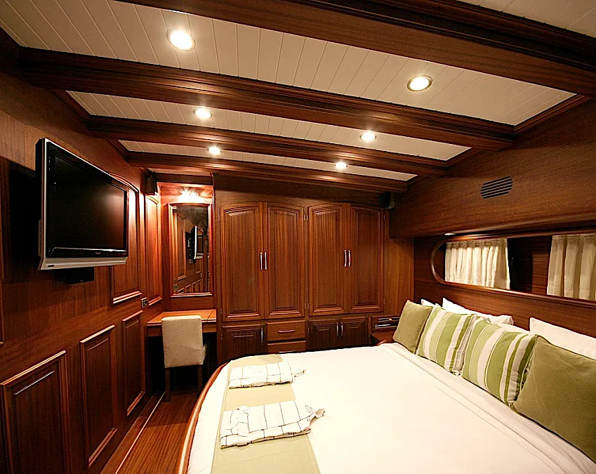 Charter yacht CANER IV boasts one of the most luxurious accommodation for 12 guests. It comprises two spacious master staterooms, two double and two twin cabins. All of the staterooms are air-conditioned for absolute comfort of guests and have a TV entertainment system. All cabins feature ensuite bathrooms decorated with marble tiles and rich mahogany, with shower boxes or jacuzzi tub.