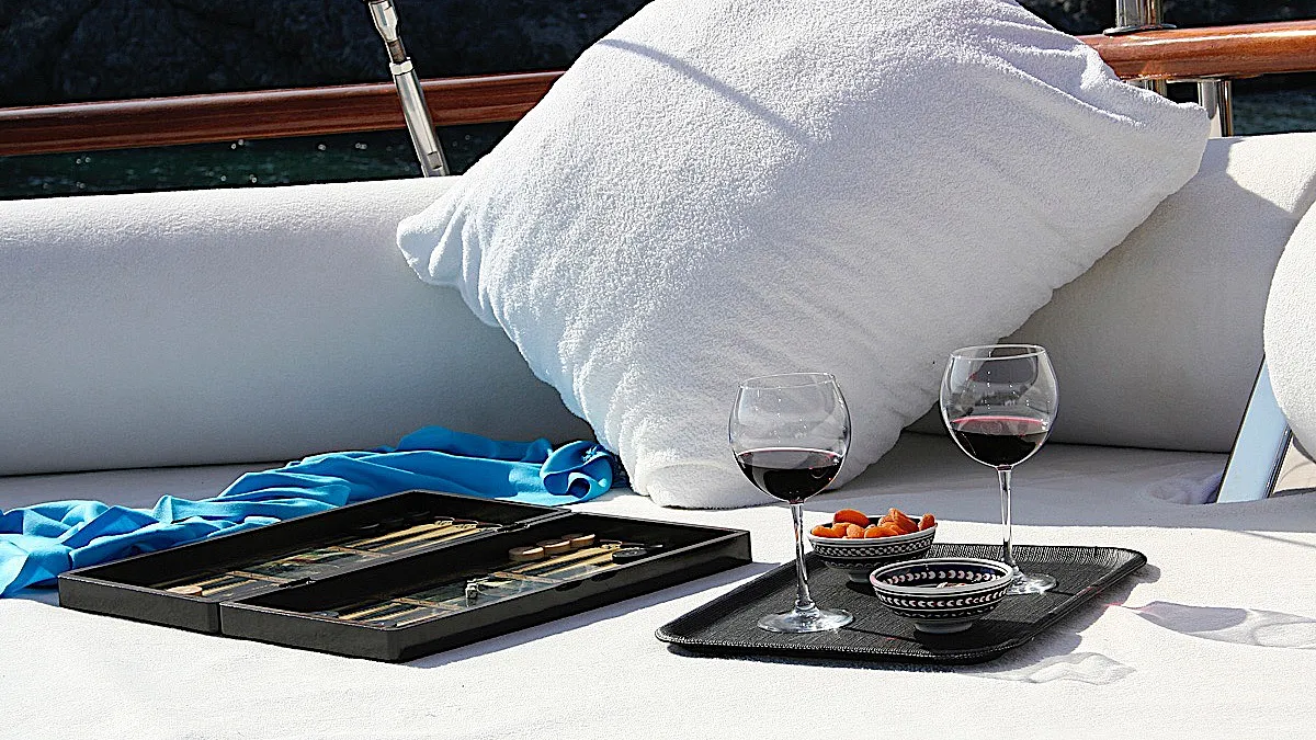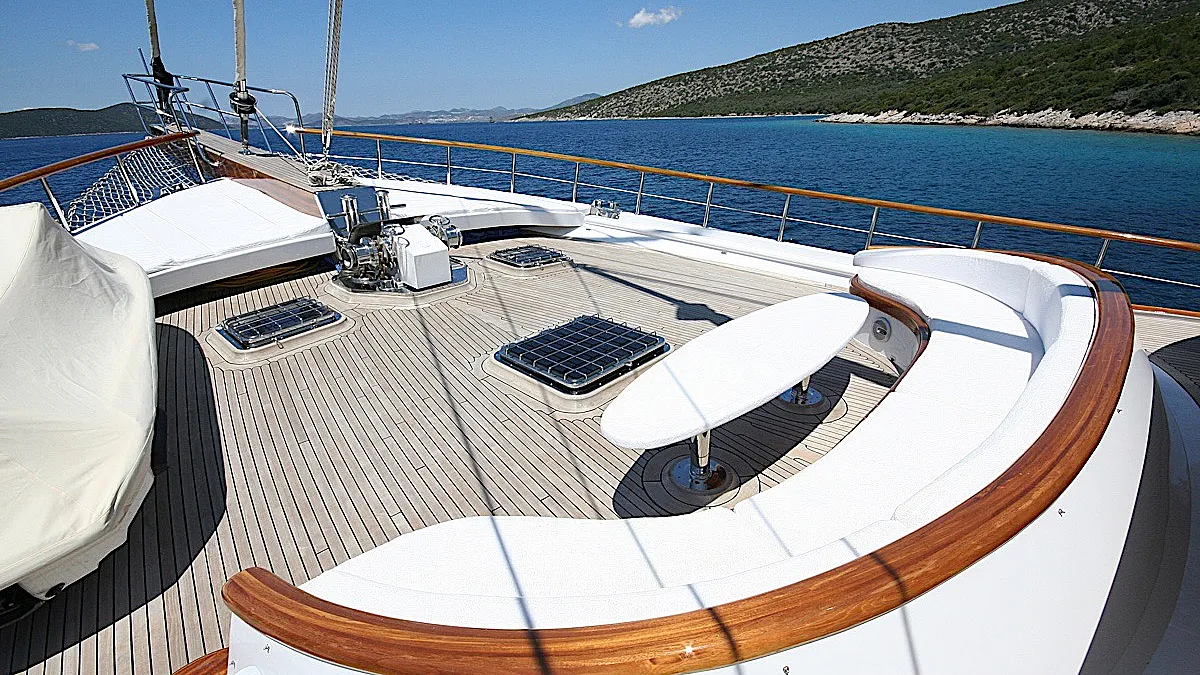 One more fantastic feature of CANER IV is her forward deck with comfortable sun-loungers for 12 guests and sitting area with a table for relaxing cocktail hours and five o’clock tea ceremonies.