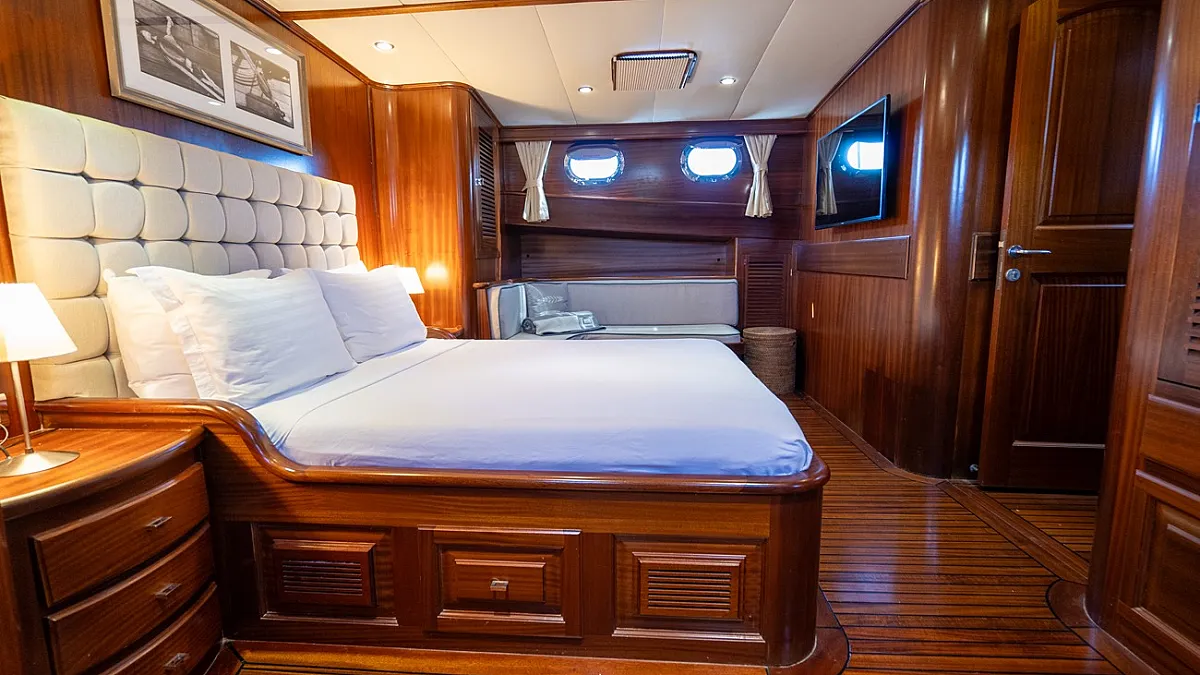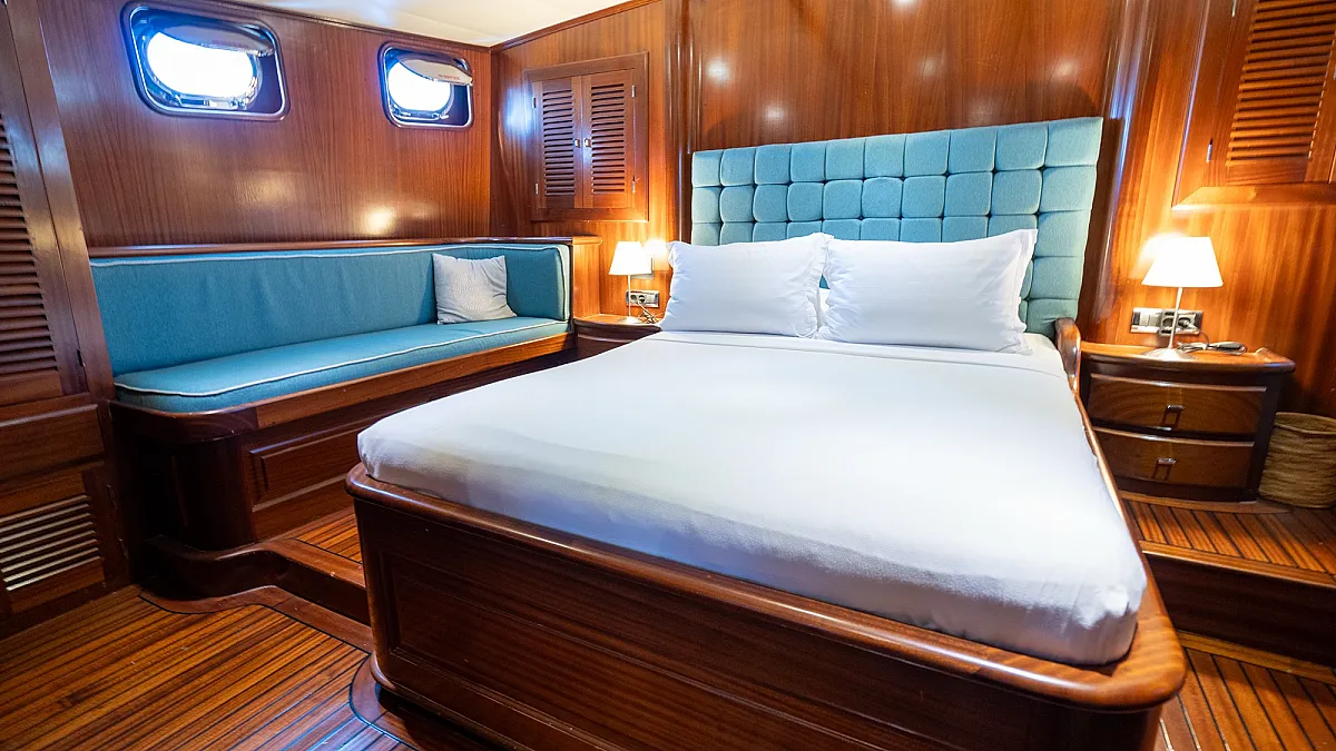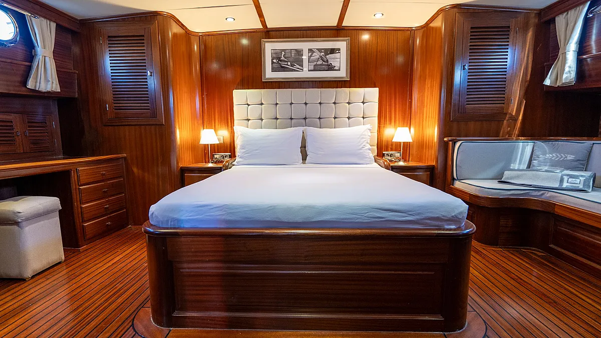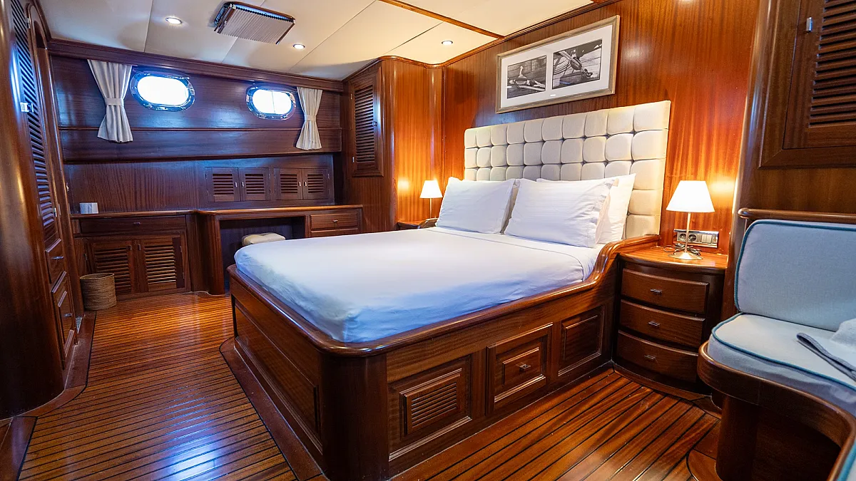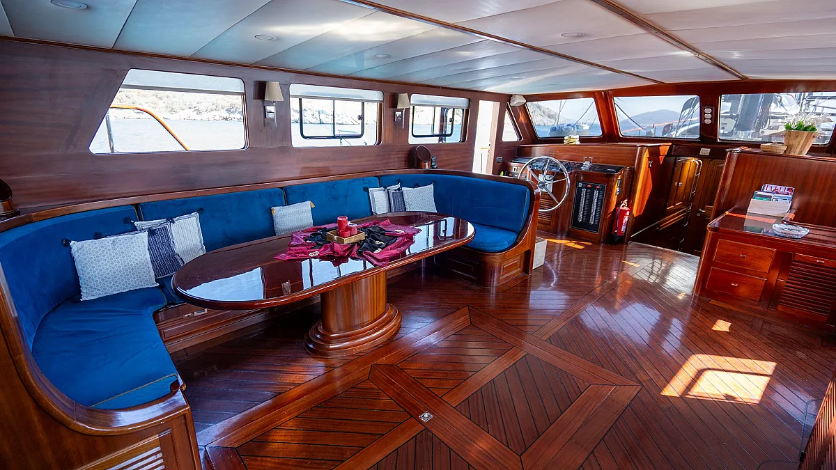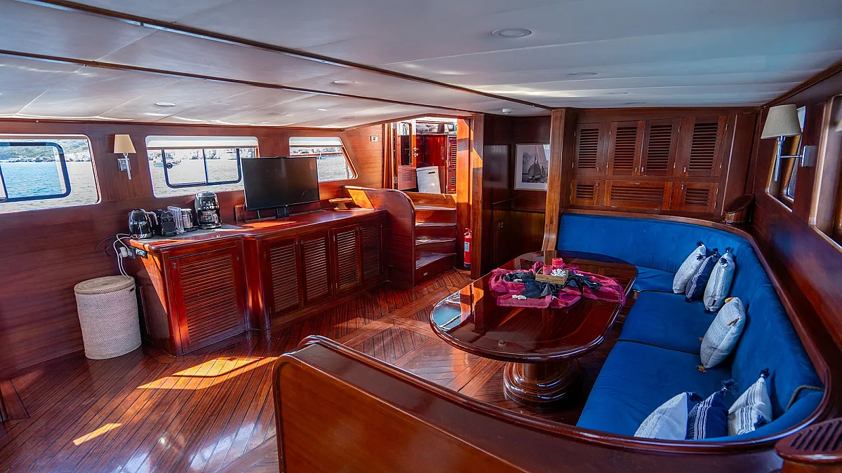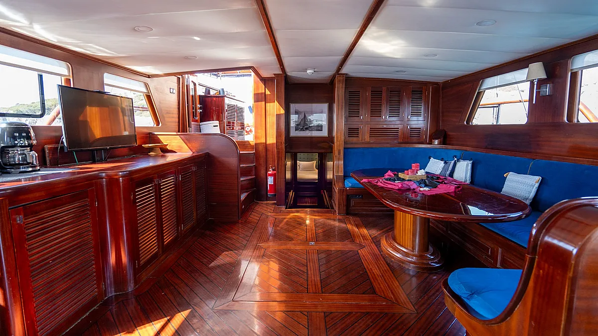 Guests will enjoy the modern, wooden interior of the yacht which creates a feeling of being in a cozy summer villa, one surrounded by the turquoise, emerald, and blue waters of the sea.