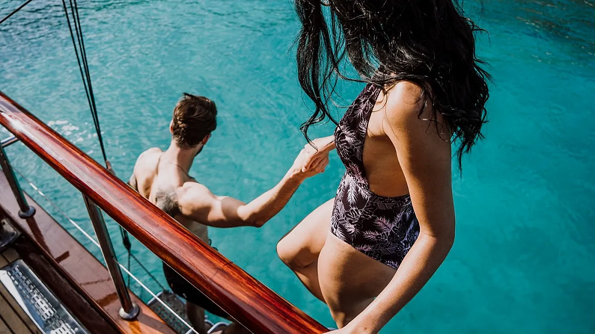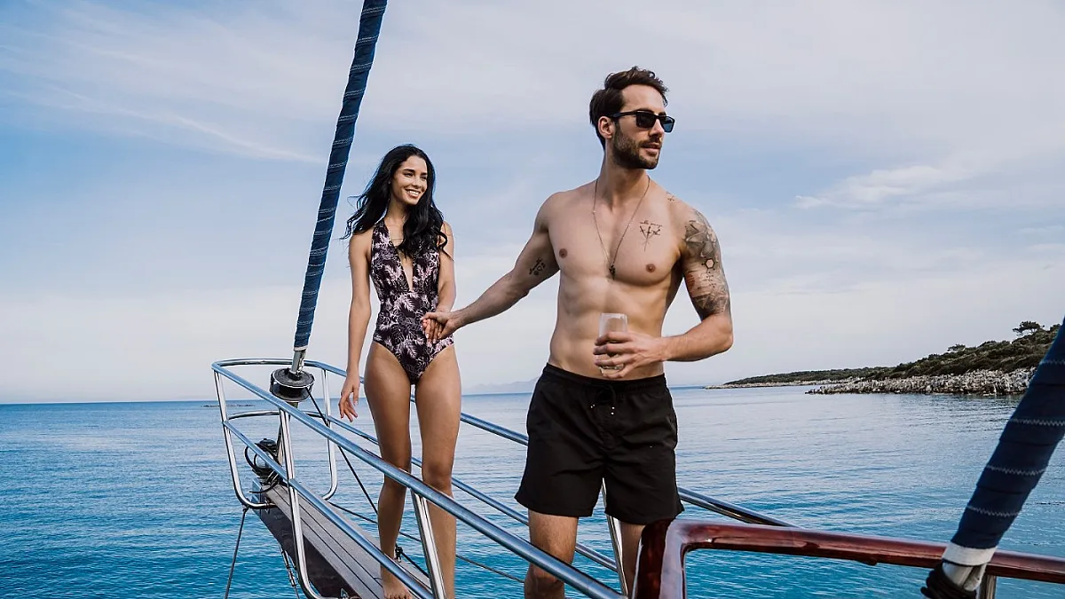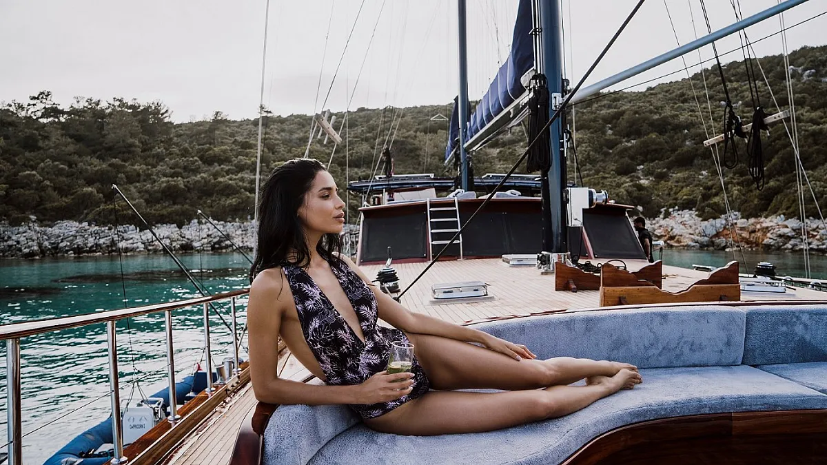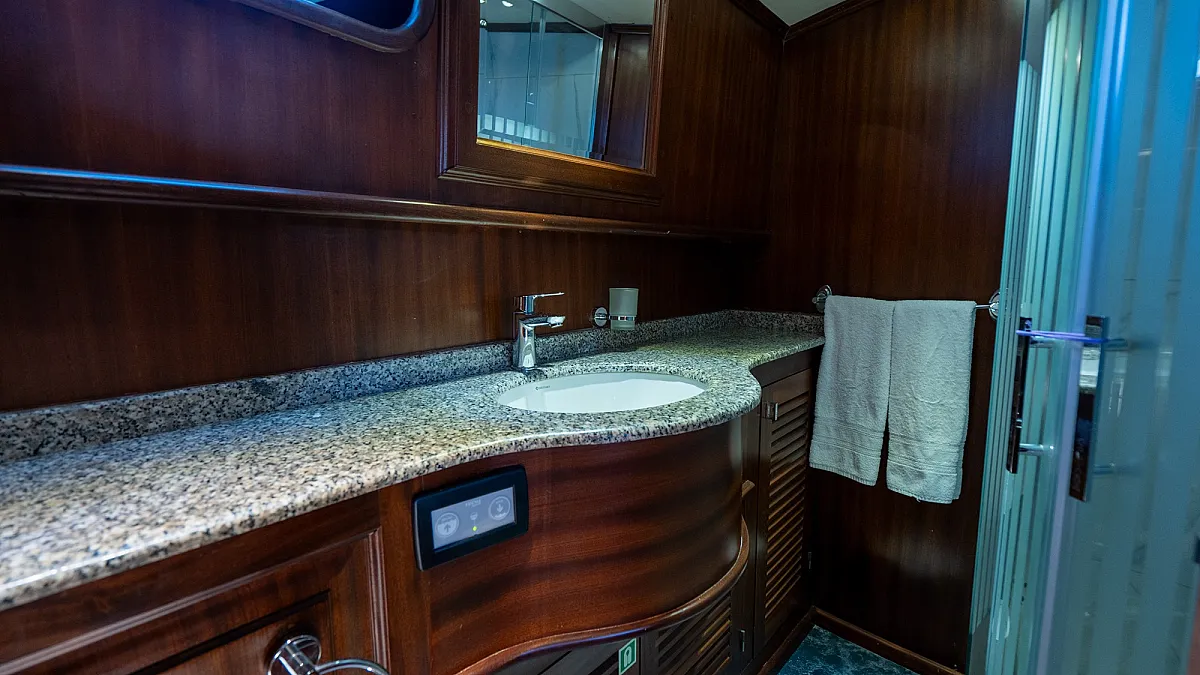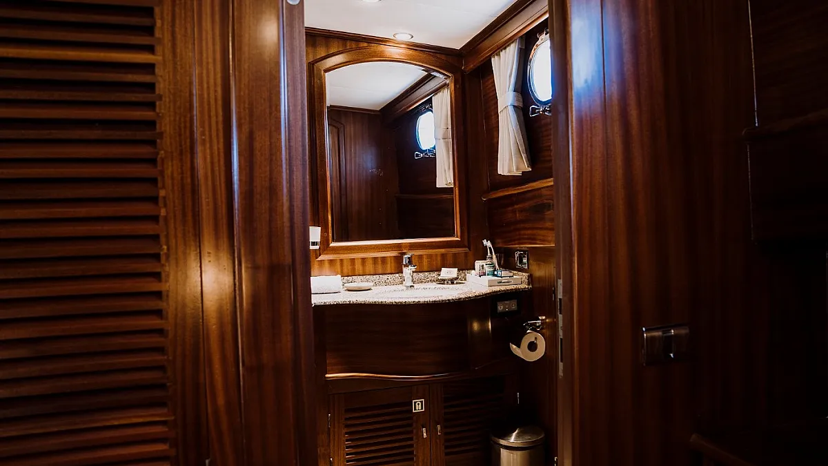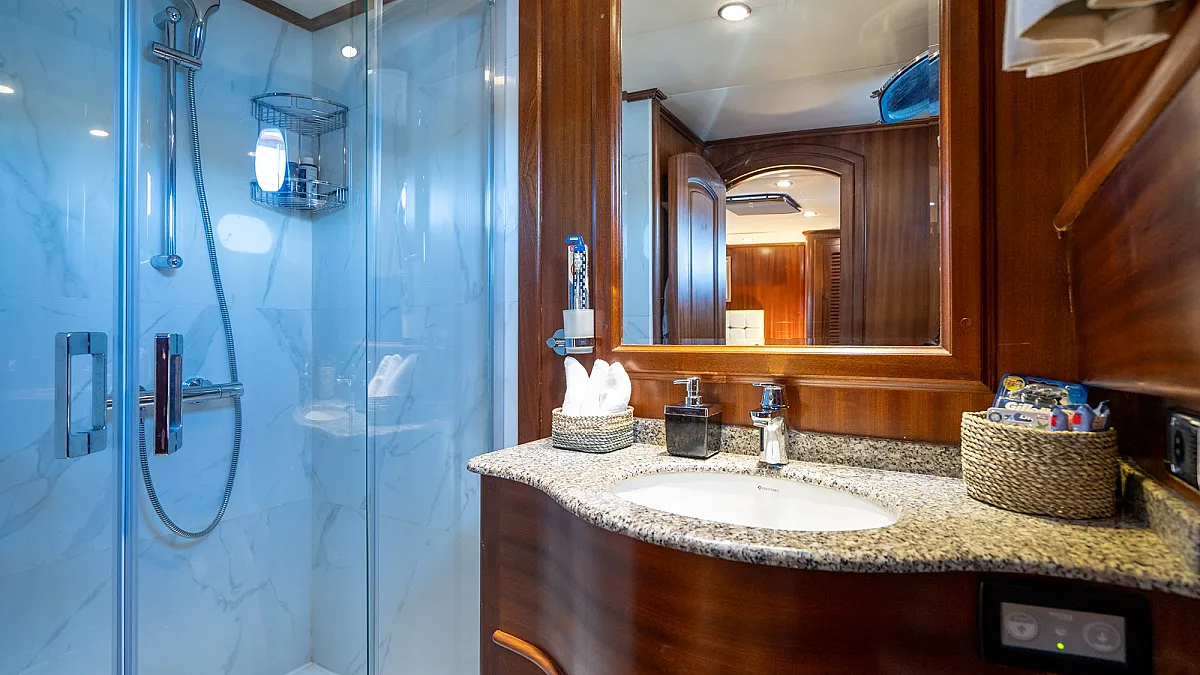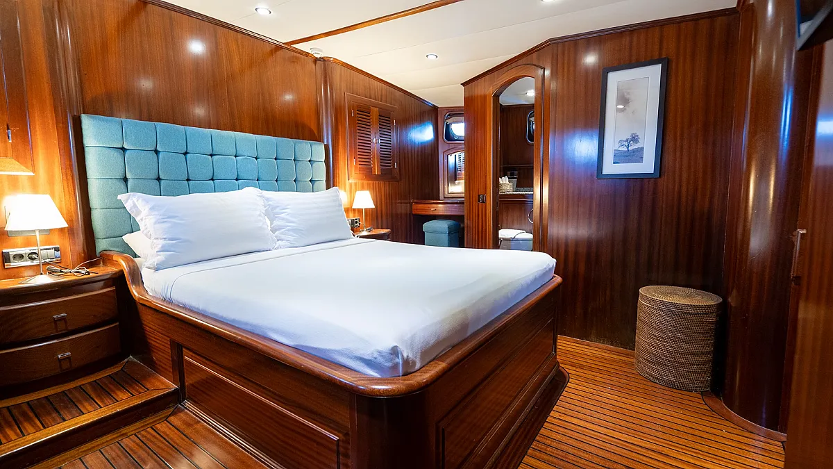 Guests will enjoy the modern, wooden interior of the yacht which creates a feeling of being in a cozy summer villa, one surrounded by the turquoise, emerald, and blue waters of the sea.