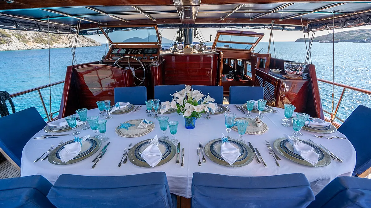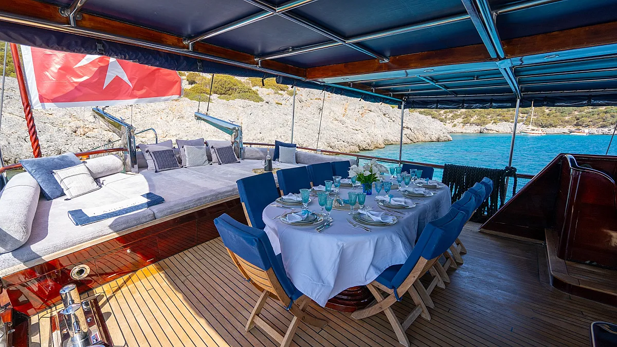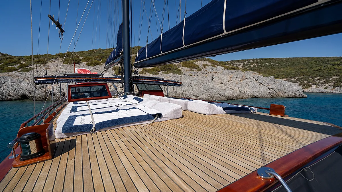 Al fresco meals are served on the aft deck around a large dining table and guests are welcome to savor the relaxing mood on comfortable oversized cushions set around the aft. On the forward deck, there is a spacious sunning area where guests are invited to spread out and enjoy the warm rays of the Aegean sun.