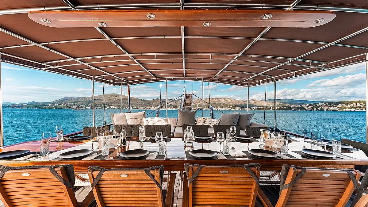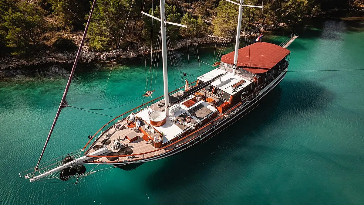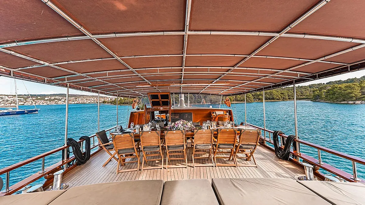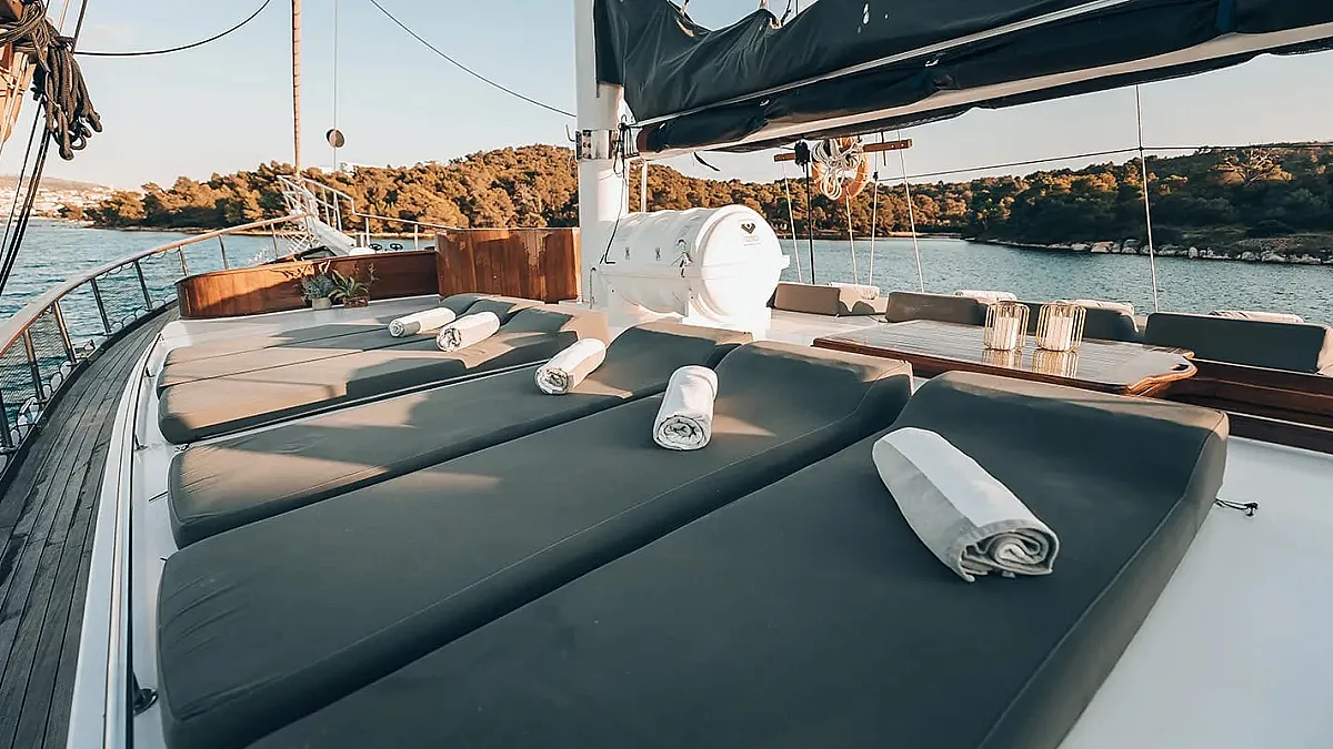 Charter rates include VAT, accommodation (maximum number of 14 guests sleeping in 7 cabins), fuel for cruising (4 hours/day), crew - 5 members (Captain, Chef, Deckhand, Waiter, Housekeeper), A/C -12 hours/day till midnight (while the yacht is out of port), linen (bed sheets, bathroom, and beach towels), Wifi