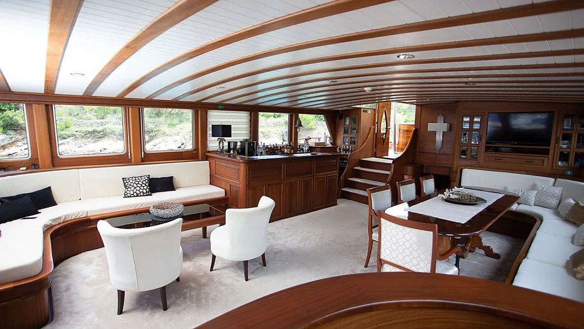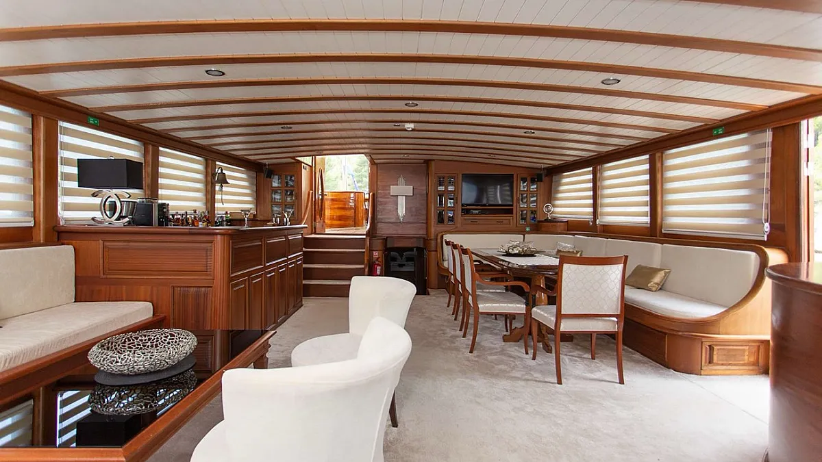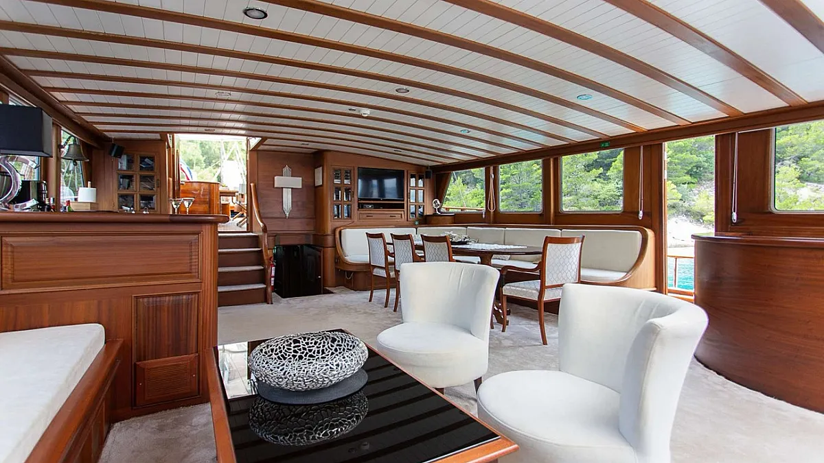 Gulet DOLCE VITA's deck saloon has a wonderful lounging area that is attractively furnished in pale creams and high-gloss mahogany. The area is fitted with an entertainment centre offering Satellite TV, DVD player, dining table and full service bar.