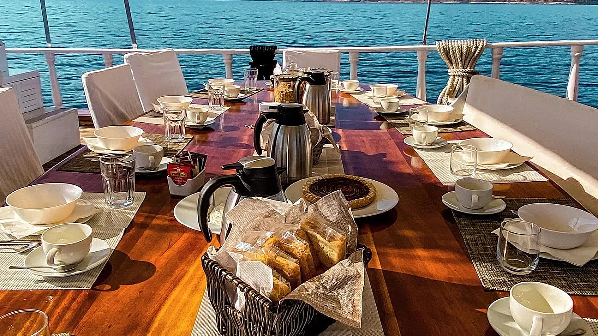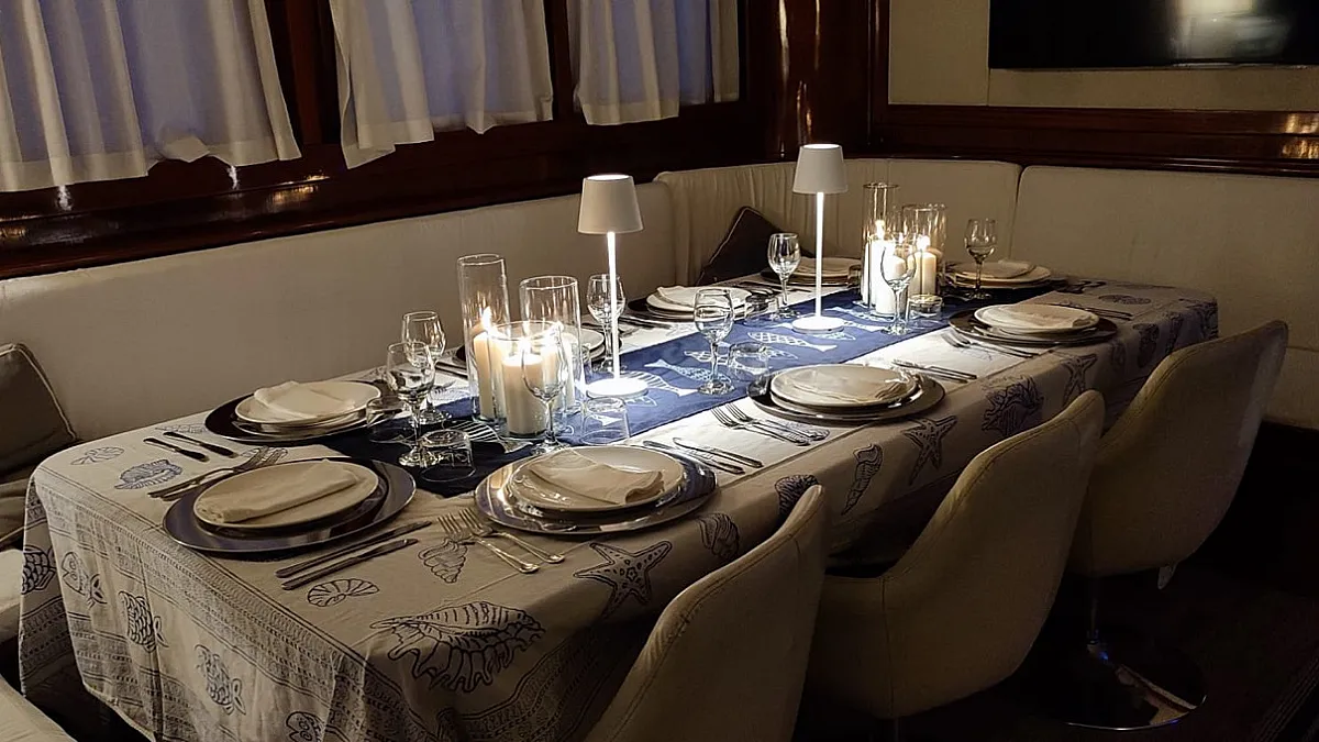 Food (to be paid upon embarkation or with balance payment): Half Board mandatory (7 breakfasts, 6 lunches, 1 dinner) €420guest/week, Full Board (2 dinners excluded 7 breakfasts, 6 lunches, 5 dinners) €550/guest/week. Children 0-2 years old free of charge, 3-10 years old 50%. Food packages do not include special food (i.e lobster, and they are at extra cost).