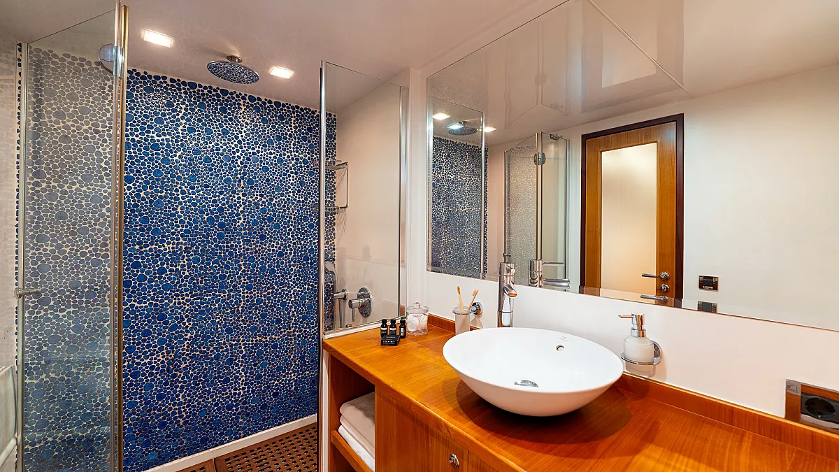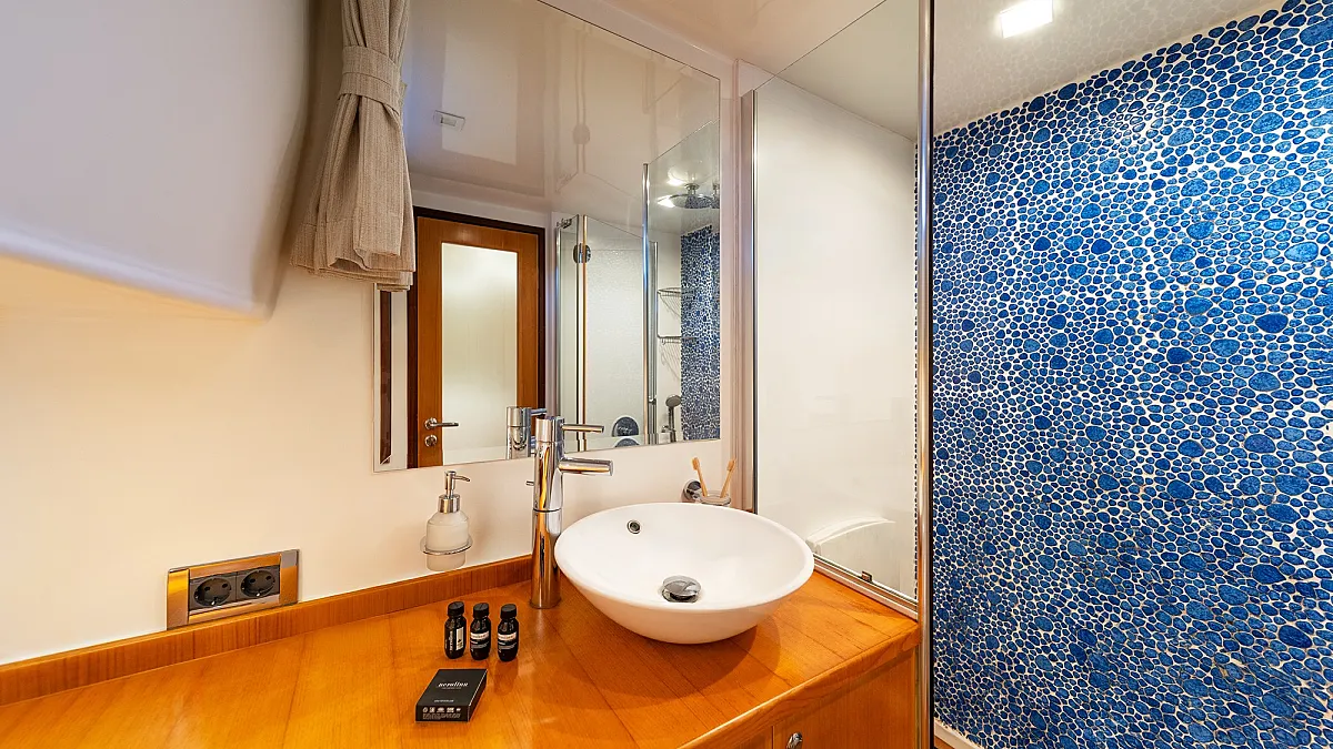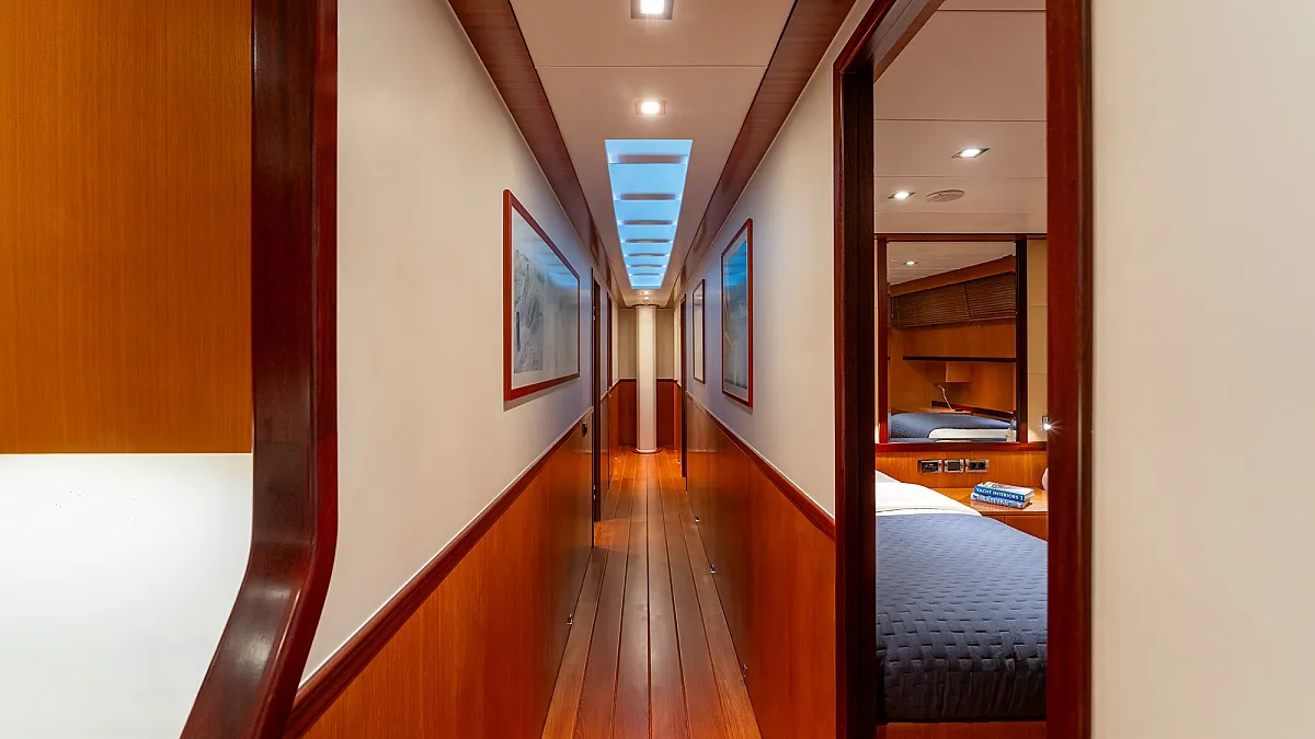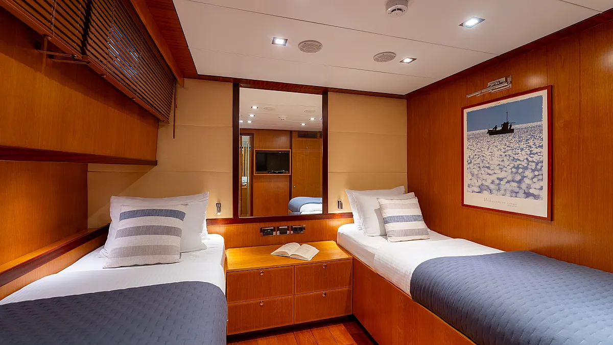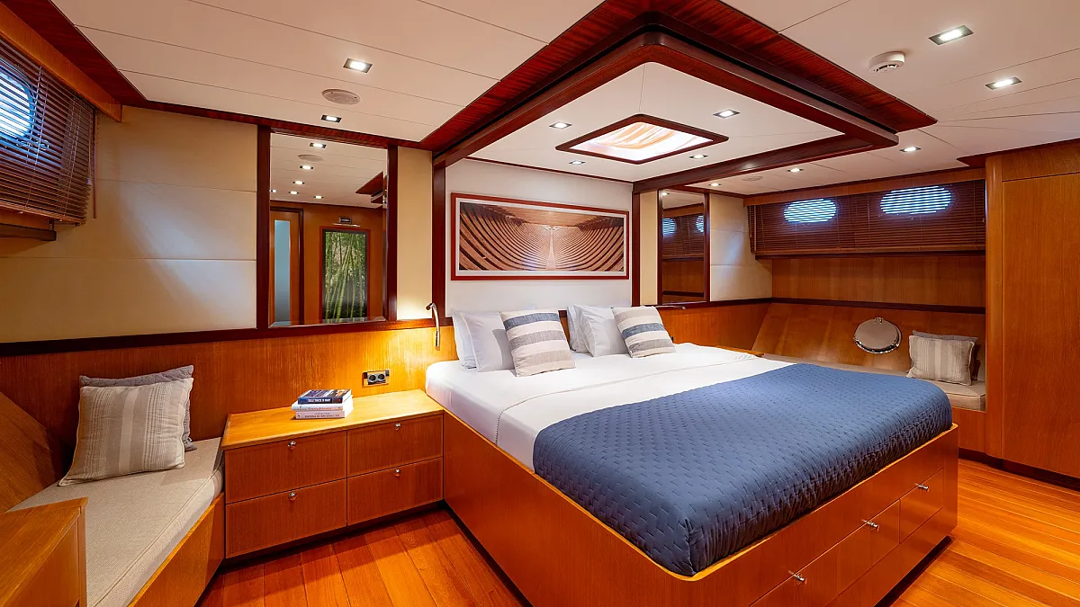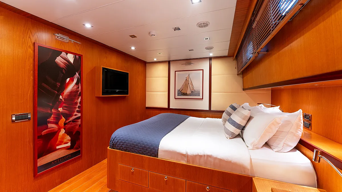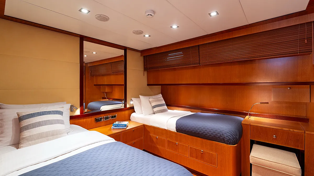 1 forward master cabin with king size bed, 1 port VIP cabin with queen size bed, 2 starboard equal sized twin cabins adjustable to king size beds.