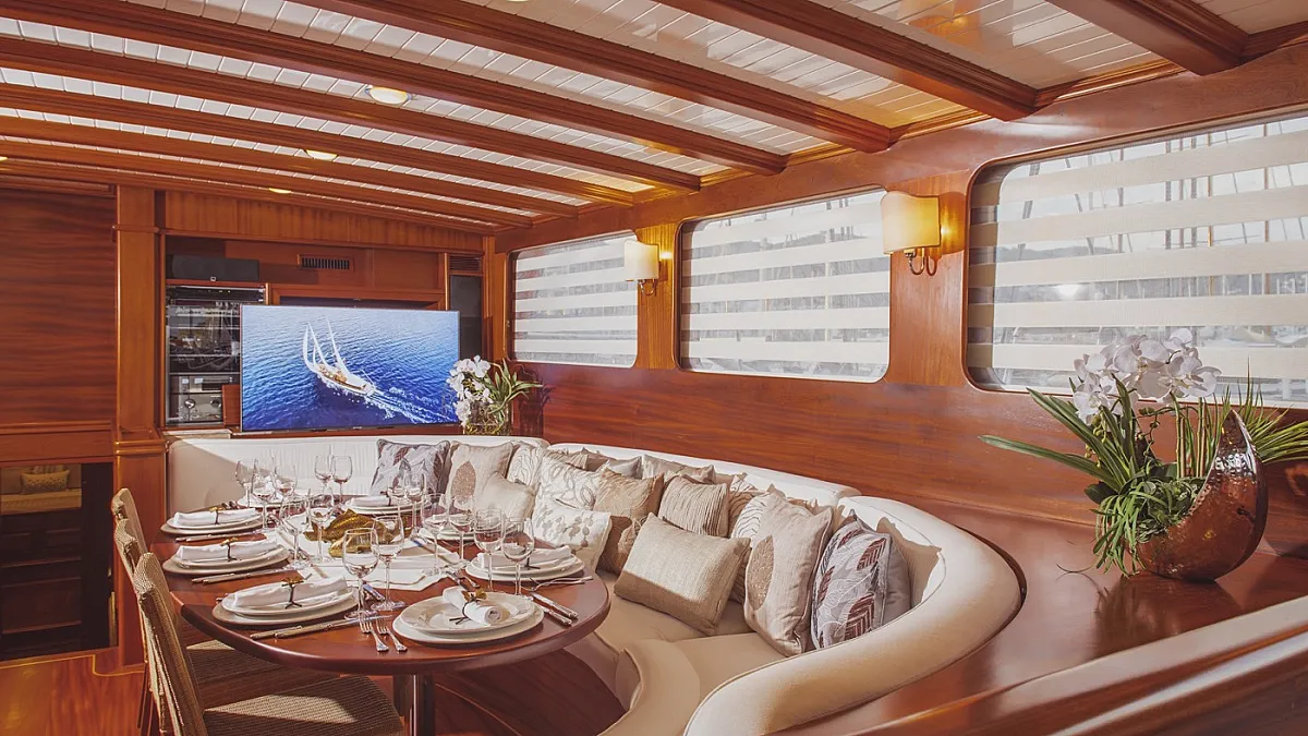 HIC SALTA's deck lounge features a bar, library, TV, home theatre system, and an audio corner. There is space here for dining indoors, although most of the activities take place on the deck and especially around the shaded aft deck, fitted with comfortable lounging area behind a partially-enclosed dining area which was designed in order to offers guests additional privacy while dining in port.
