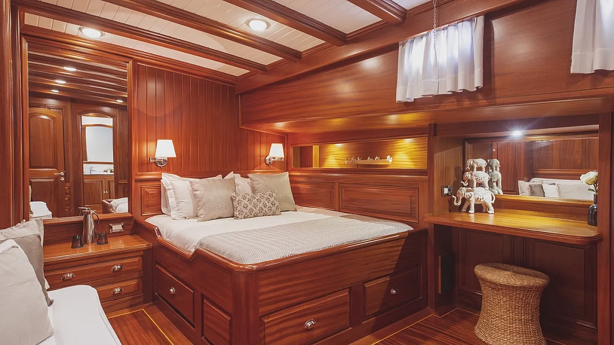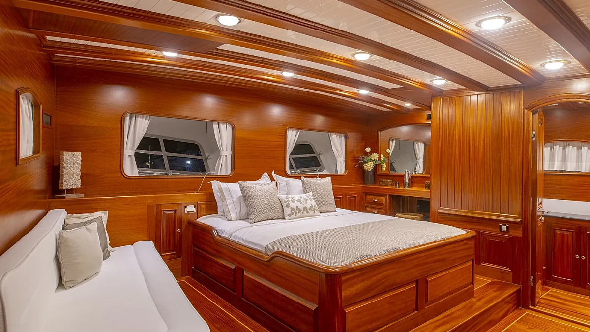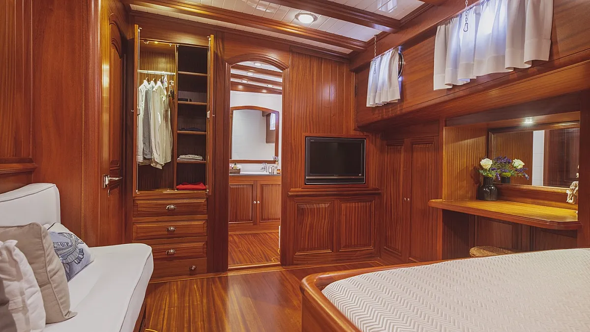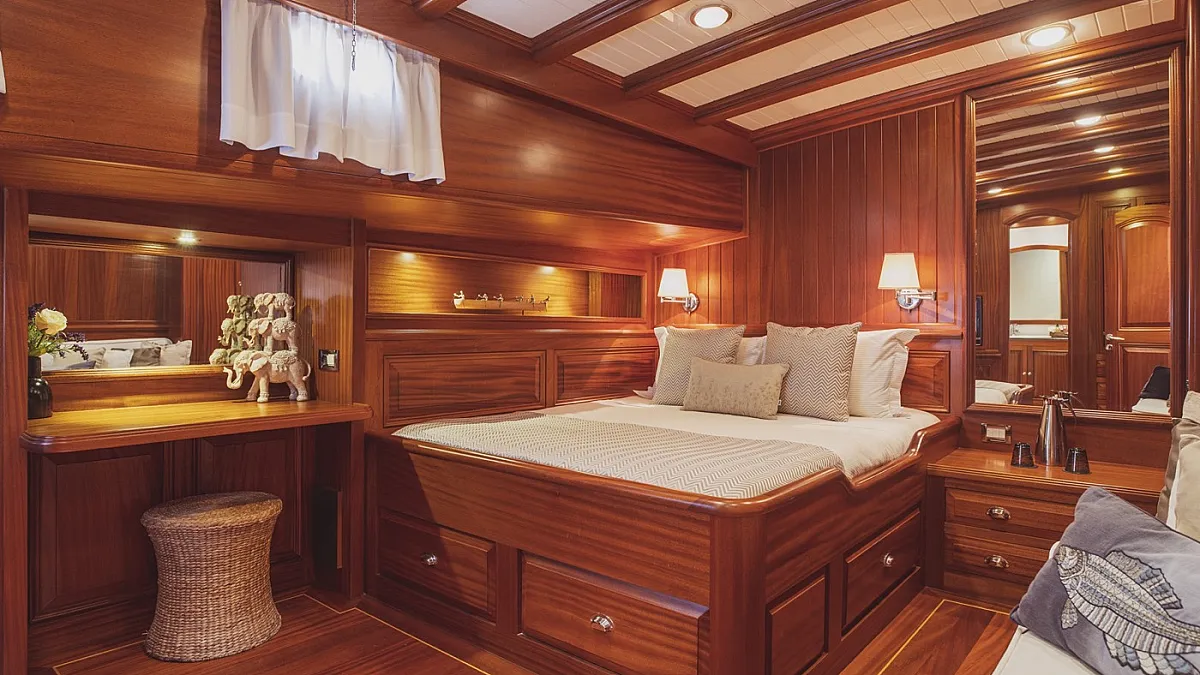 HIC SALTA offers stylish accommodation for up to 10 guests in 3 double and 2 twin ensuite cabins. All cabins are beautifully appointed with paneled mahogany joinery and doors. Each cabin is served by individually controlled air conditioning and heating. The gulet is also capable of carrying up to 7 crew to ensure a relaxed, and very luxurious charter experience.