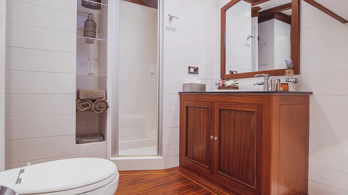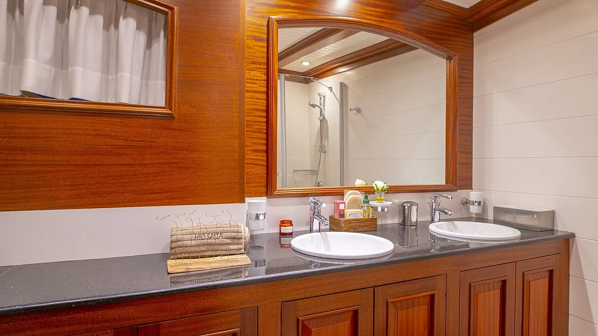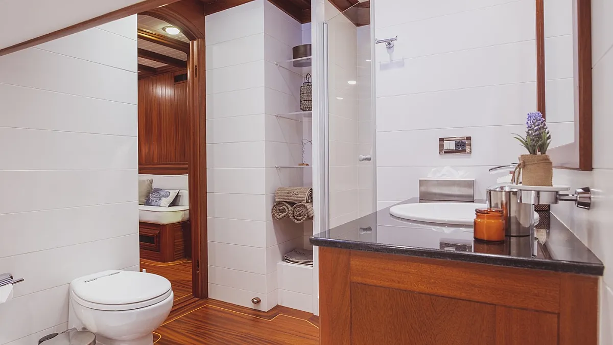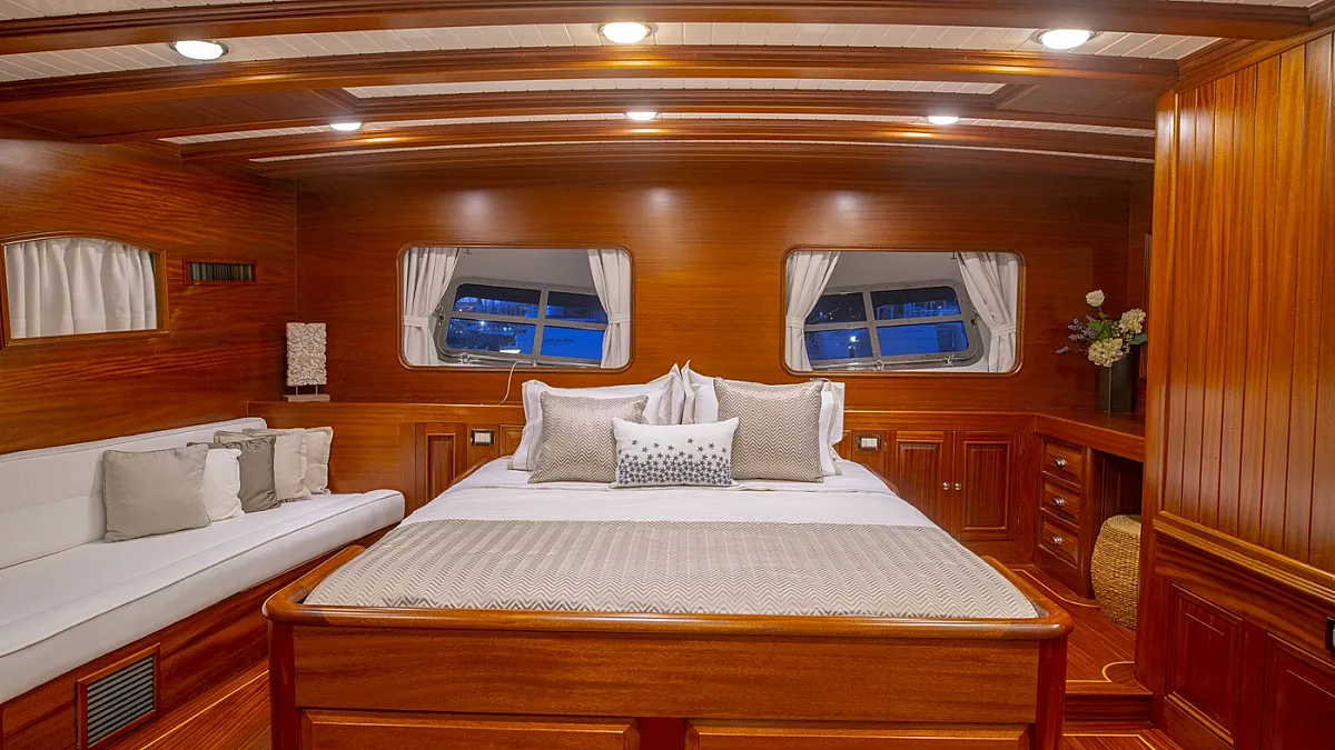 HIC SALTA offers stylish accommodation for up to 10 guests in 3 double and 2 twin ensuite cabins. All cabins are beautifully appointed with paneled mahogany joinery and doors. Each cabin is served by individually controlled air conditioning and heating. The gulet is also capable of carrying up to 7 crew to ensure a relaxed, and very luxurious charter experience.