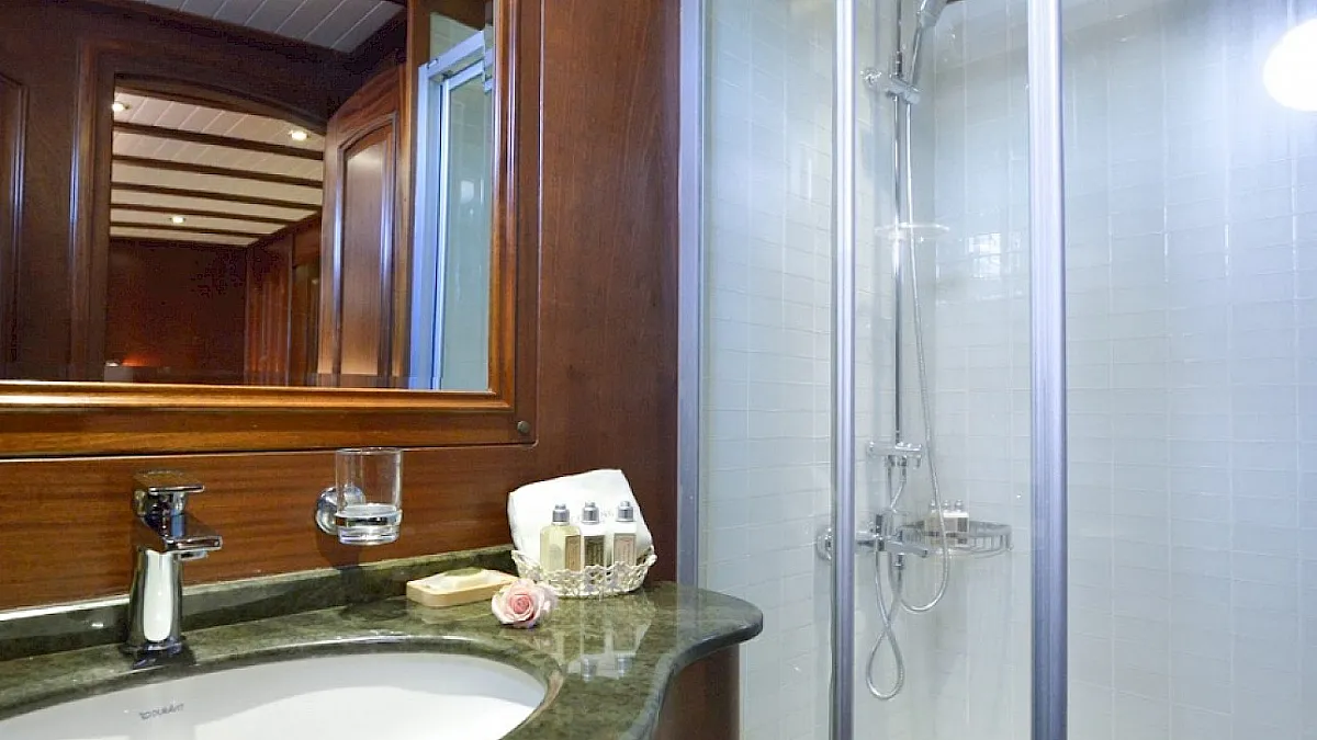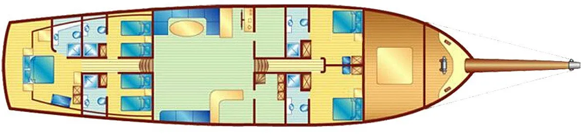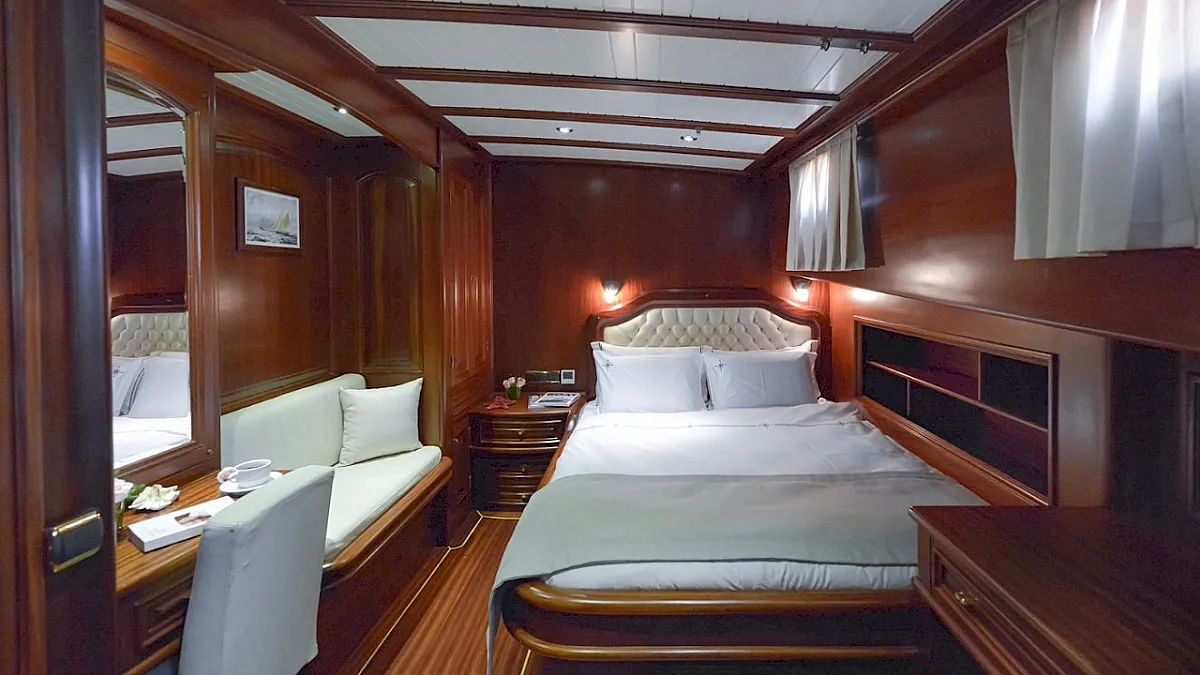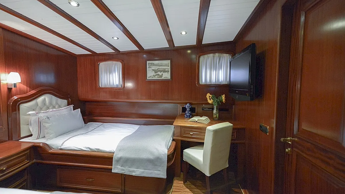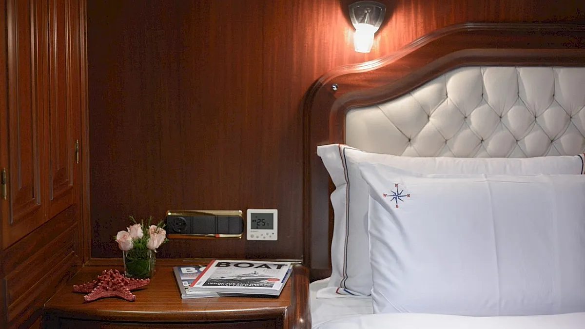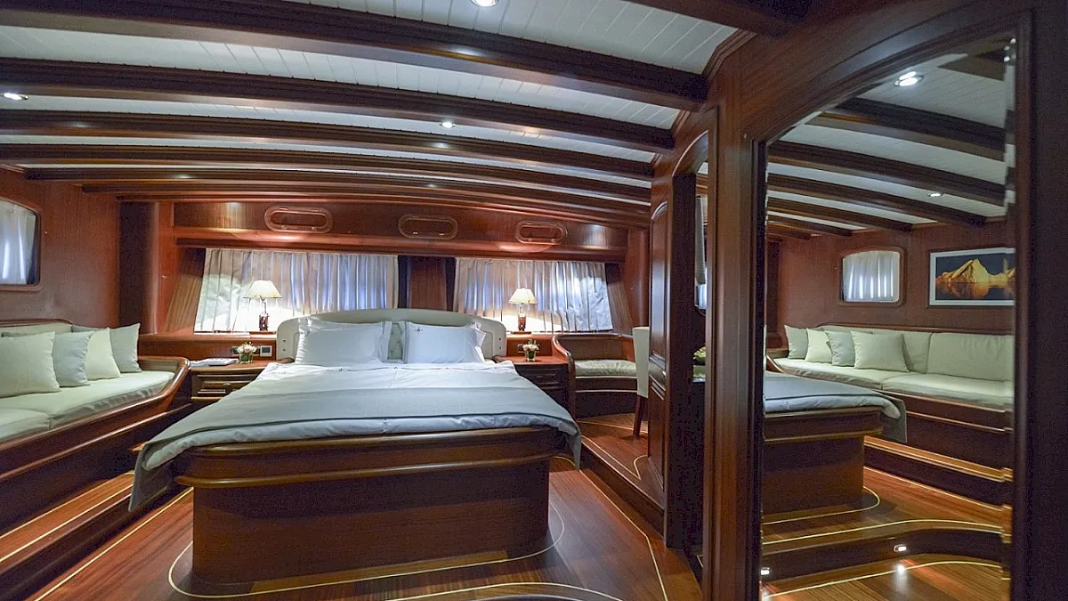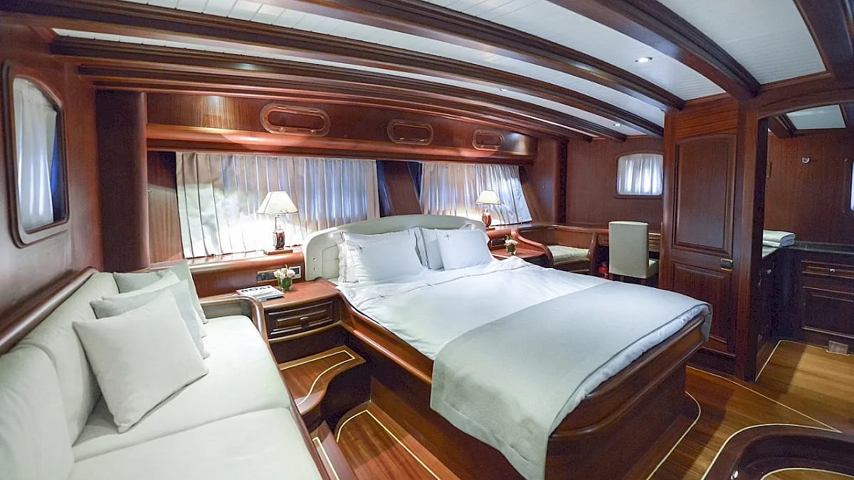 The yacht offers comfortable accommodation for 10 people. There are 5 cabins in total, each featuring private ensuite facilities, AC, and entertainment system.