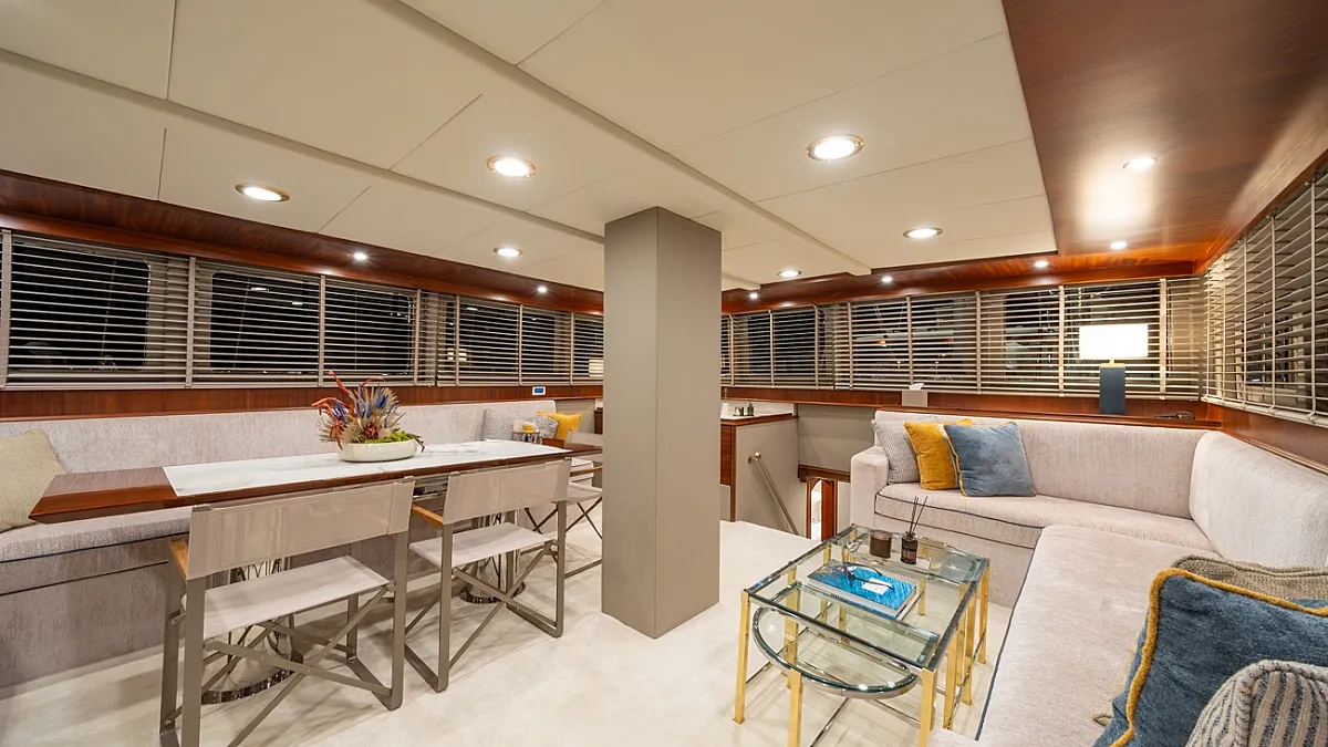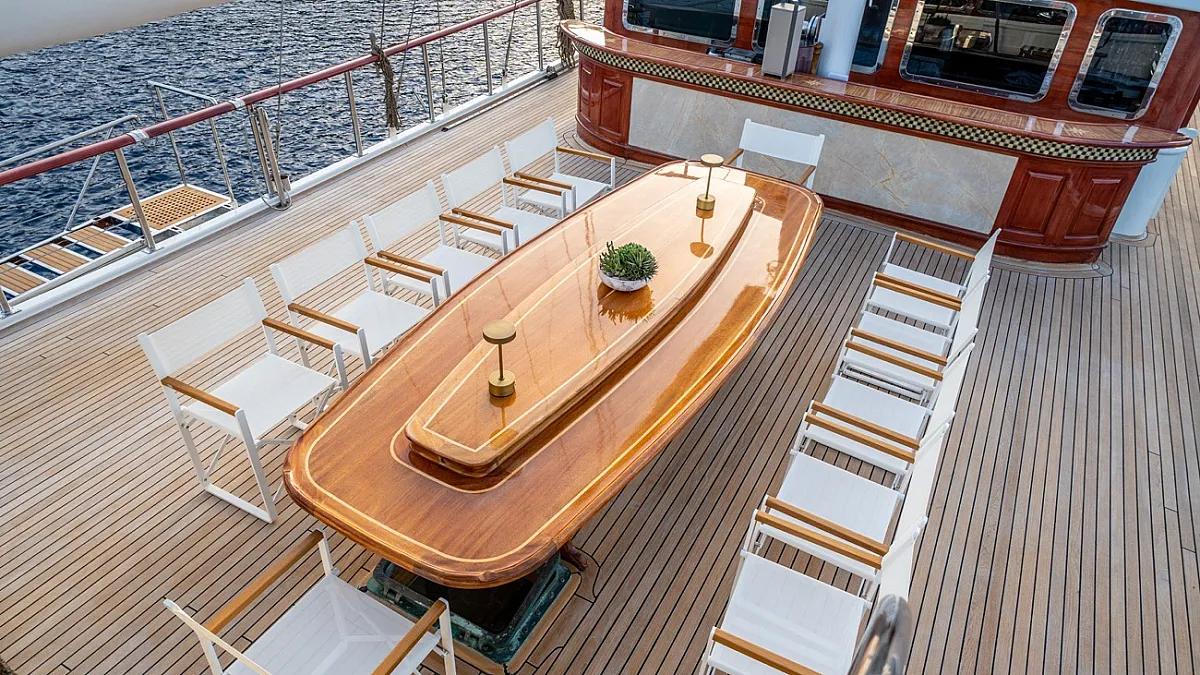 There is a wonderful feature on deck: the dining area amidships, which can be shaded by an awning by day and open to the skies above at night.