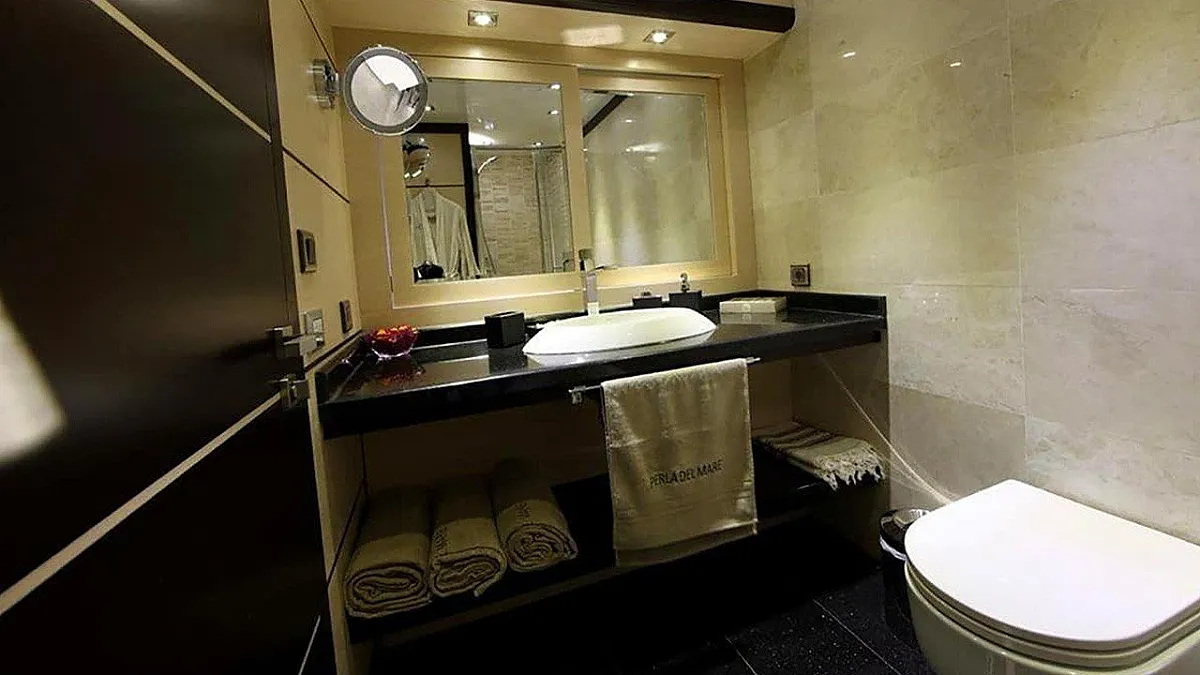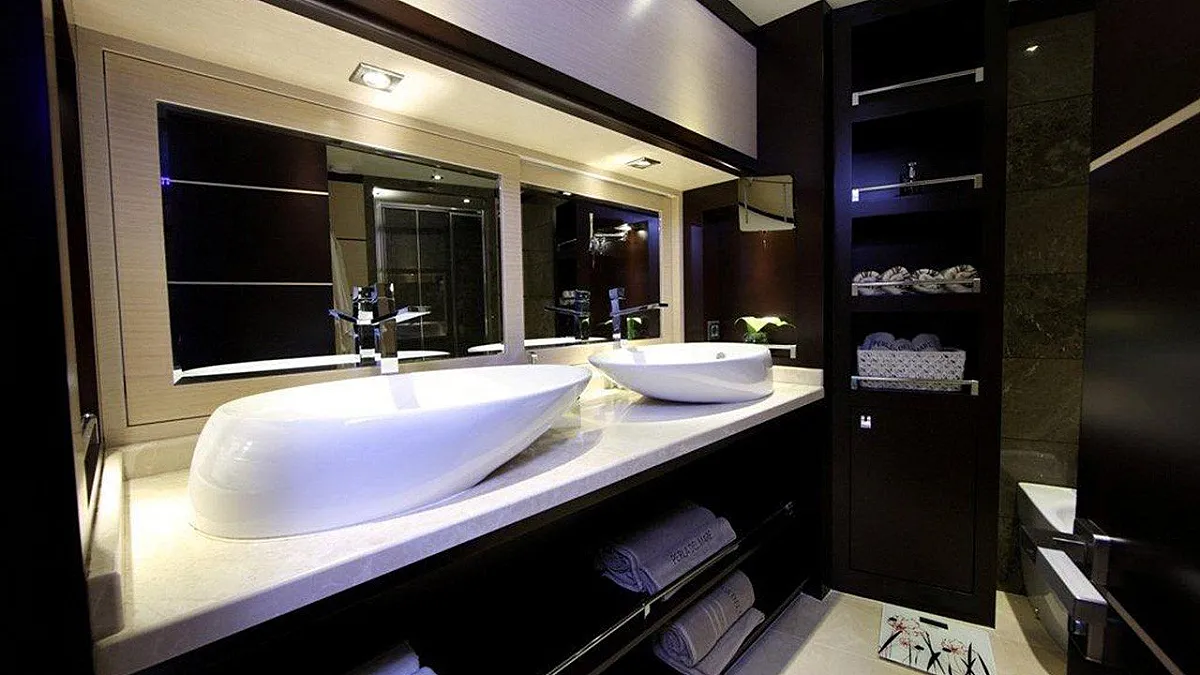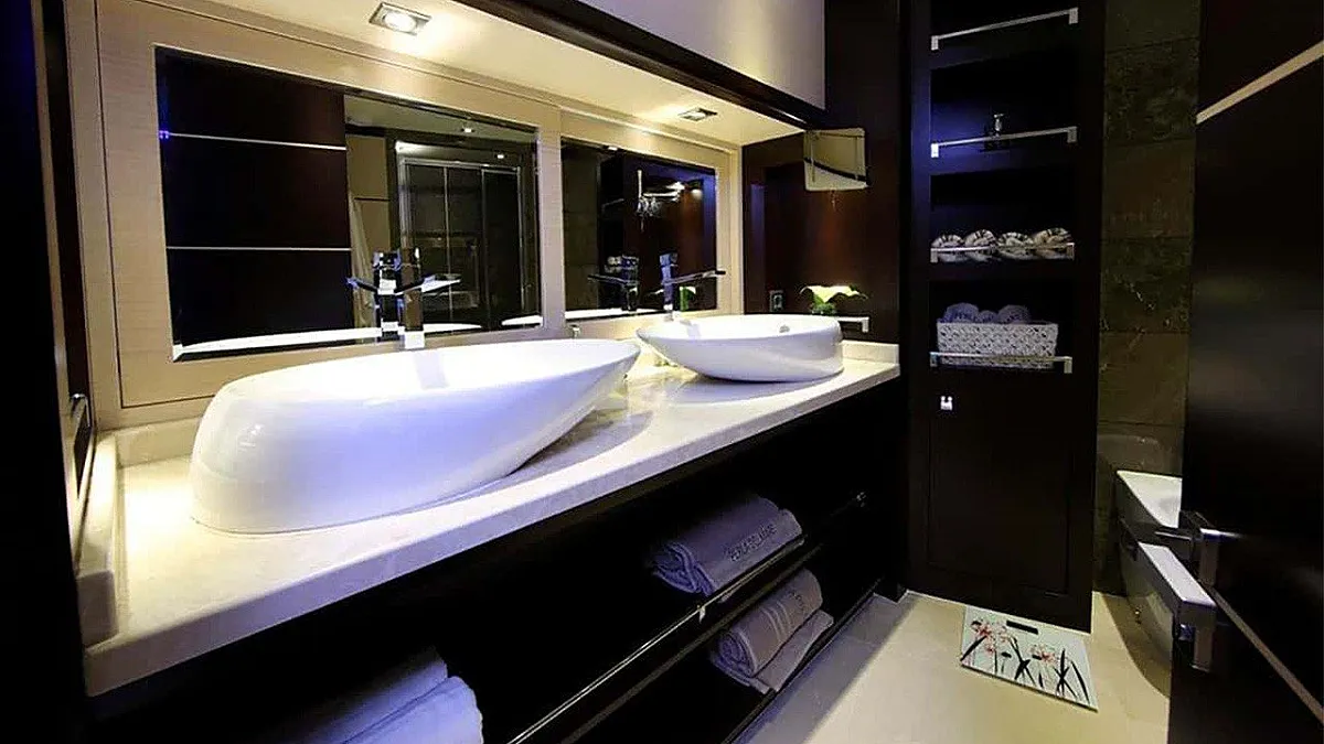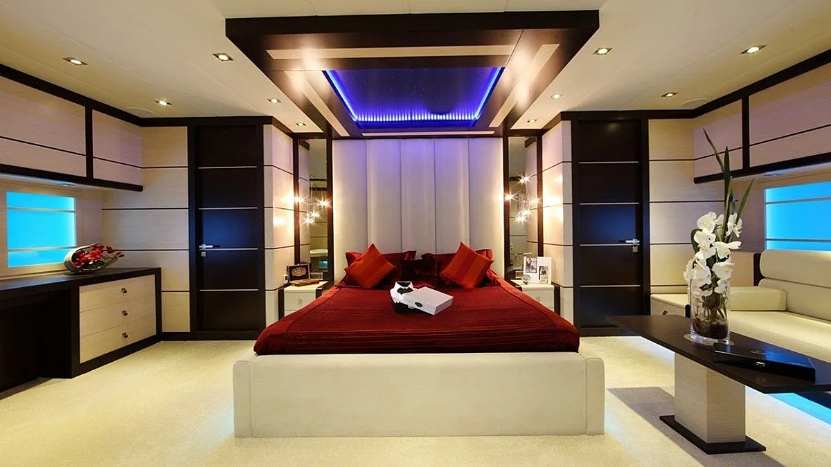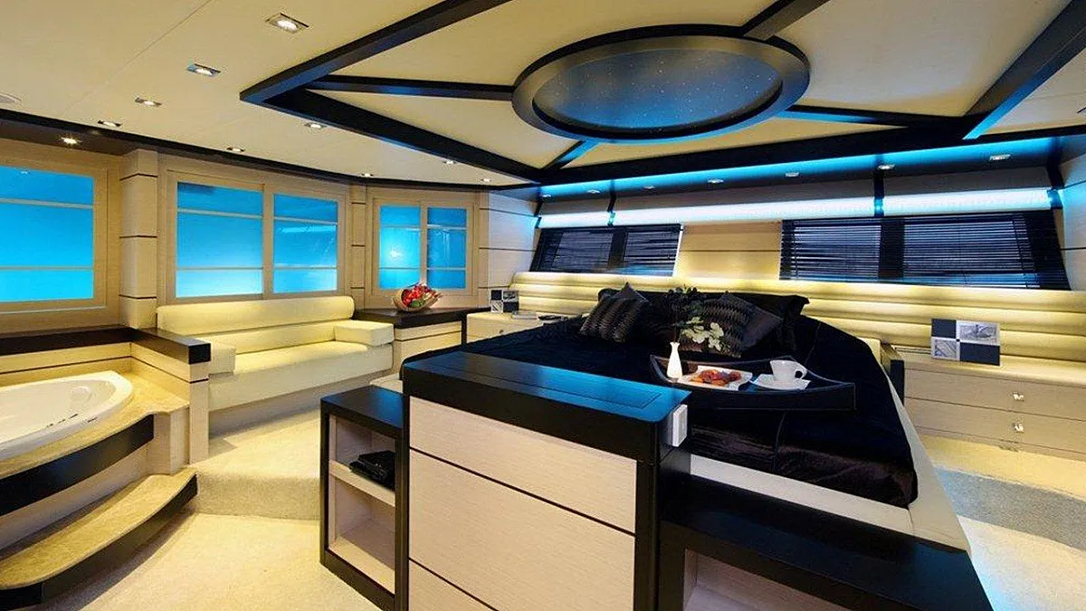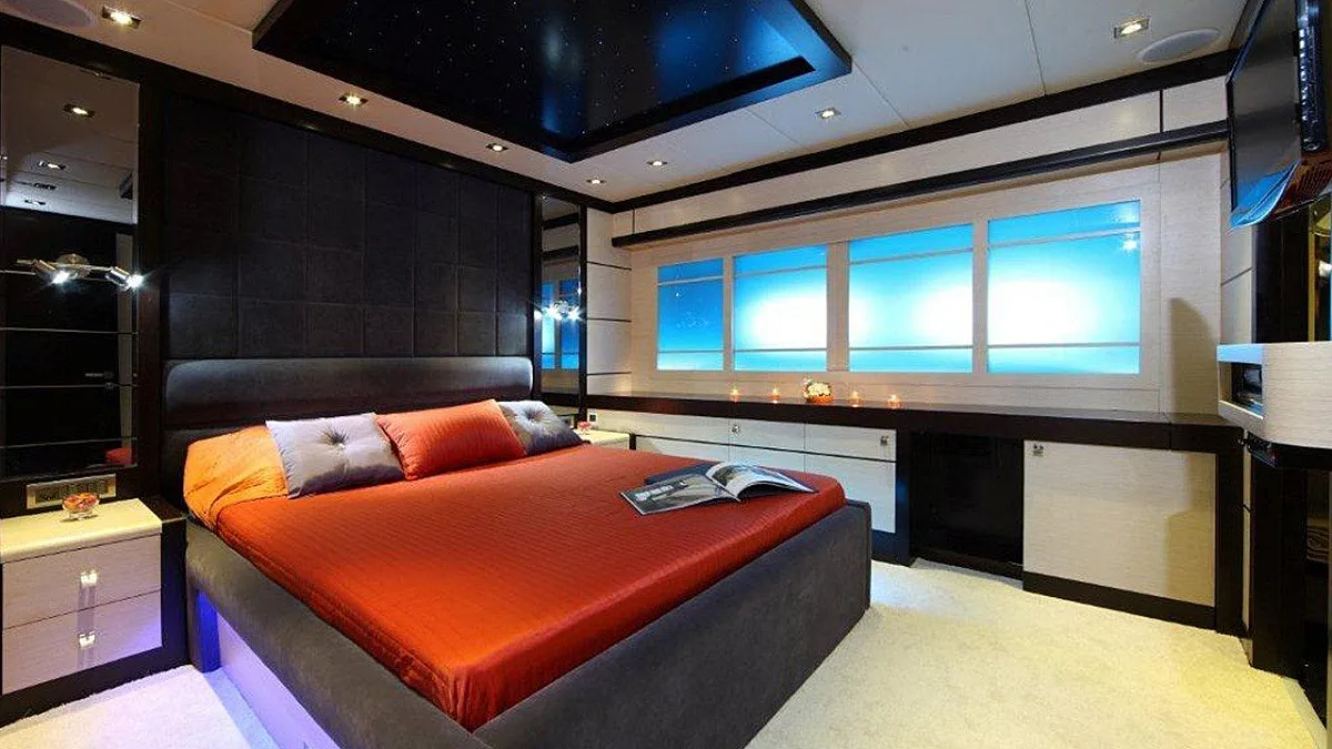1 * Forward Master Cabin, 1 * Aft Master Cabin Two very large and ensuite cabins with Jacuzzi and King Size Beds. One aft below deck, other forward main deck. Forward Master Cabin has separate clothing room in cabin.