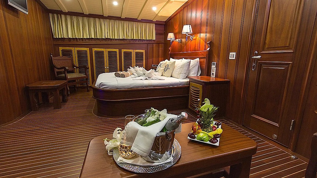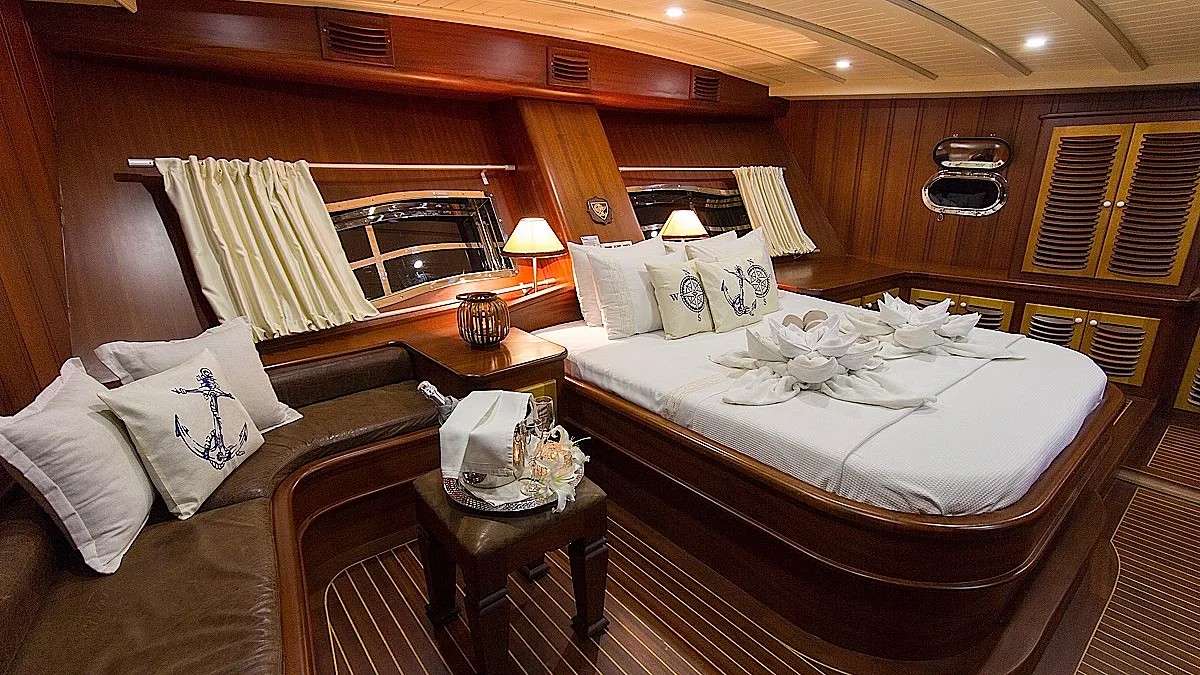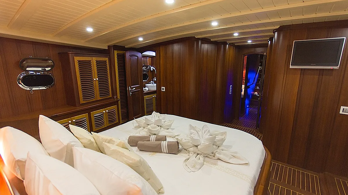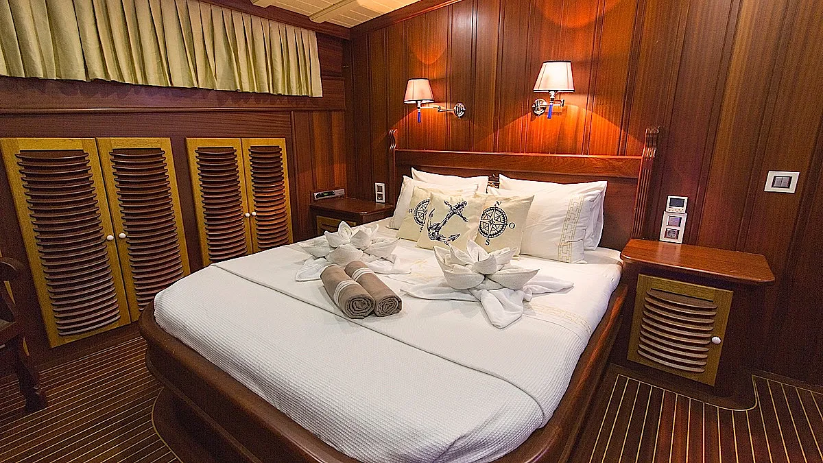 PRINCESS KARIA II's air-conditioned accommodation is in six cabins. Two of these cabins are extra roomy master cabins, each with their own entertainment systems and large en suites – one of which is fitted with a Jacuzzi tub. There are two double cabins and two twin cabins – all of which are of a good size, have a roomy en suite bathroom, opening portholes, an entertainment systems and storage space aplenty.