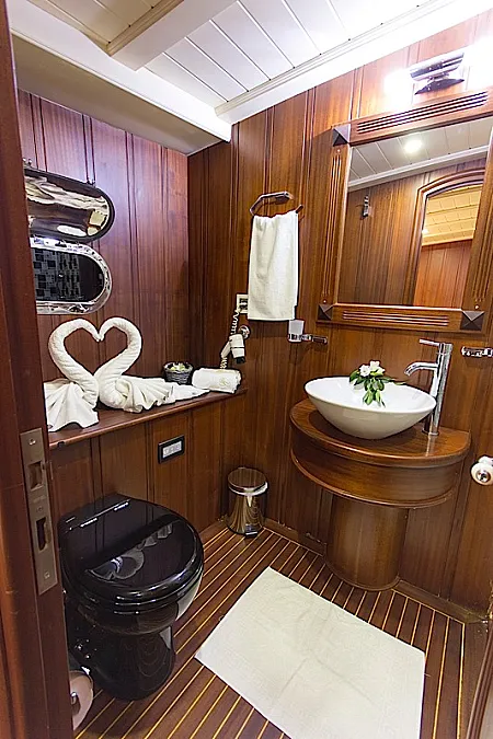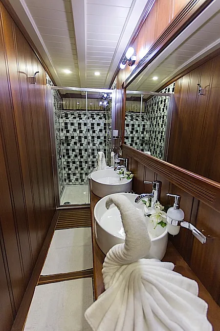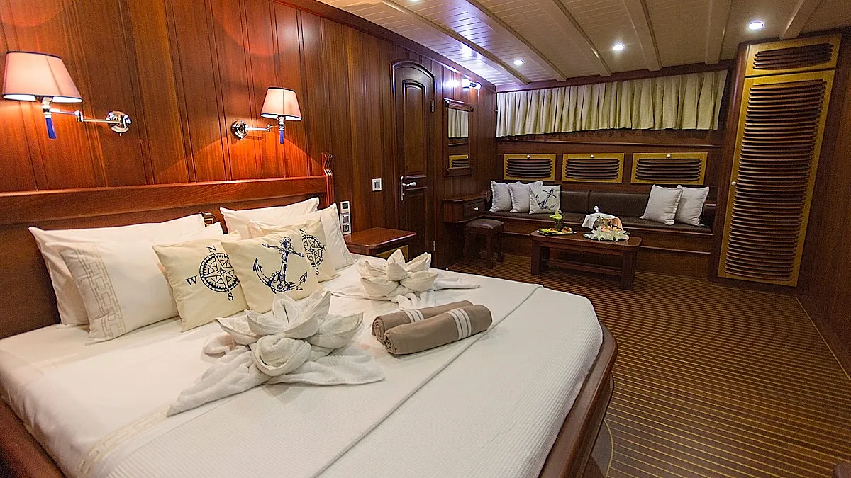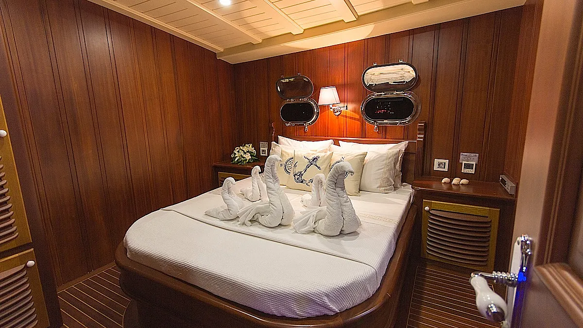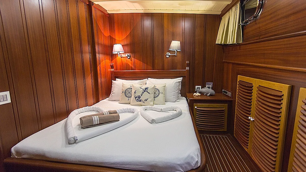 PRINCESS KARIA II's air-conditioned accommodation is in six cabins. Two of these cabins are extra roomy master cabins, each with their own entertainment systems and large en suites – one of which is fitted with a Jacuzzi tub. There are two double cabins and two twin cabins – all of which are of a good size, have a roomy en suite bathroom, opening portholes, an entertainment systems and storage space aplenty.