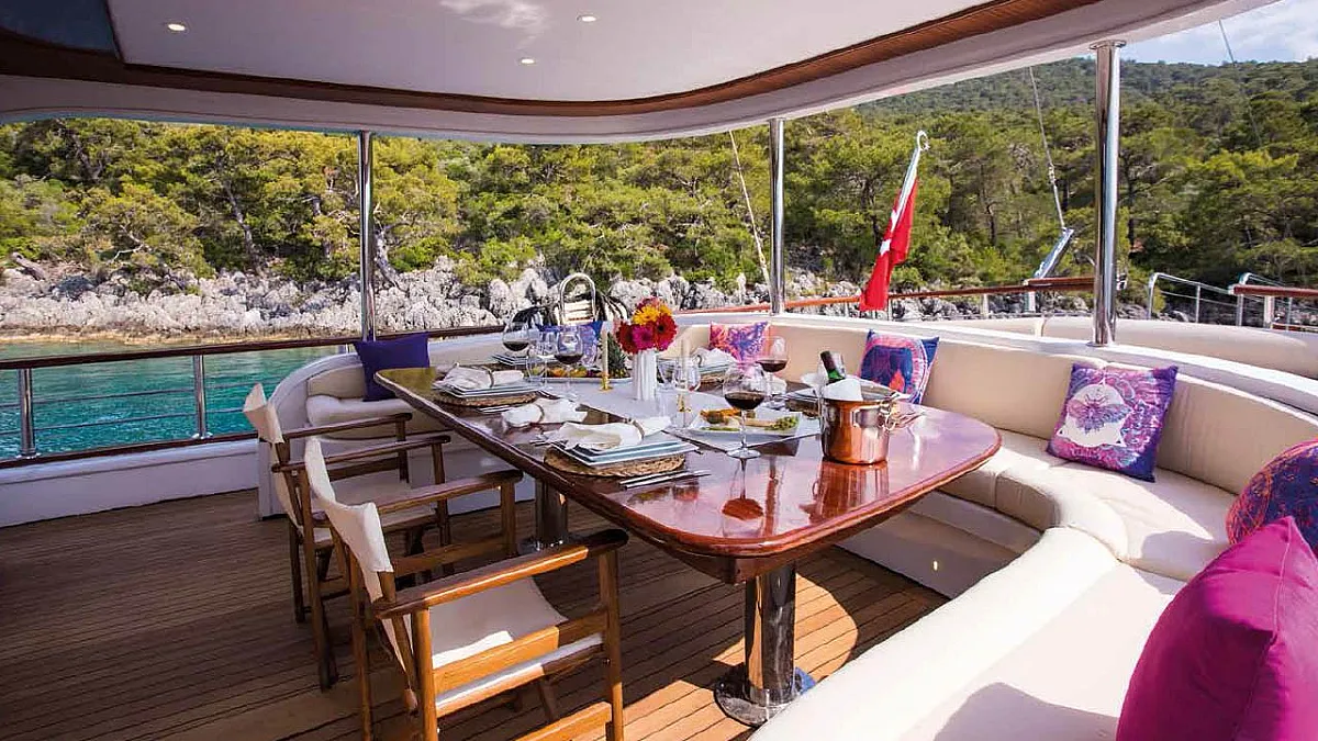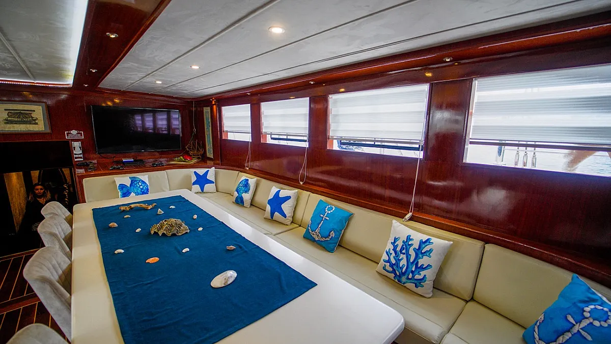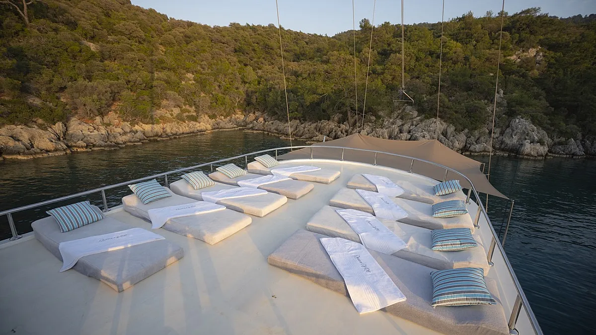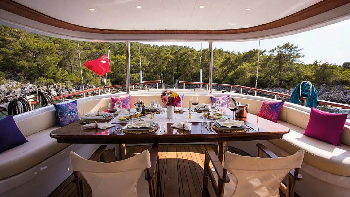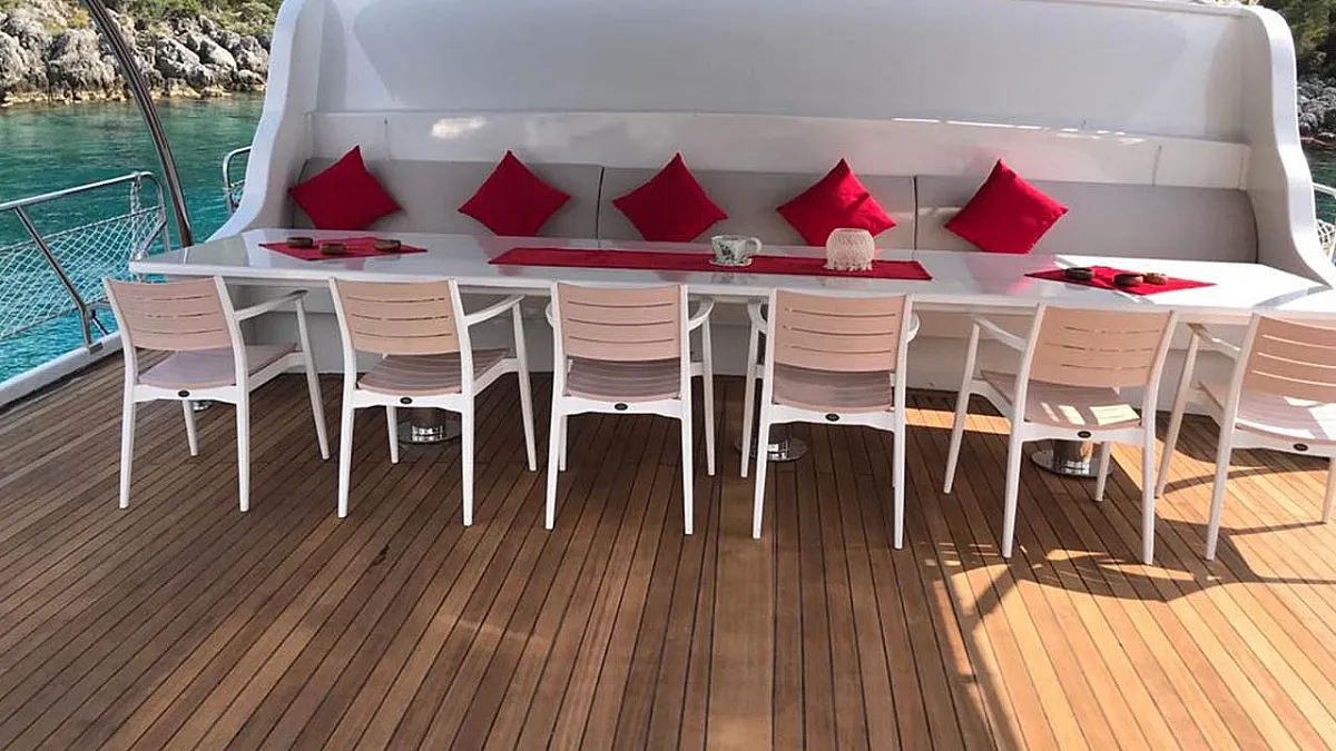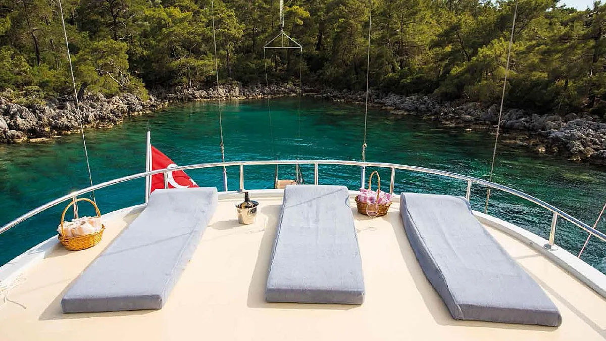 Charter rate includes, yacht insurance, fuel for average cruising time a day, daily cabin and bathroom cleaning, crew services, mooring fees in Türkiye, rent of the yacht, service boat, canoes, paddle boards, etc., ship's laundry (if available)