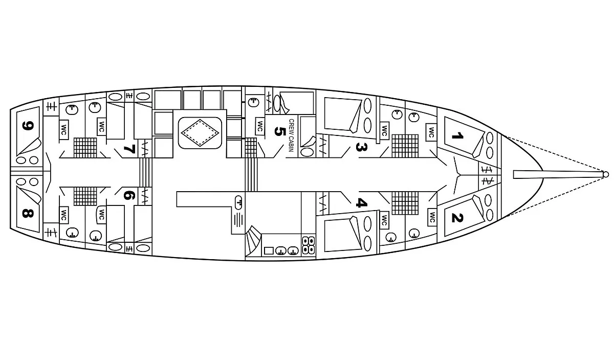 | NUMBER OF CABINS | 8 | TOTAL CREW | 4 |