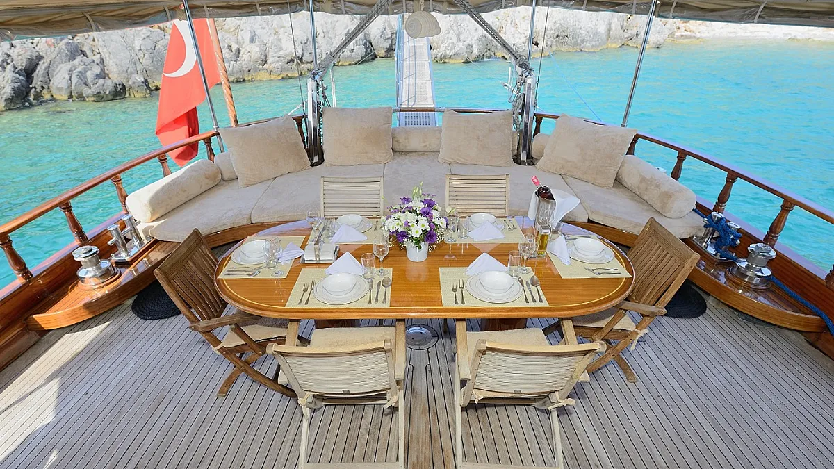 All meals and drinks for the charter, fuel for motor-operated equipment (tender, water sports), all marinas, all land tours, transfers, any personal expenses of the guests, crew gratuity (10-15% from the charter fee). Fuel surcharge for portion of charter outside of Turkish waters, any customs expenses if applicable.