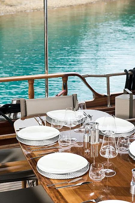 SERENAD A is not a usual traditional wooden yacht. From a distance, her appearance may look familiar due to her classic shape, but when you step onboard, you understand she’s outstanding. Her caring and very professional owners value high-end accommodation and service. That’s why they paid attention to each detail when the yacht was undergoing a refit process. A group of friends and fellows who are also passionate about the sea and yachting made sure that SERENAD A’s guests would know immediately that they are more than welcome onboard and their vacation and a great time is a priority for the crew. From sophisticated wine glasses to stylish tableware, an excellent selection of water toys and high-quality beach towels, a swinging chair and an Italian branded barbecue.