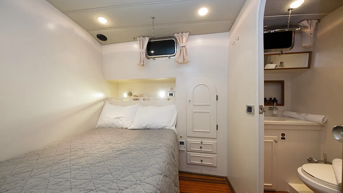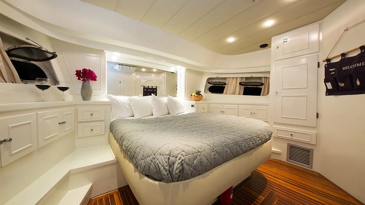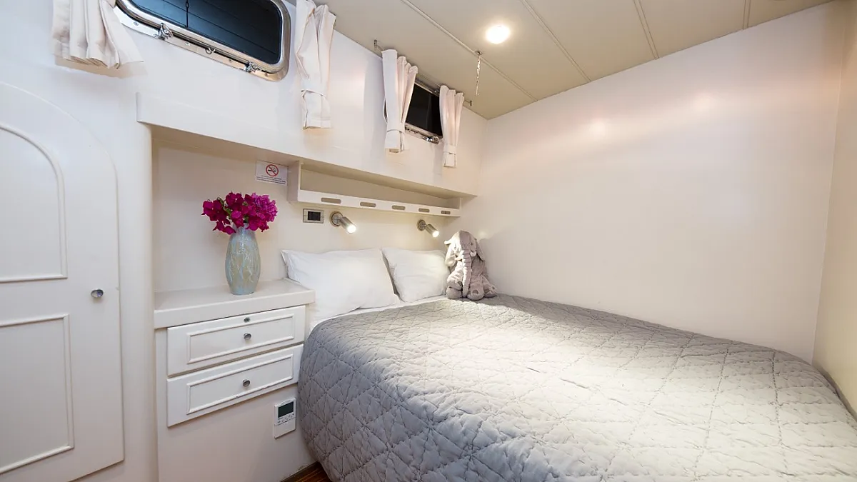 1 forward master cabin with queen size bed, 1 port side double cabin with french size bed, 1 starboard double cabin with french size bed