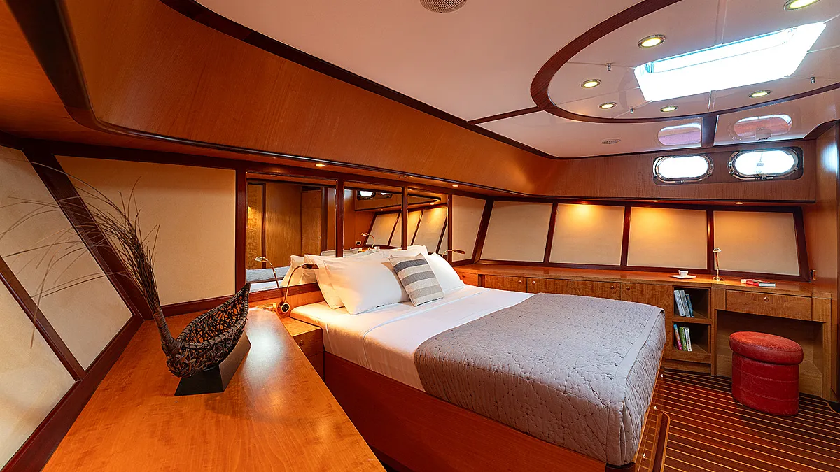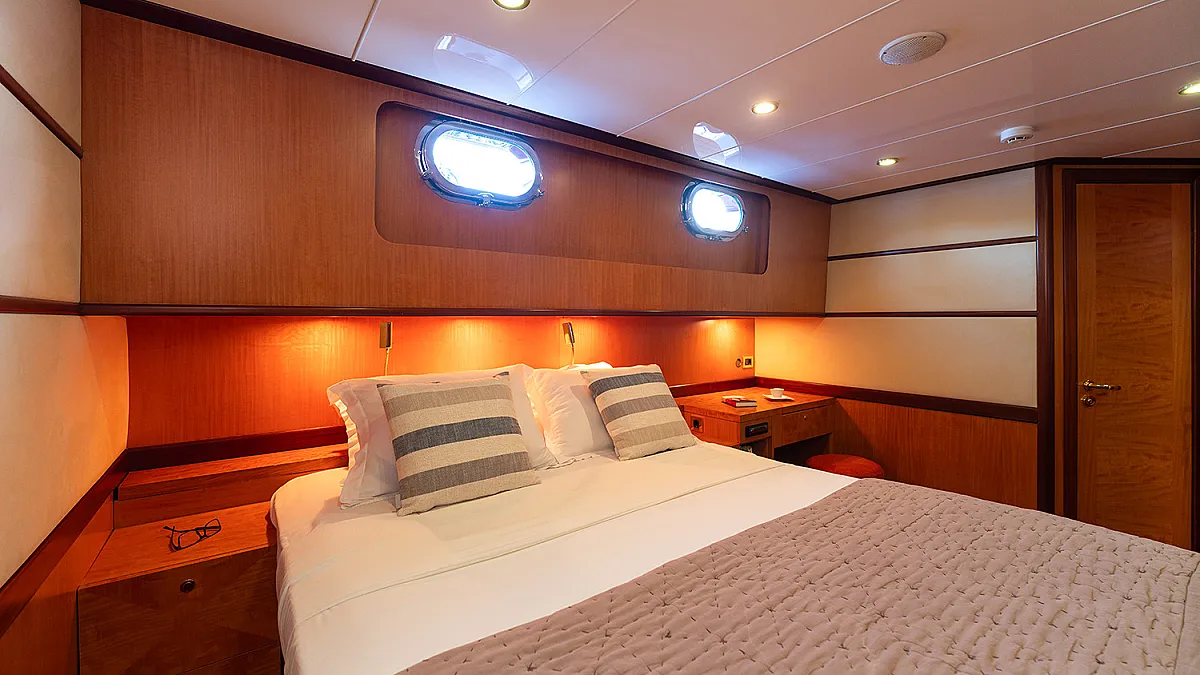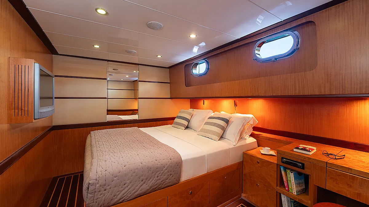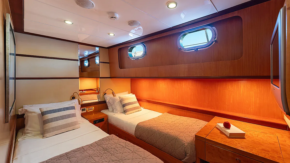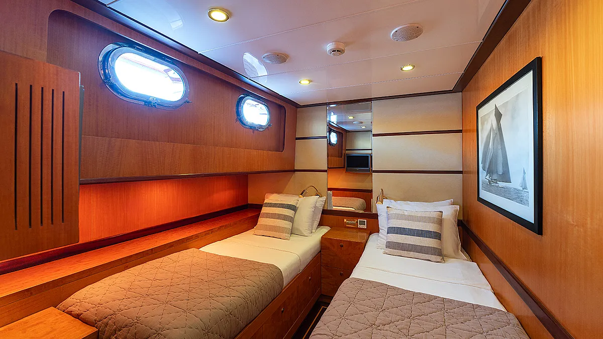 1 forward master cabin with queen size bed, bathroom, 1 port VIP cabin with queen size bed, 2 starboard identical twin cabins