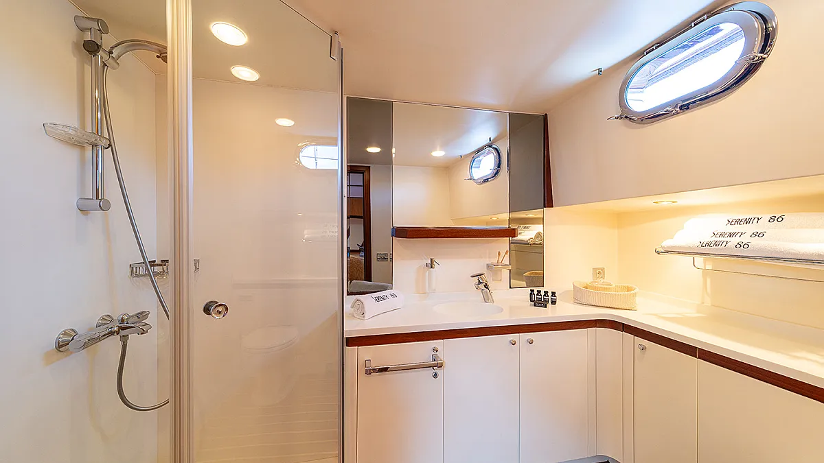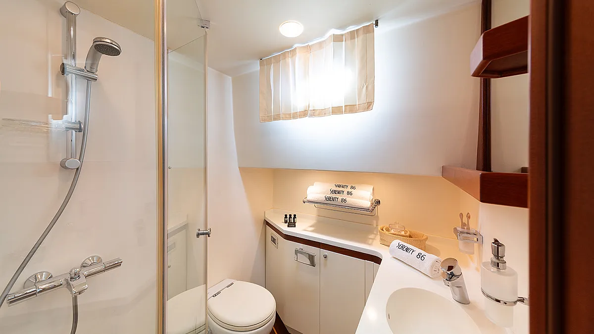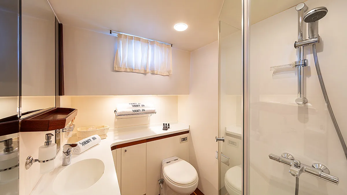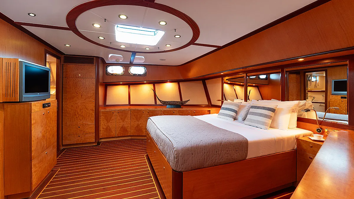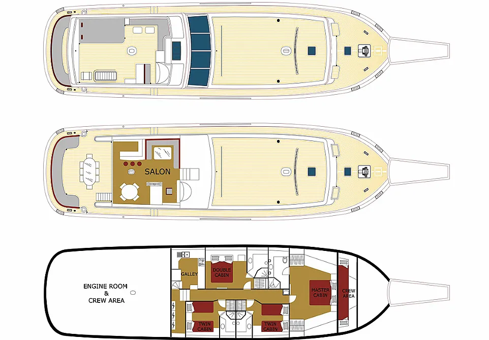1 forward master cabin with queen size bed, bathroom, 1 port VIP cabin with queen size bed, 2 starboard identical twin cabins