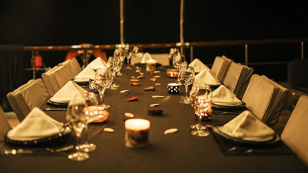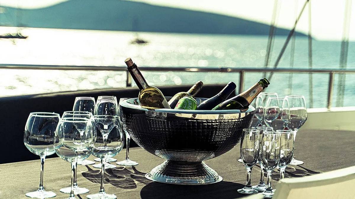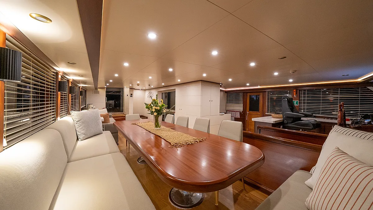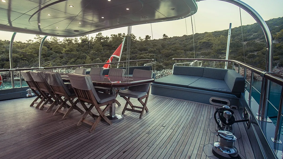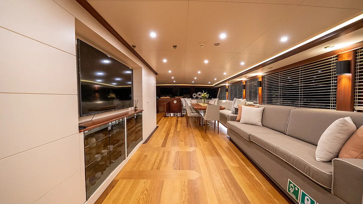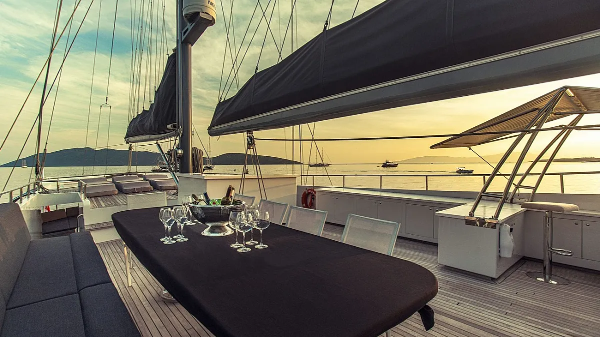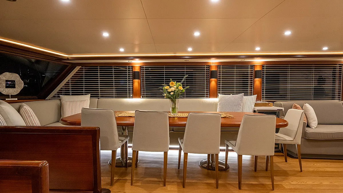 The star feature of VIRTUOSO is her flybridge, the ideal place to gather for the enjoyment of meals, and afterwards, for catching rays. The flybridge features a dining table, a BBQ grill, and a wet bar. Guests may to choose to have breakfast here, overlooking the water. Removing the sun awning, this area easily transforms into a lounging area. At sunset, a pre-dinner party set to the sound of your favourite music means that aperatif cocktails and hor d'oevers can be enjoyed in complete privacy. As the evening unfolds, a culinary journey begins, each dish a revelation chosen by VIRTUOSO's talented chef. Guests can stay on to savour dessert and then descend to the aft deck for more partying around the aft deck's huge dining table.