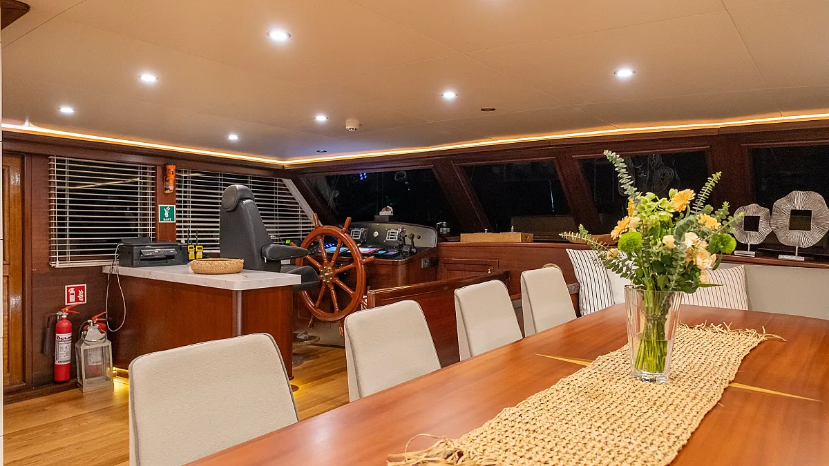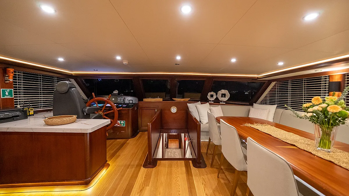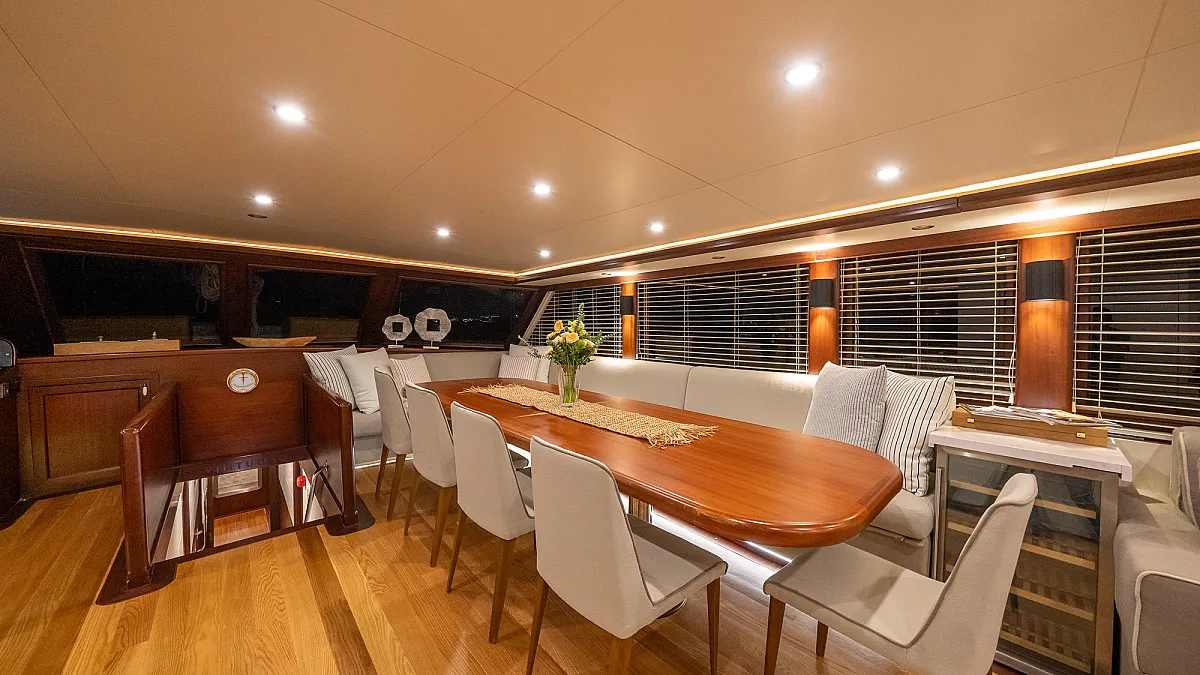 Flybridge features bar and dining table for 12 persons