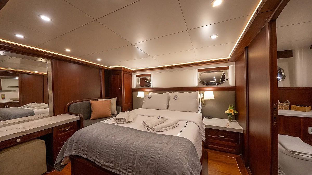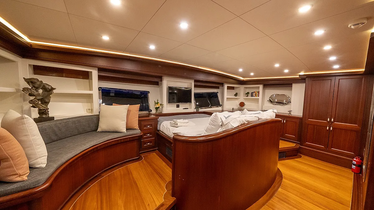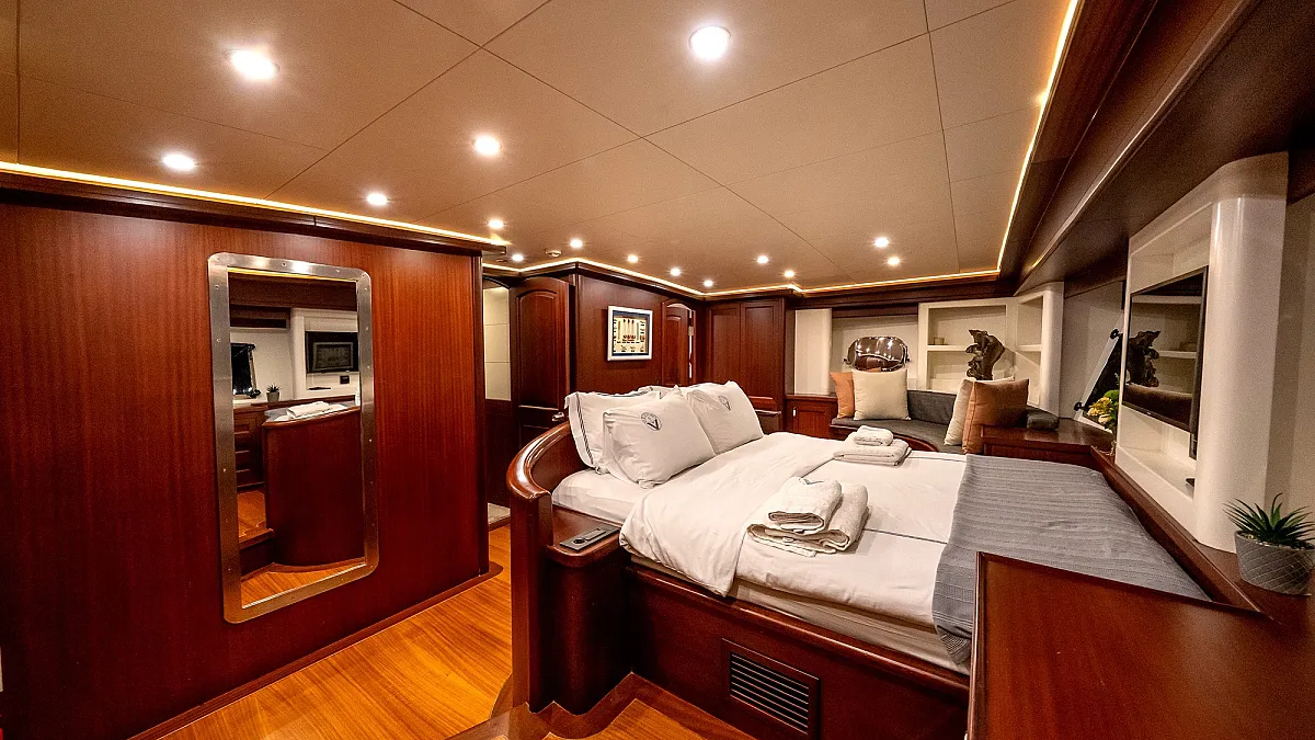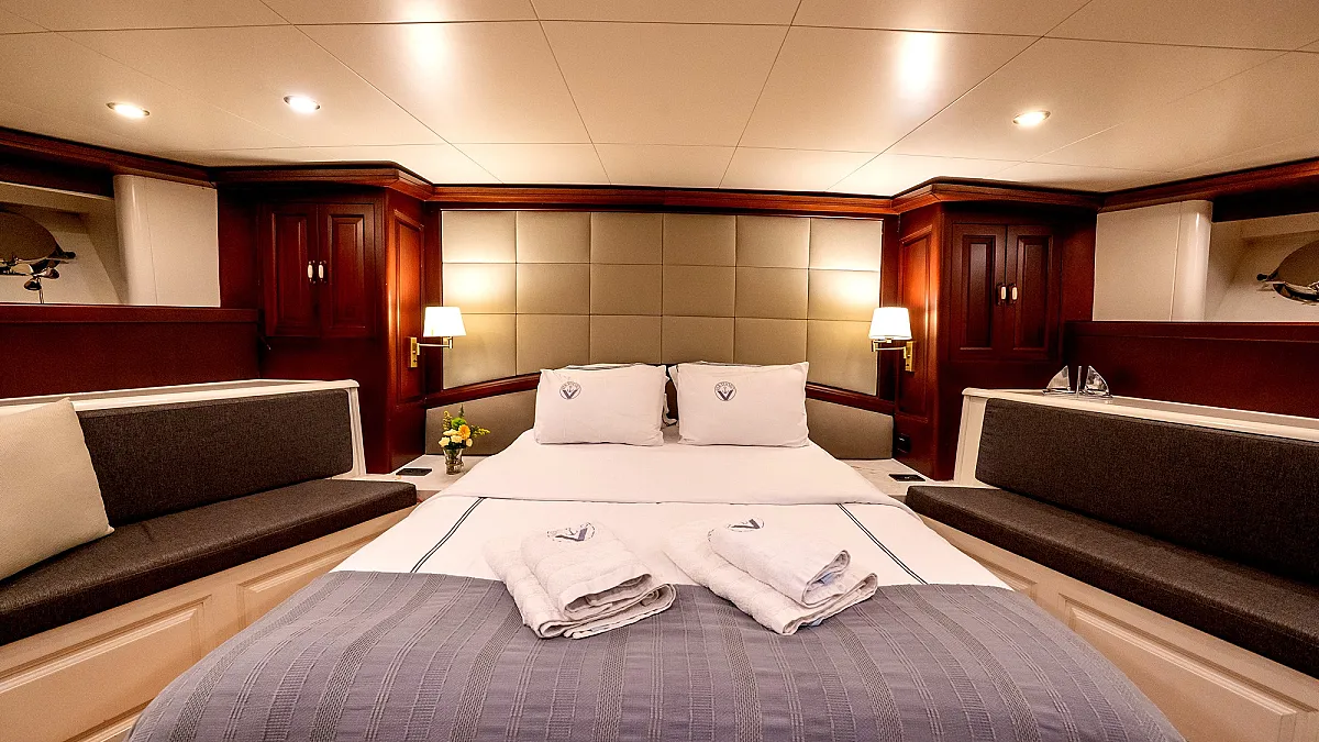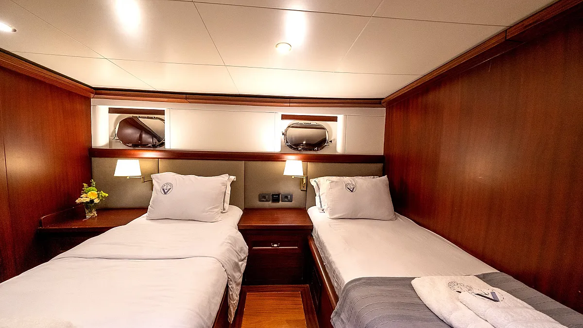 VIRTUOSO accommodates a party of 12 guests in six beautifully appointed cabins. There are two master, three double, and one twin cabin. An additional single cabin next to the master stateroom in the aft serves as accommodation for a nanny or a guide. All cabins are of a good size, are well-proportioned and have their own private ensuite facilities. Decorated in a style befitting the VIRTUOSO, the same harmonious blend of light fabrics set off by richest mahogany runs throughout the yacht. The master cabin features a king-size bed facing large panoramic windows. The forward master cabin is of a generous size, with two comfortable settees next to the king-size bed. All cabins are air conditioned have ample storage space.