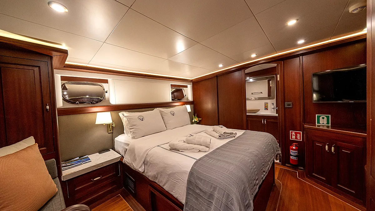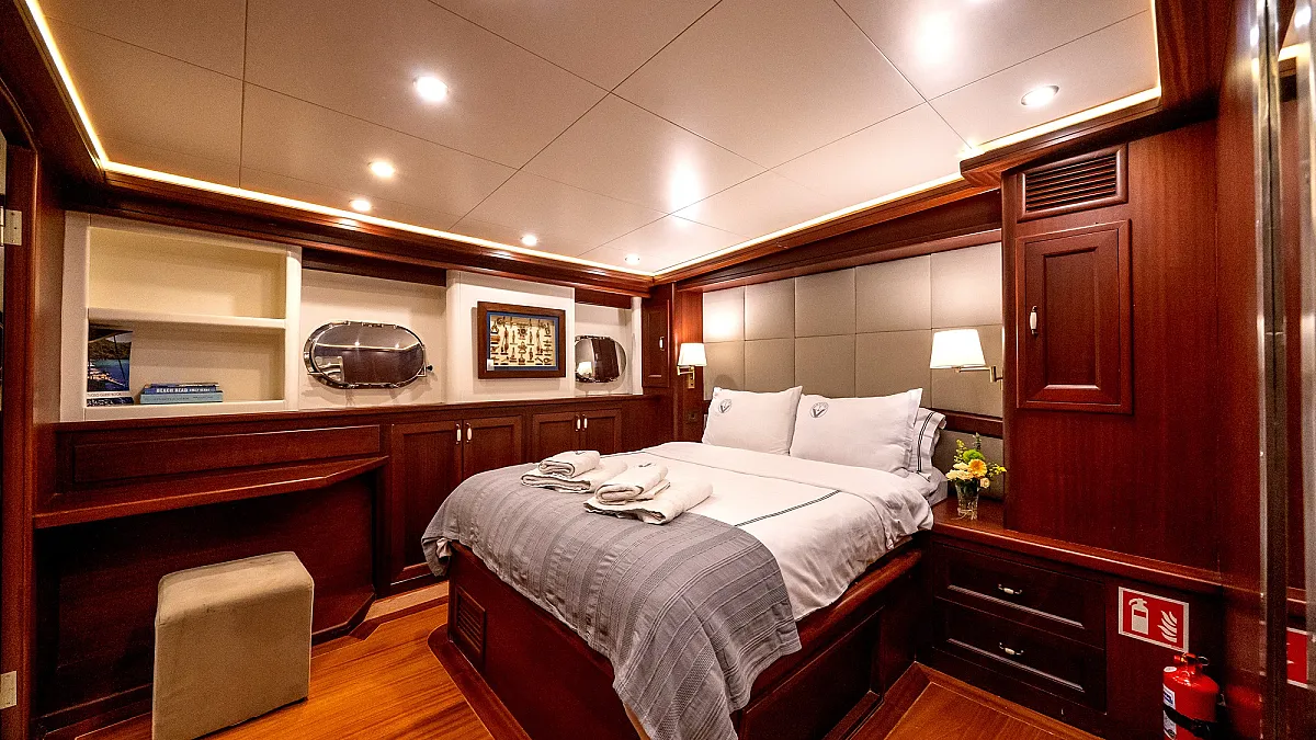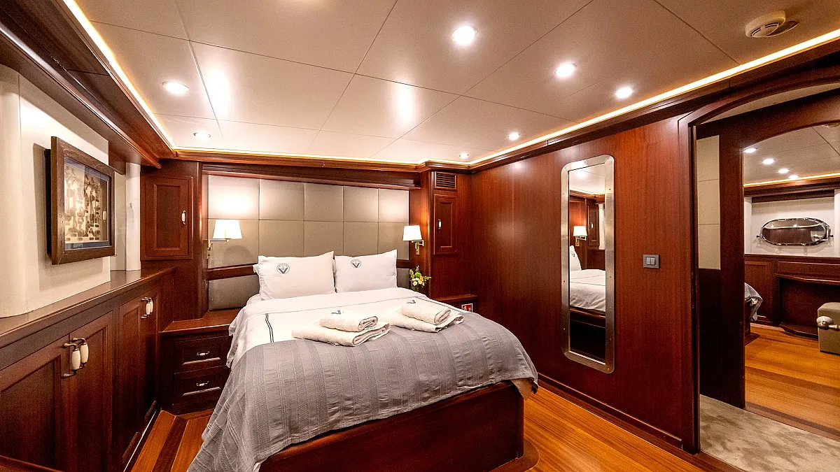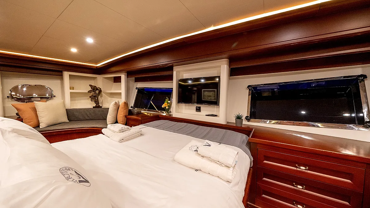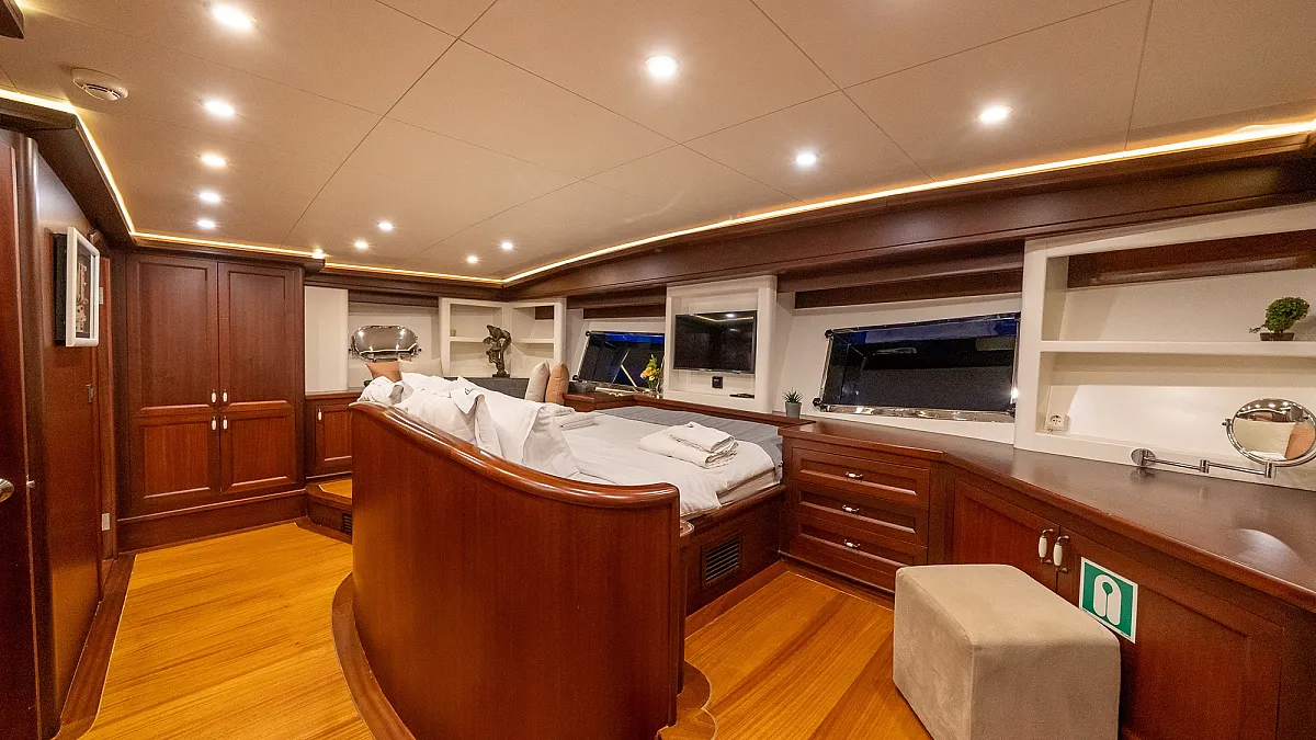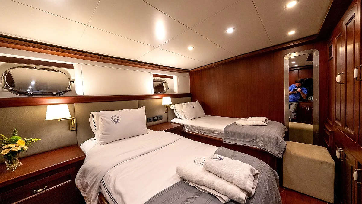 VIRTUOSO accommodates a party of 12 guests in six beautifully appointed cabins. There are two master, three double, and one twin cabin. An additional single cabin next to the master stateroom in the aft serves as accommodation for a nanny or a guide. All cabins are of a good size, are well-proportioned and have their own private ensuite facilities. Decorated in a style befitting the VIRTUOSO, the same harmonious blend of light fabrics set off by richest mahogany runs throughout the yacht. The master cabin features a king-size bed facing large panoramic windows. The forward master cabin is of a generous size, with two comfortable settees next to the king-size bed. All cabins are air conditioned have ample storage space.