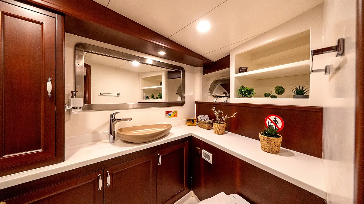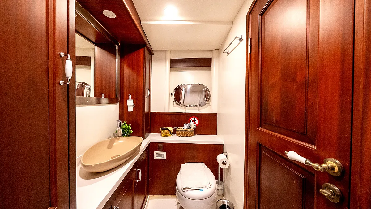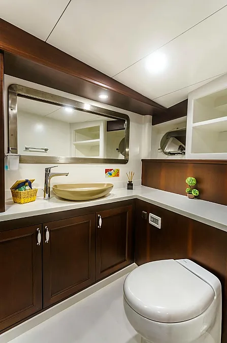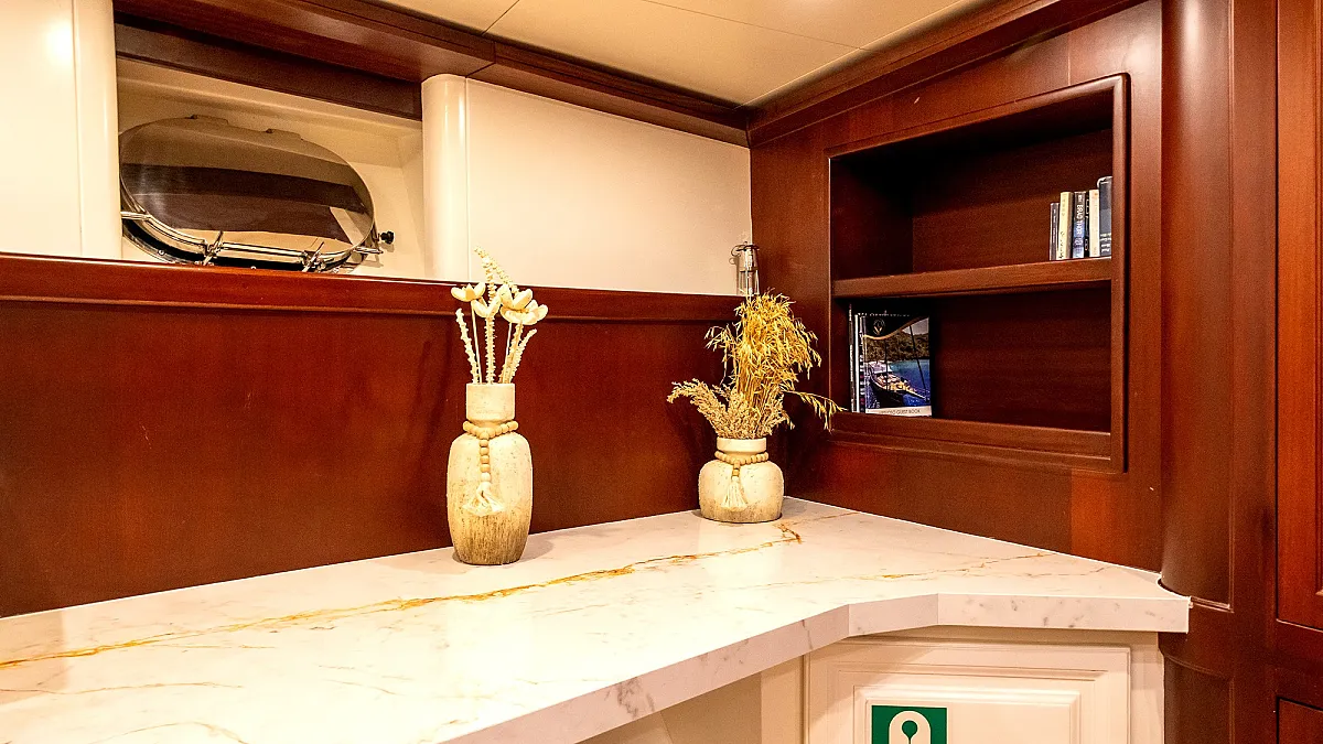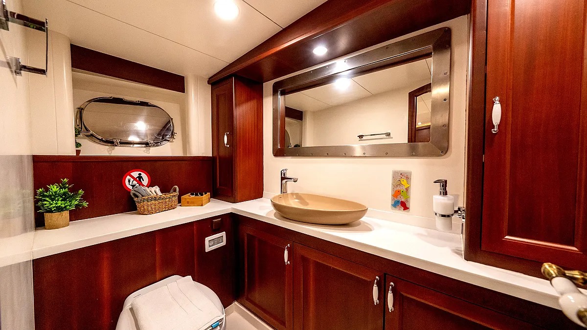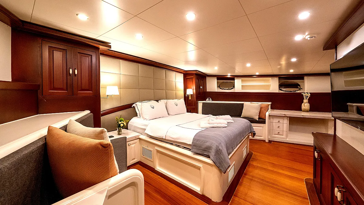 VIRTUOSO accommodates a party of 12 guests in six beautifully appointed cabins. There are two master, three double, and one twin cabin. An additional single cabin next to the master stateroom in the aft serves as accommodation for a nanny or a guide. All cabins are of a good size, are well-proportioned and have their own private ensuite facilities. Decorated in a style befitting the VIRTUOSO, the same harmonious blend of light fabrics set off by richest mahogany runs throughout the yacht. The master cabin features a king-size bed facing large panoramic windows. The forward master cabin is of a generous size, with two comfortable settees next to the king-size bed. All cabins are air conditioned have ample storage space.
