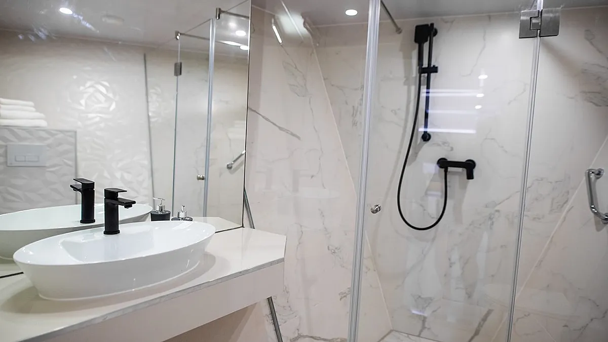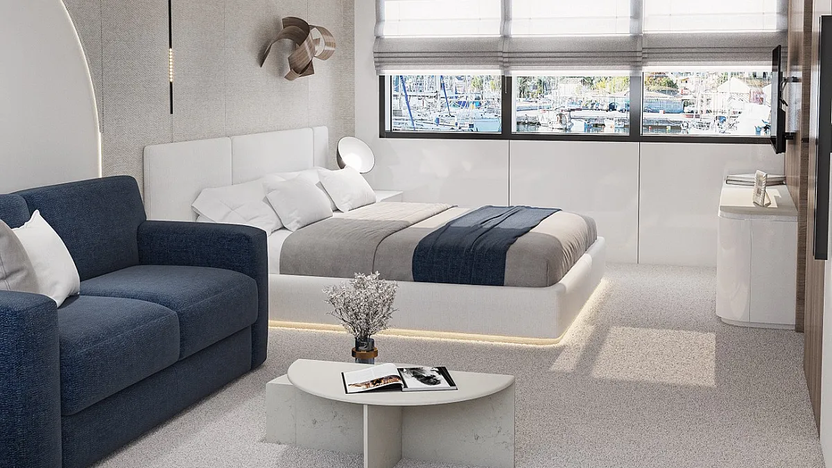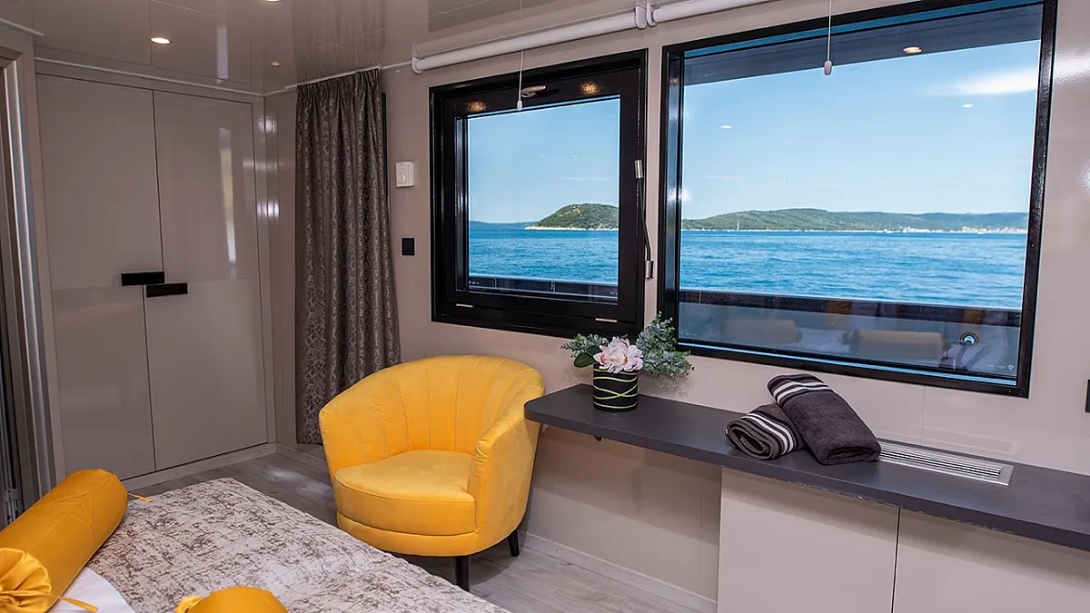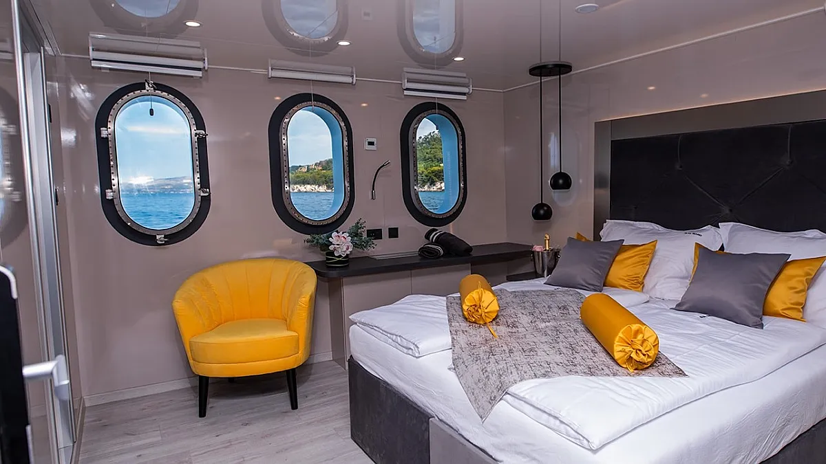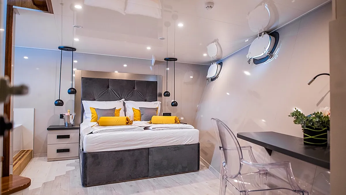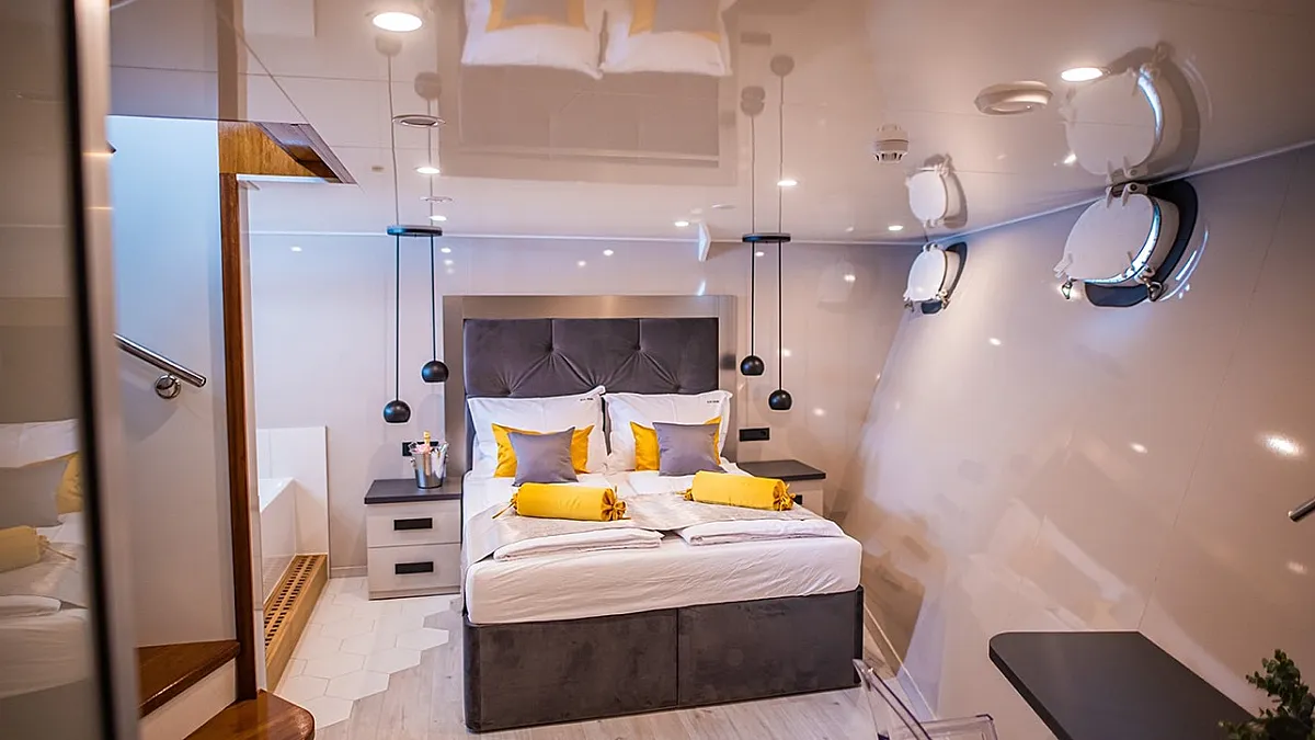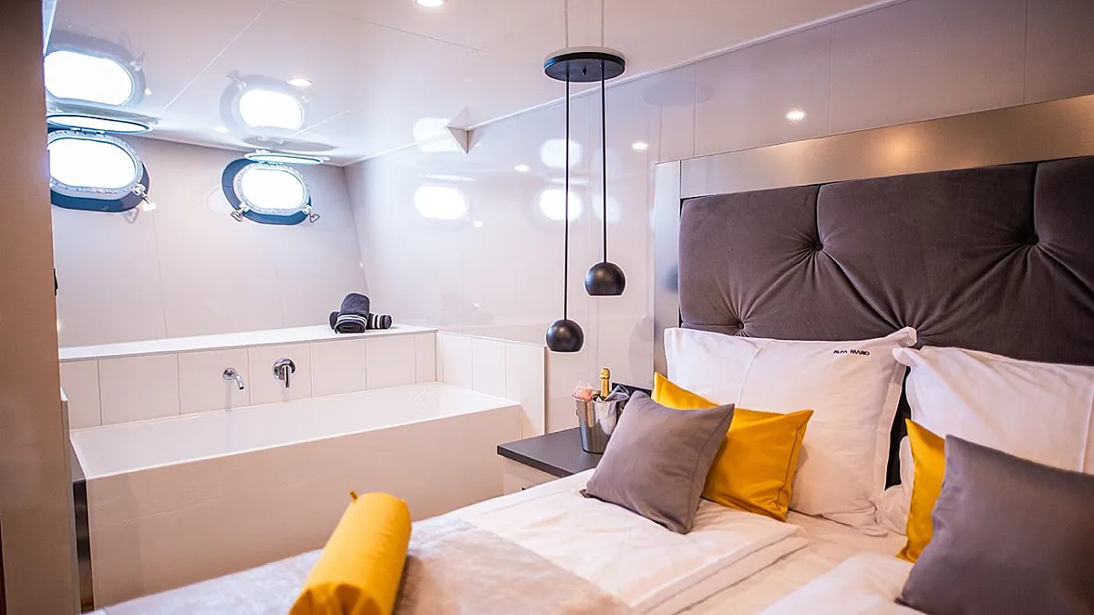 Main Deck: Master cabin with a double bed (180x195 cm) and in-cabin bathtub. 5 Double cabins with double beds (180x195 cm). 2 Convertible cabins (double or twin) with 2 single beds (90x195 cm).