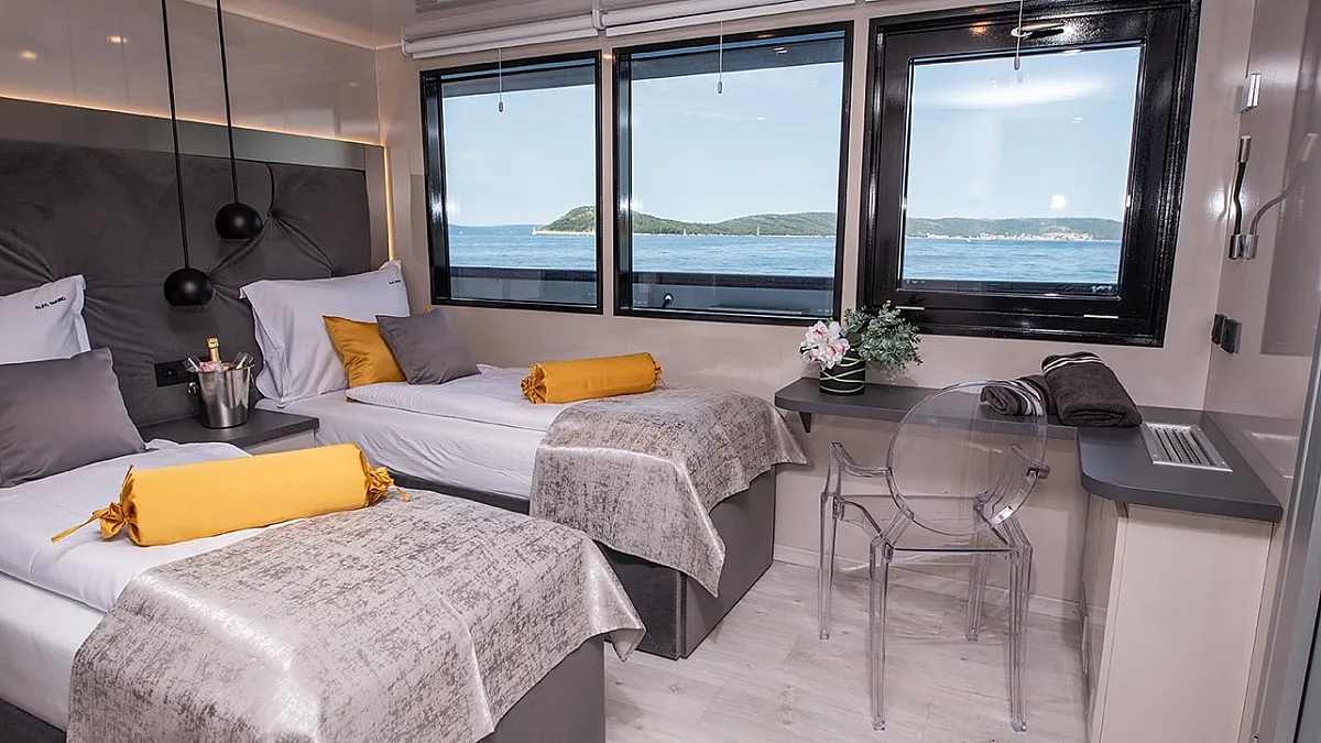 Lower Deck: 5 Double cabins with double beds (180x195 cm). 3 Convertible cabins (double or twin) with 2 single beds (90x195 cm).