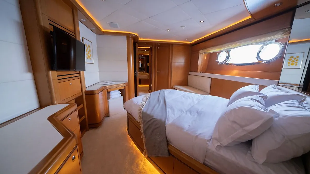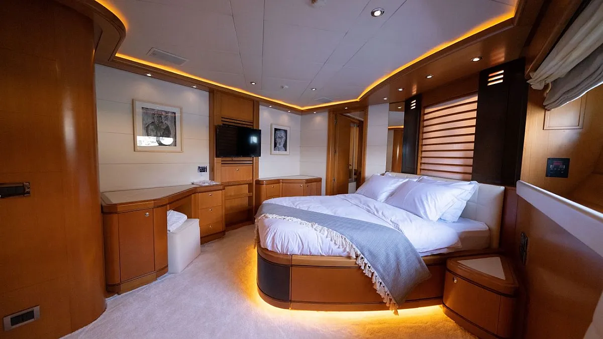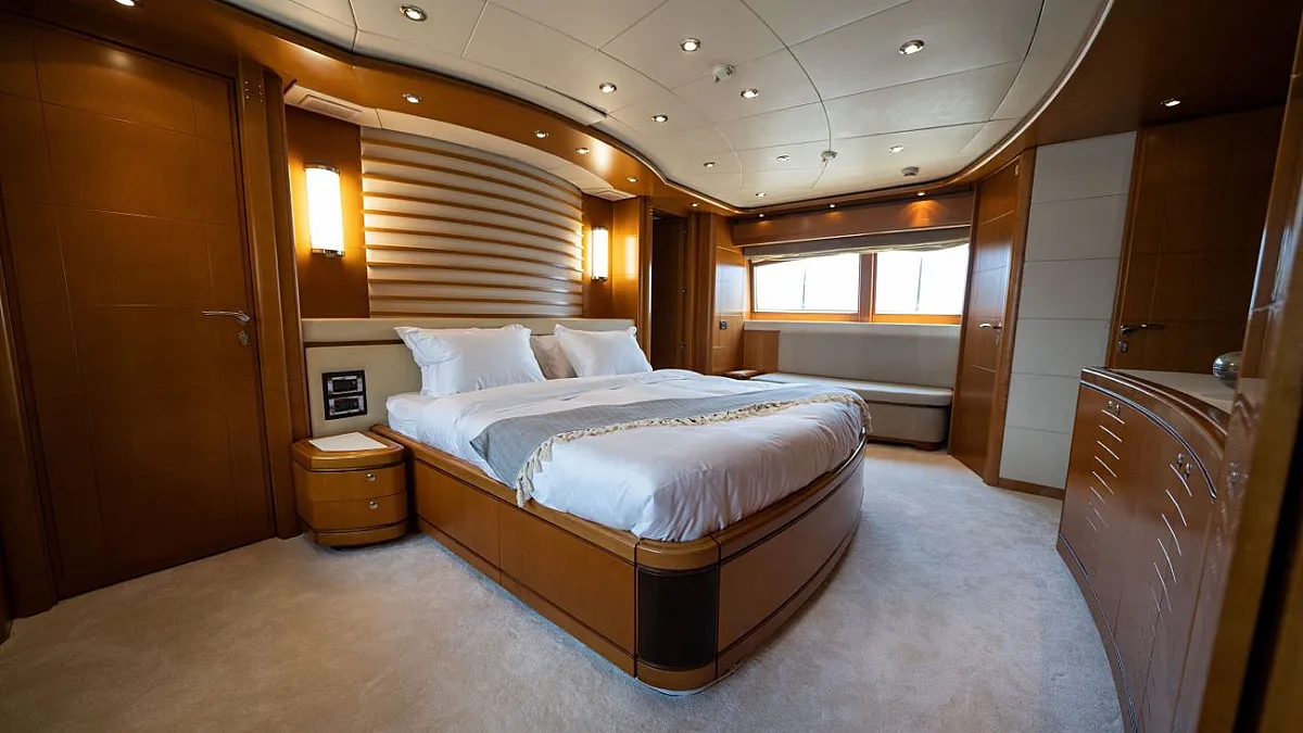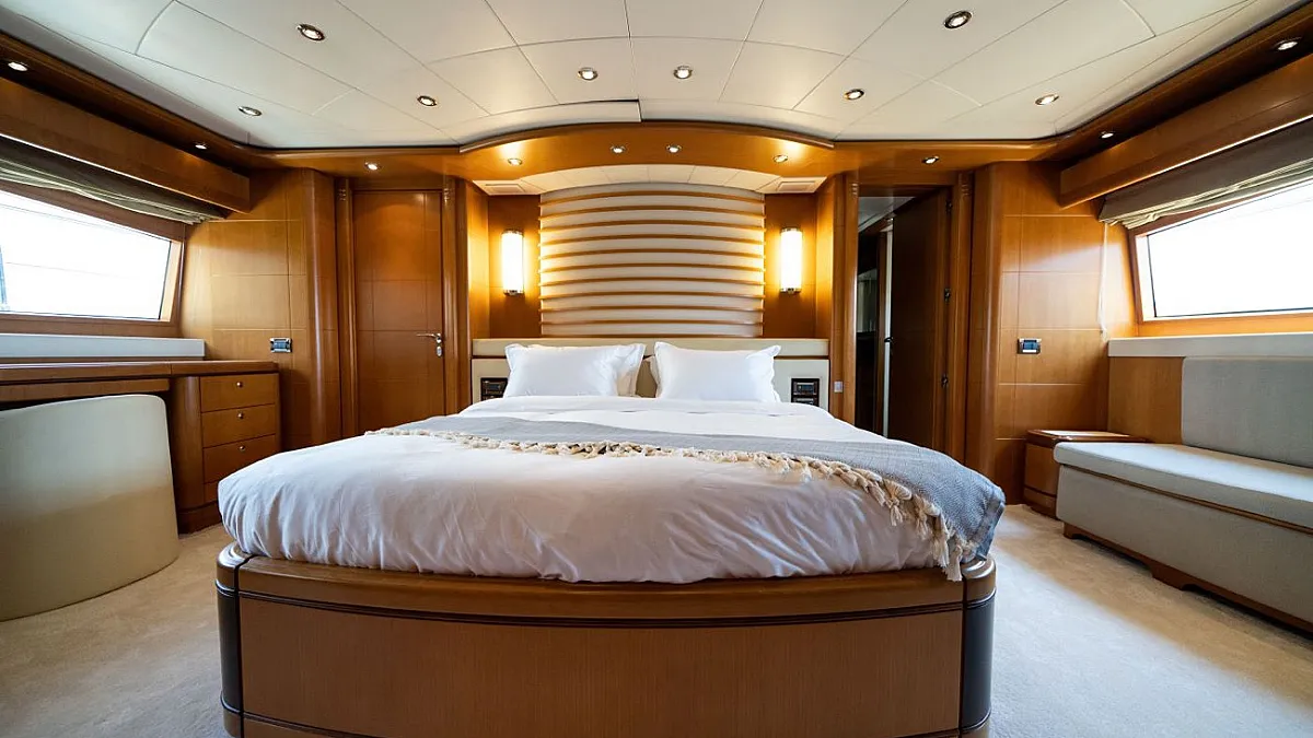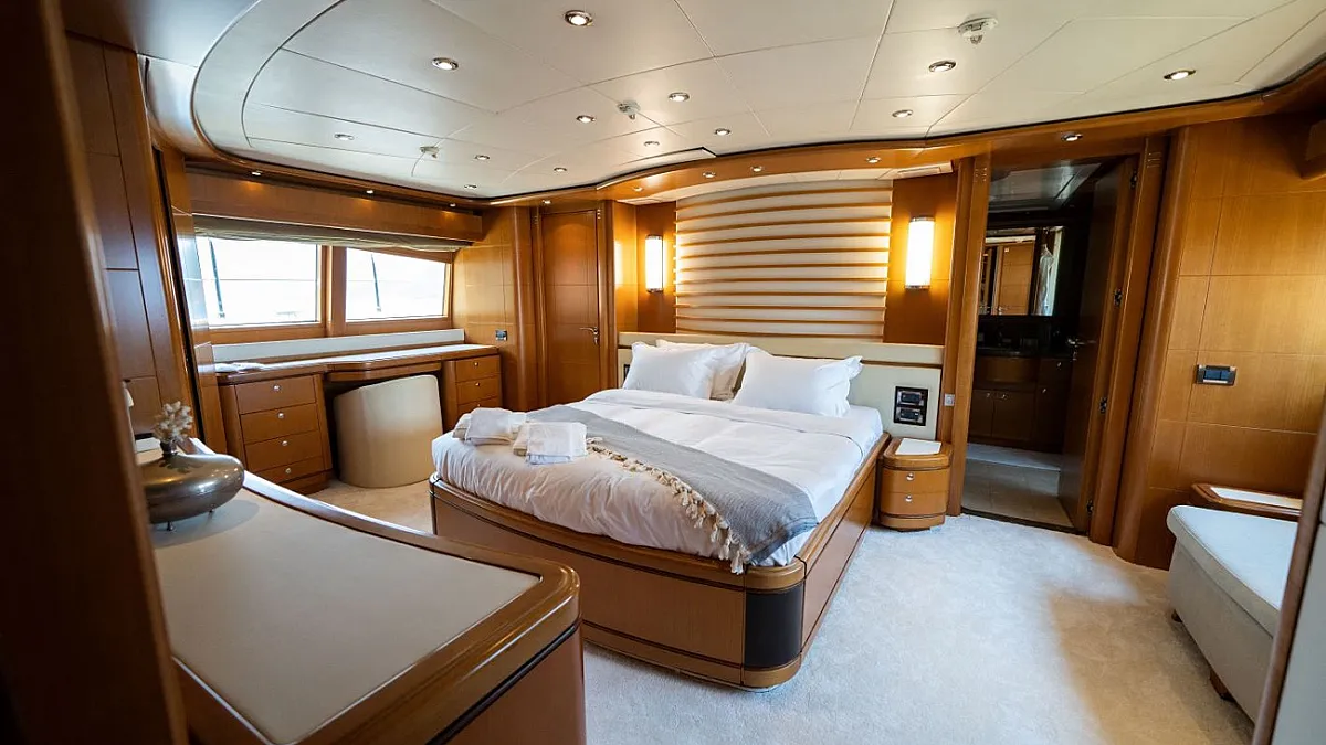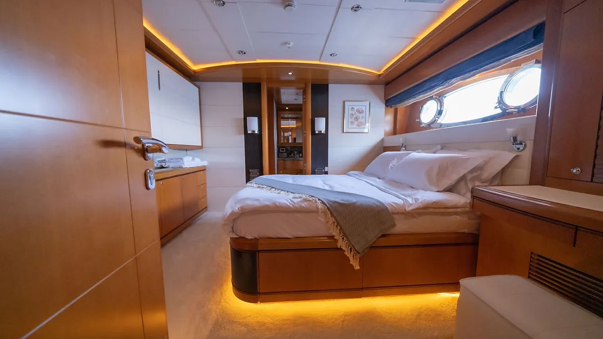 Master suite (main deck), 2 VIP cabins (lower deck), 1 Double cabin (upper deck), 2 Double cabins each with a Pullman bed (lower deck)