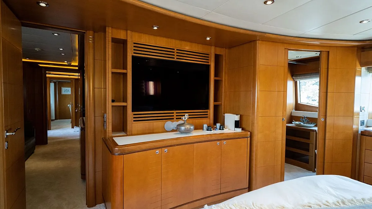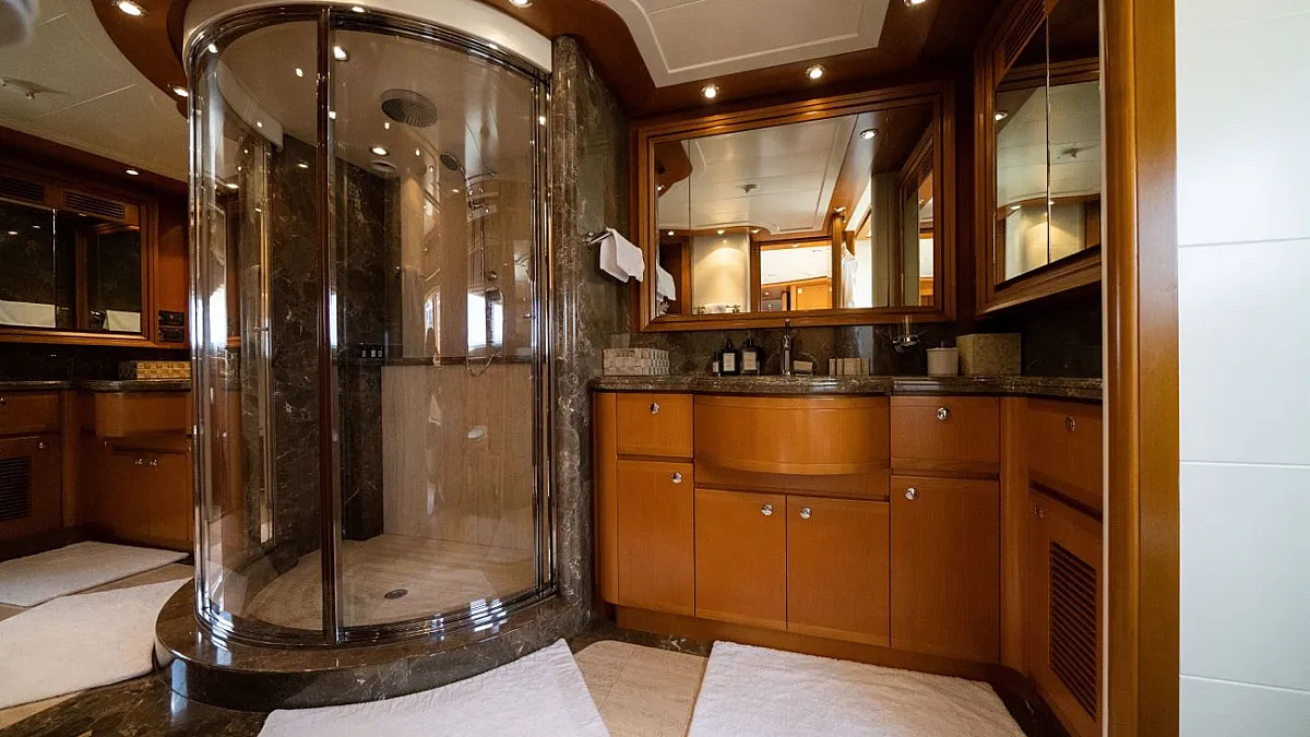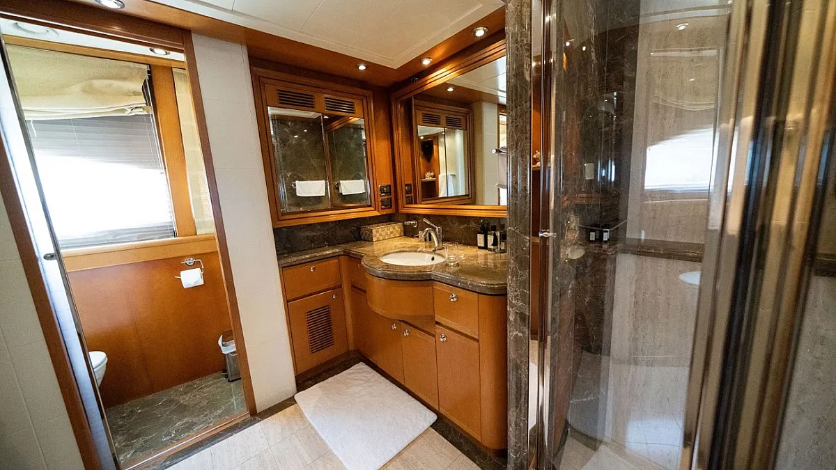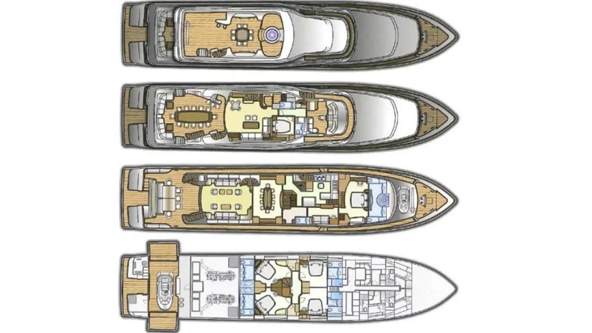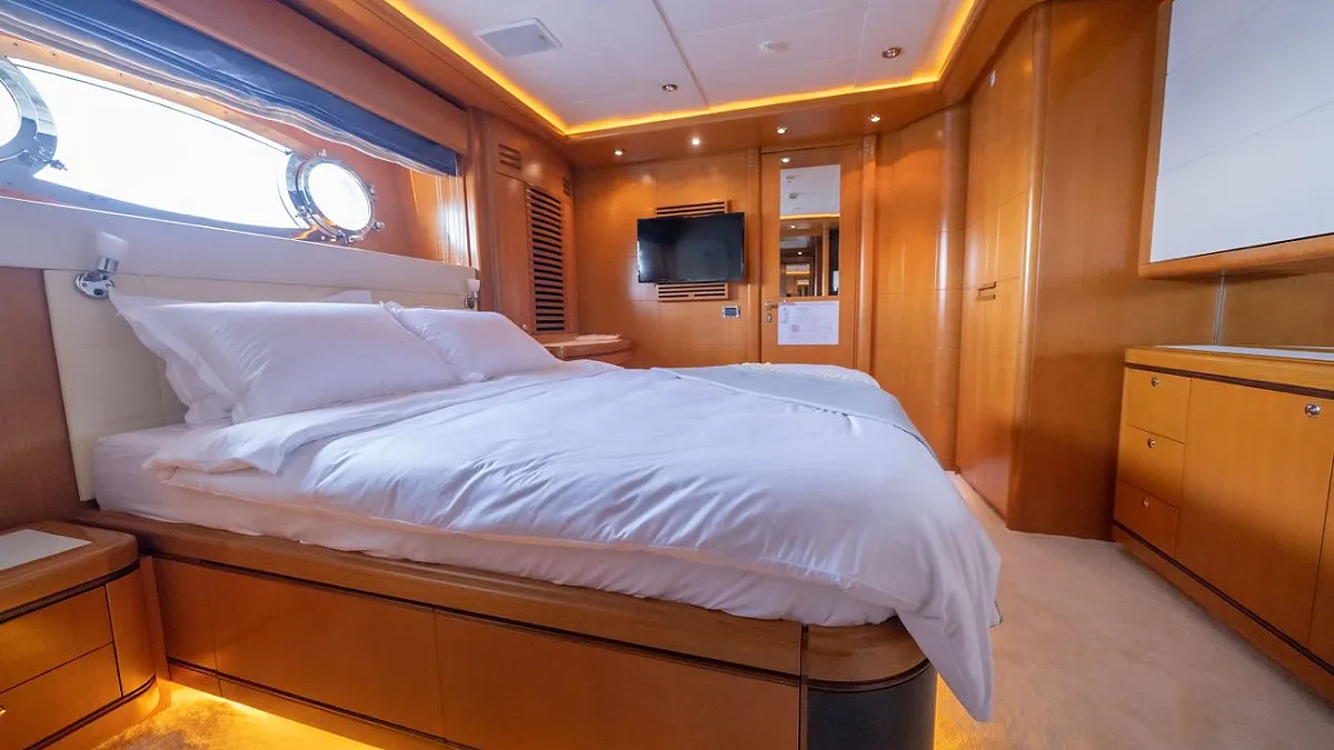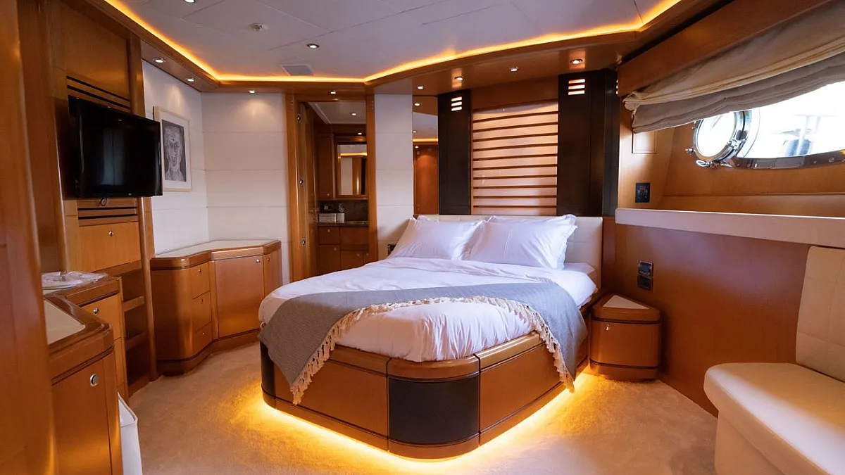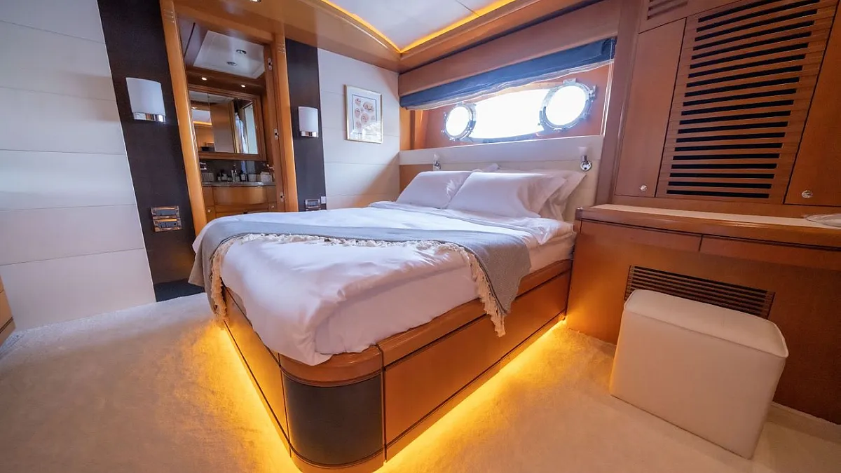 Master suite (main deck), 2 VIP cabins (lower deck), 1 Double cabin (upper deck), 2 Double cabins each with a Pullman bed (lower deck)