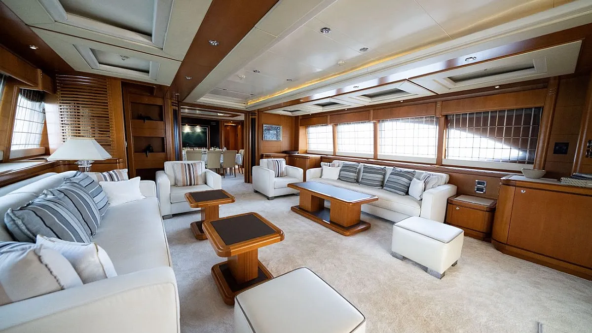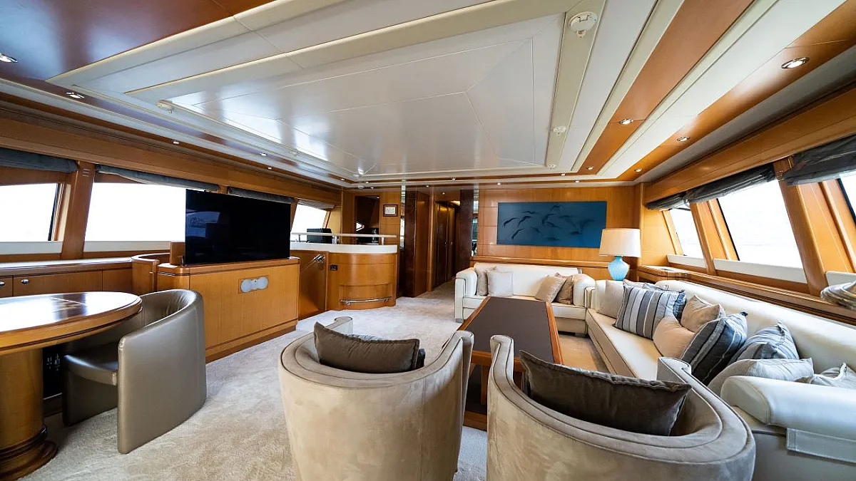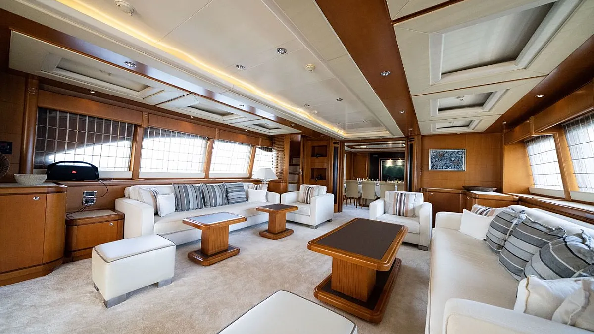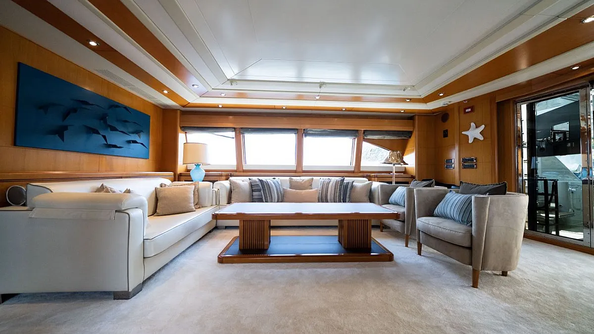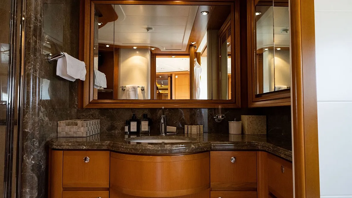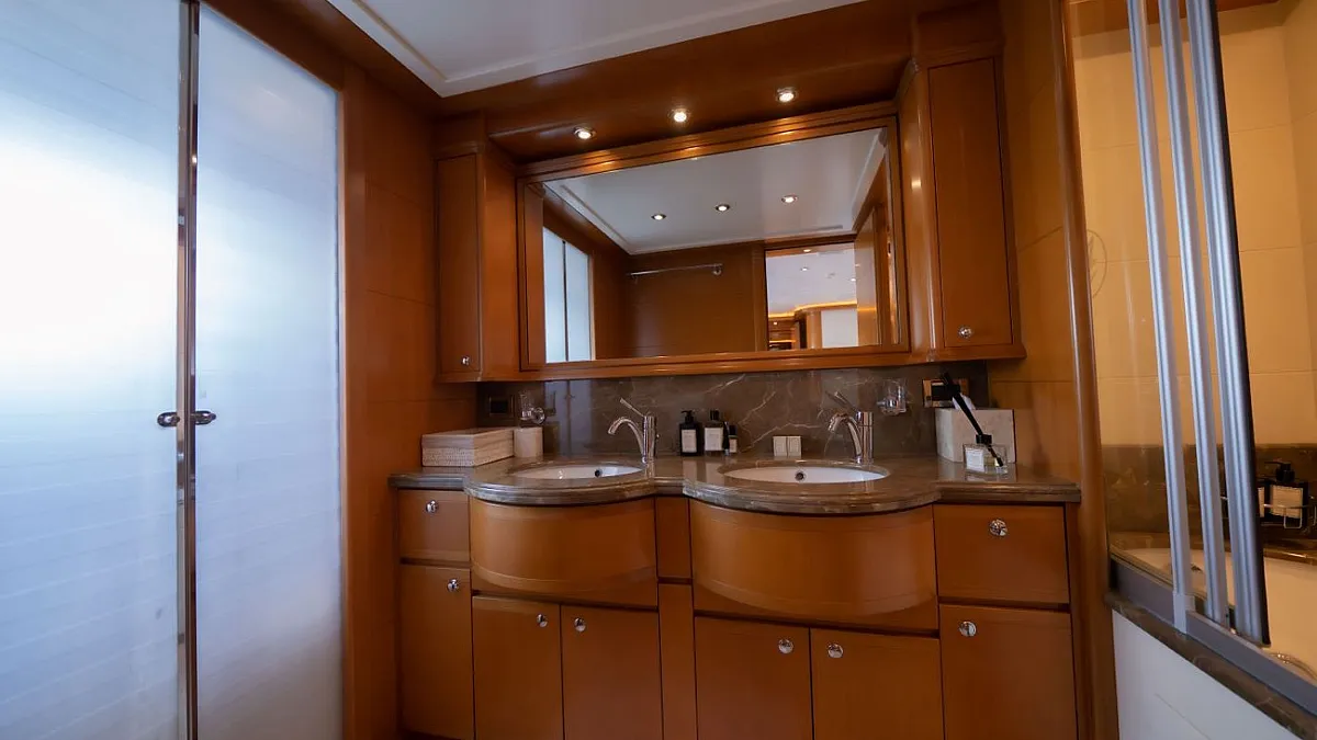 Master suite (main deck), 2 VIP cabins (lower deck), 1 Double cabin (upper deck), 2 Double cabins each with a Pullman bed (lower deck)
