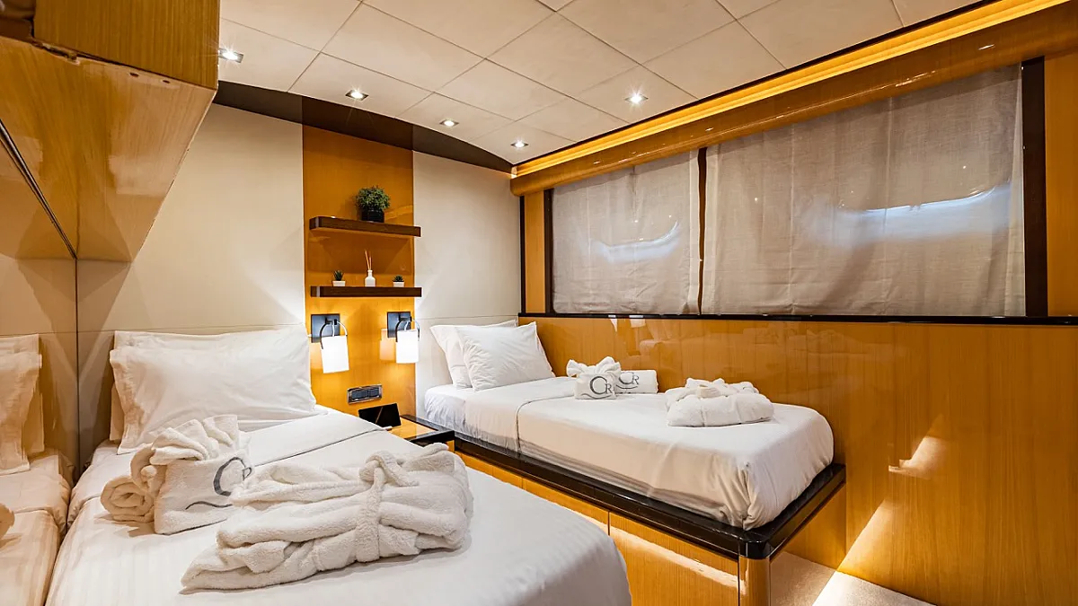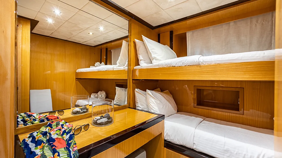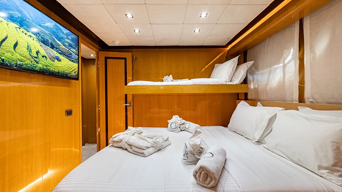MASTER: King size, VIP 1: Queen size, VIP 2: : Queen size plus one Pullman ( Full convertible ), VIP 3 : : Queen size plus one Pullman ( Full convertible ), TWIN 1: 2 Single beds ( Full convertible to double with King size bed) plus one Pullman, TWIN 2 : With two Pullman beds