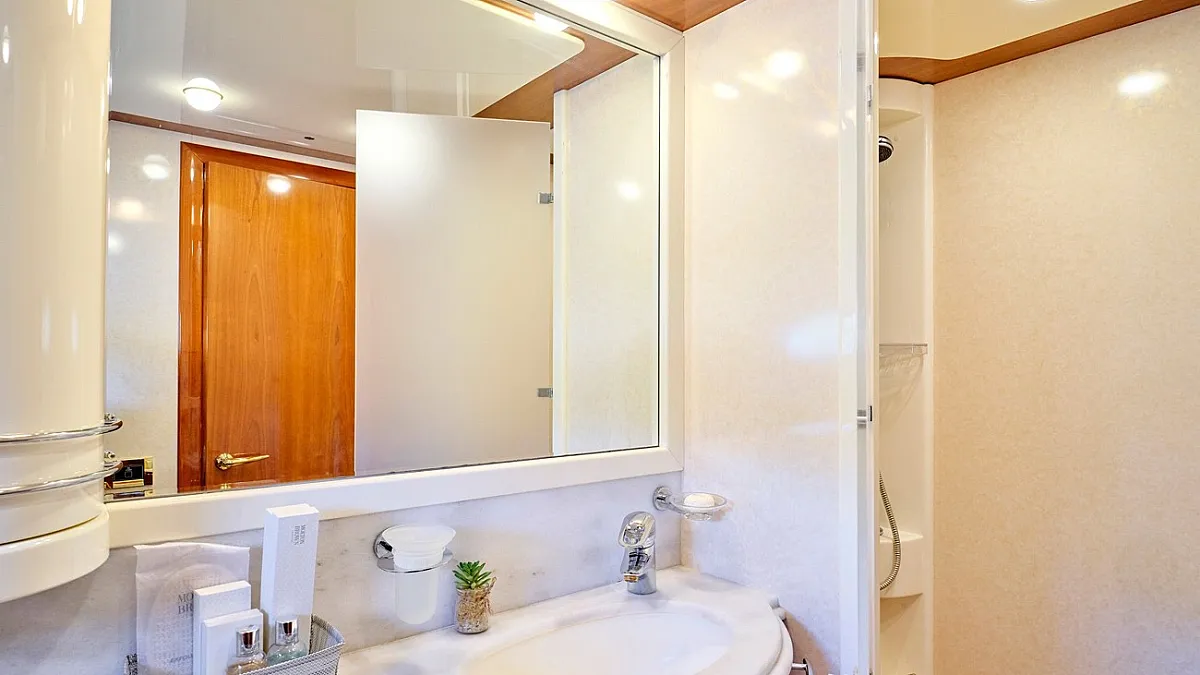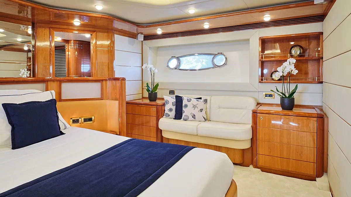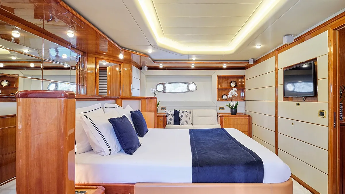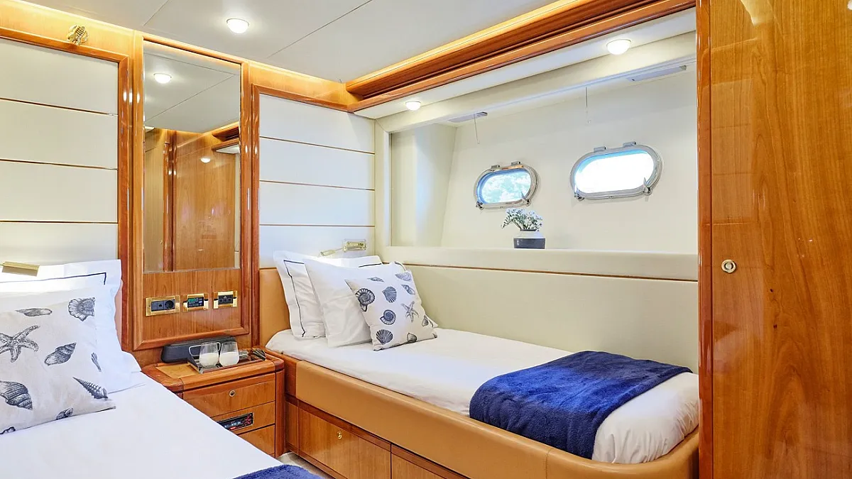 Μaster suite, a VIP cabin and 2 twin cabins one with an extra pullman berth, all with ensuite facilities.