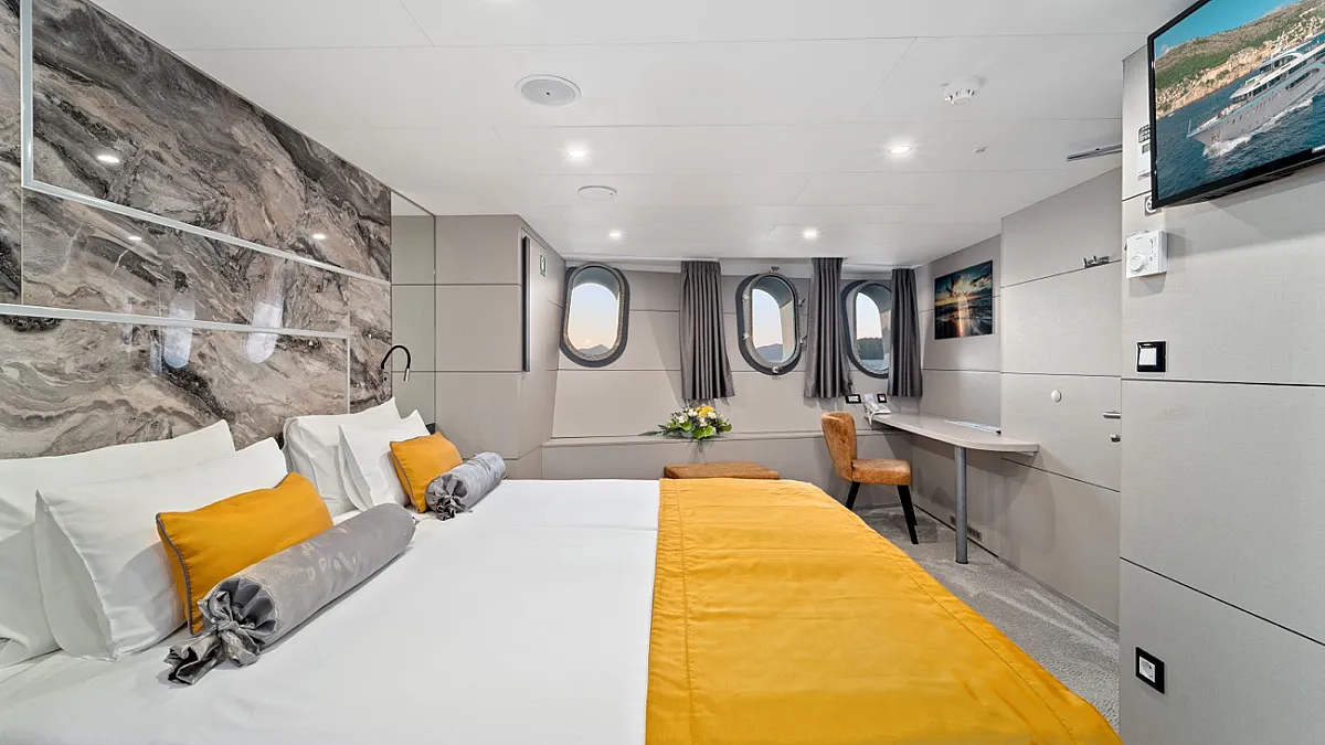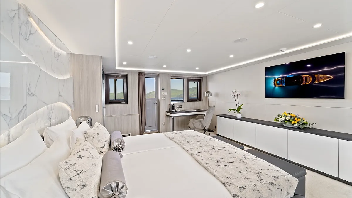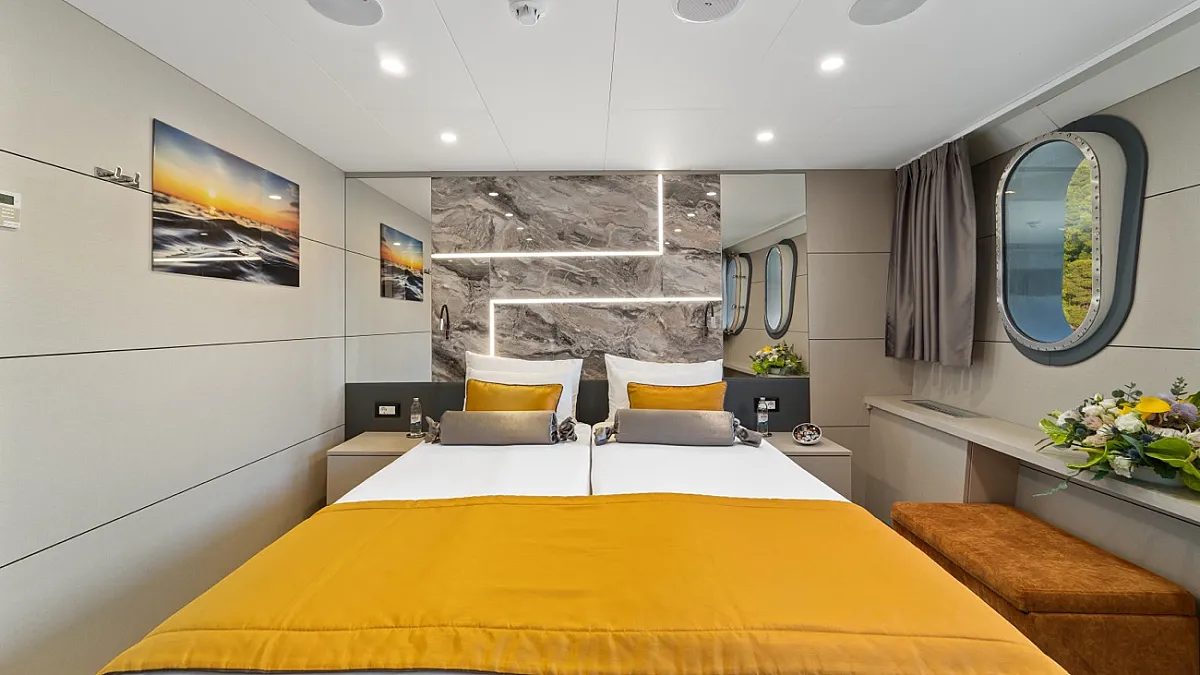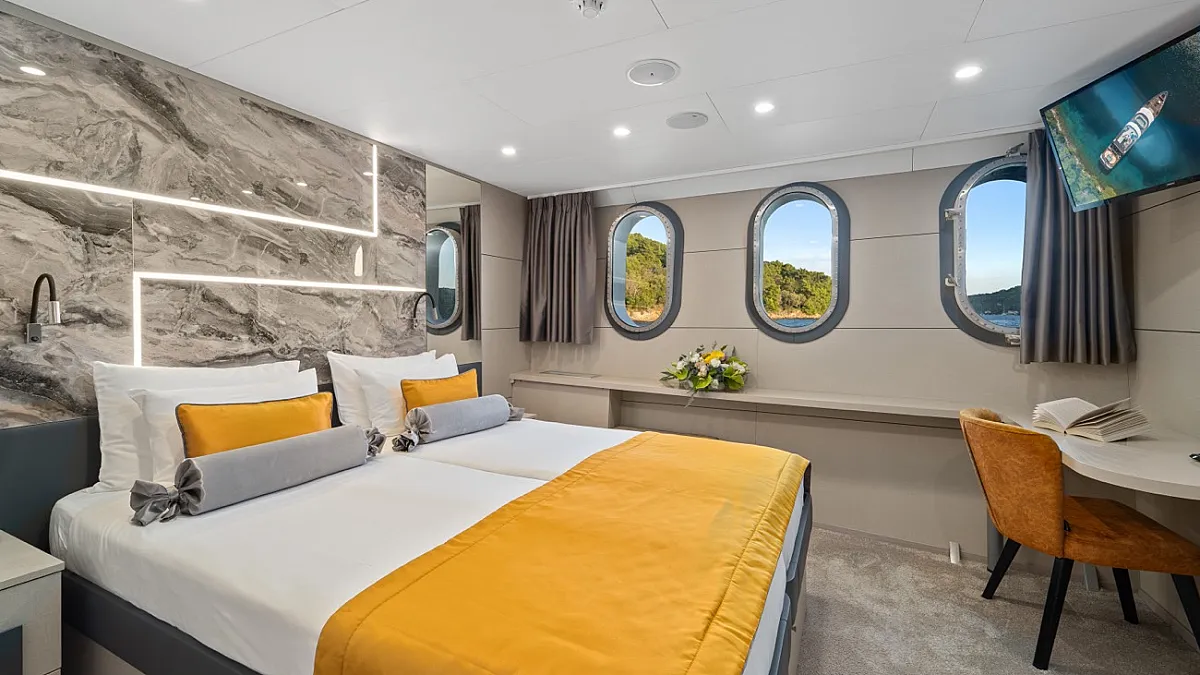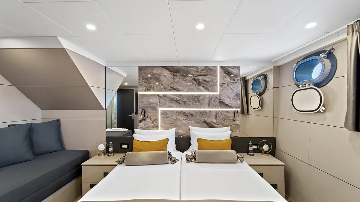 MAIN DECK : Master cabin with double bed. VIP cabin with double bed. 4 Double cabins with double bed, convertible into Twin cabins with 2 single beds.