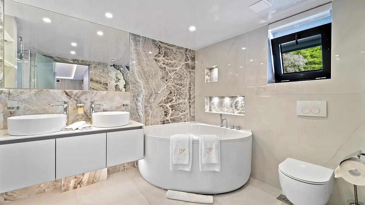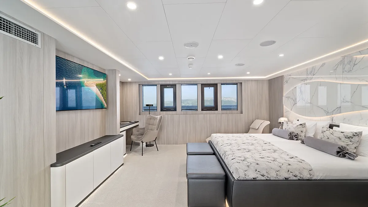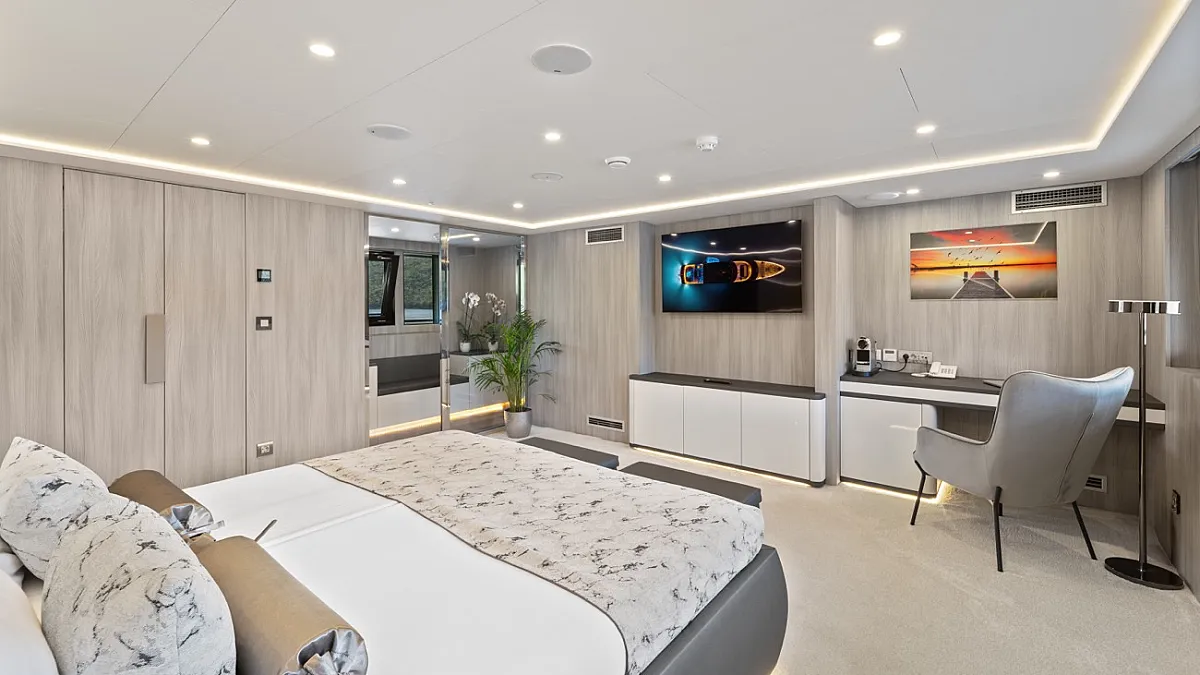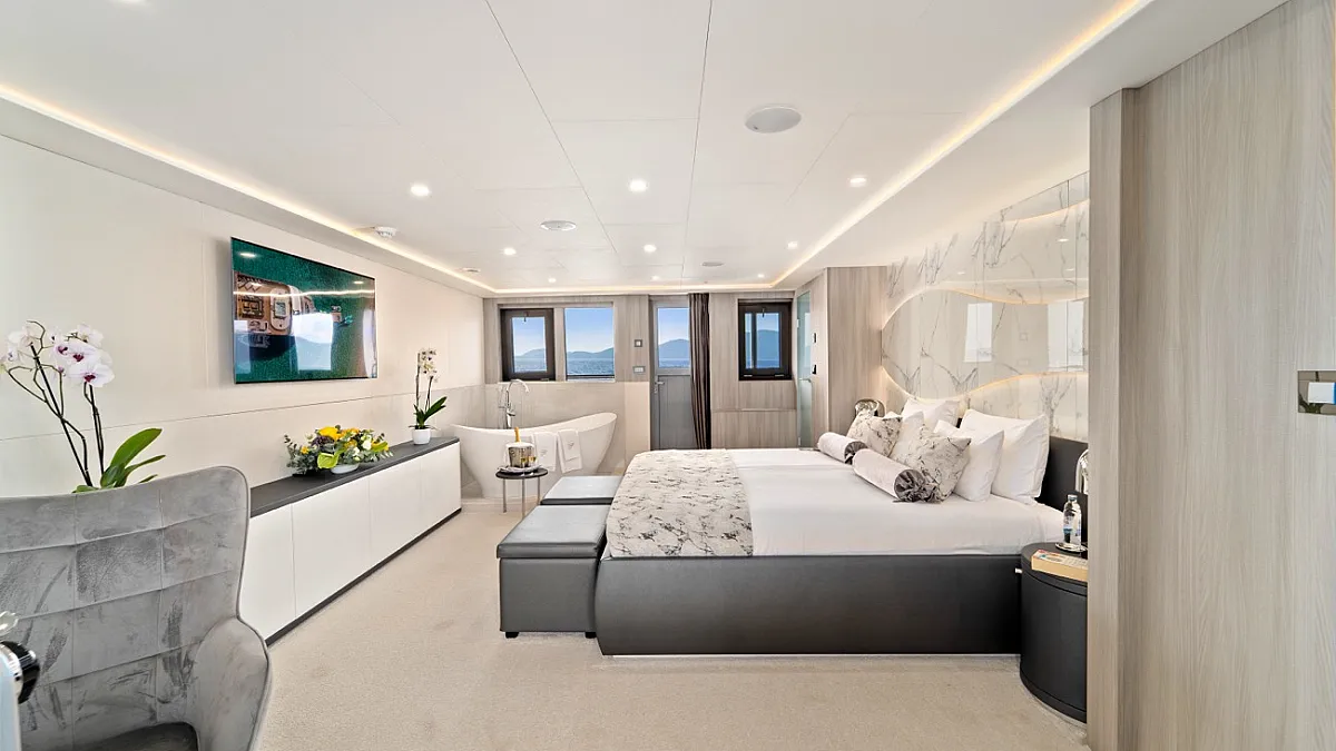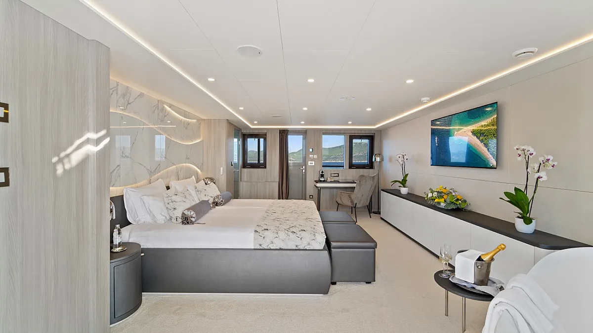 MAIN DECK : Master cabin with double bed. VIP cabin with double bed. 4 Double cabins with double bed, convertible into Twin cabins with 2 single beds.
