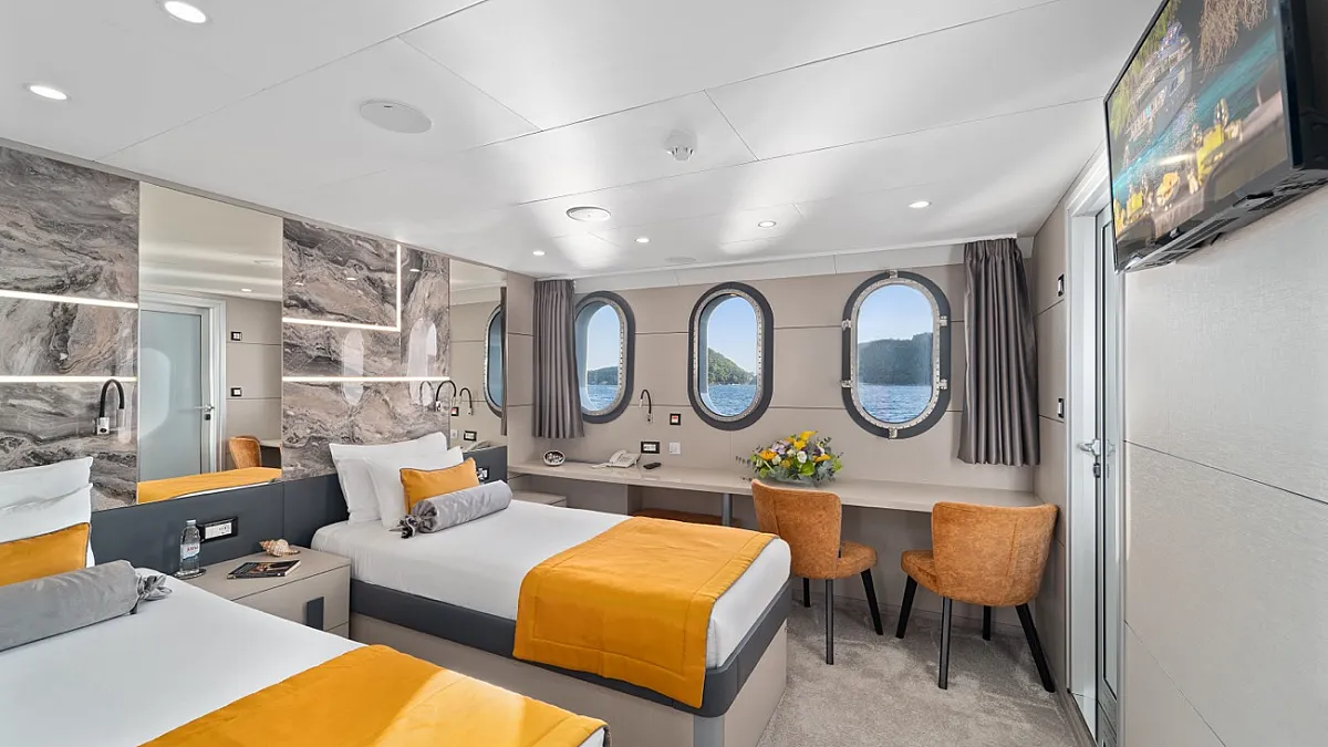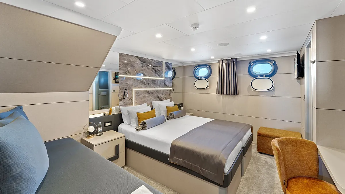 LOWER DECK : Double cabin with double bed. Twin cabin with 2 single beds. 2 Triple cabins with double bed and single bed.