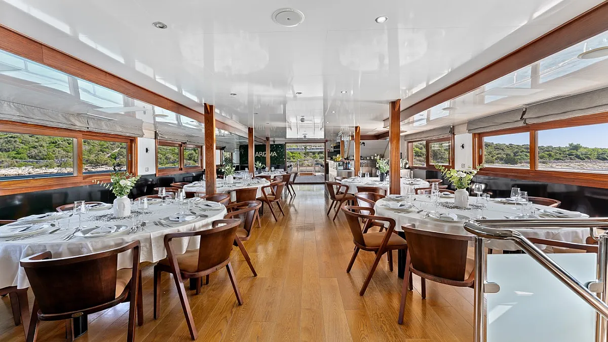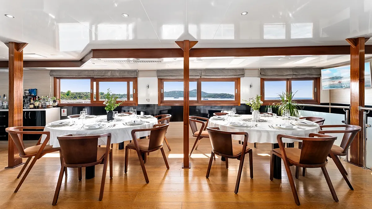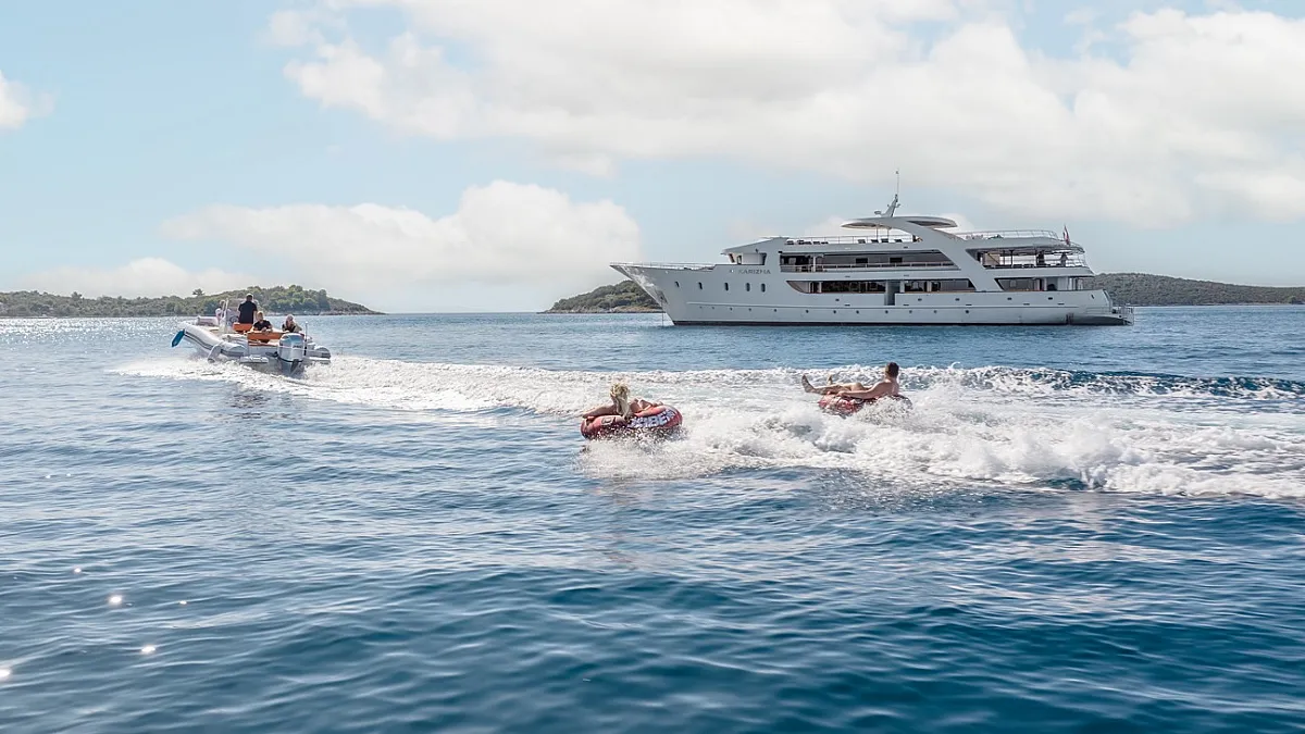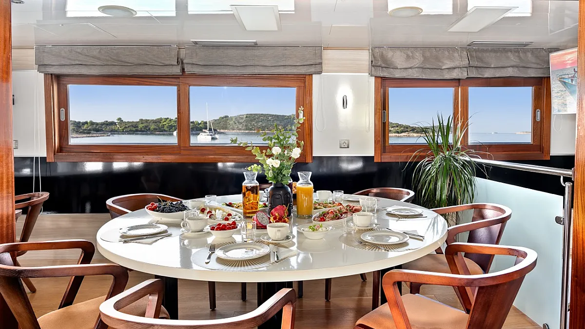 VAT, accommodation (maximum number of 34+2 guests sleeping in 17 cabins), fuel for cruising (4 hours/day), crew (10 crew members (Captain, 2 Chefs, Chief Hostess, First Mate, 2 Sailors, 2 Hostess, Maid), unlimited A/C, linen (bed sheets, bathroom, and beach towels), Wifi and fresh fruit every day
