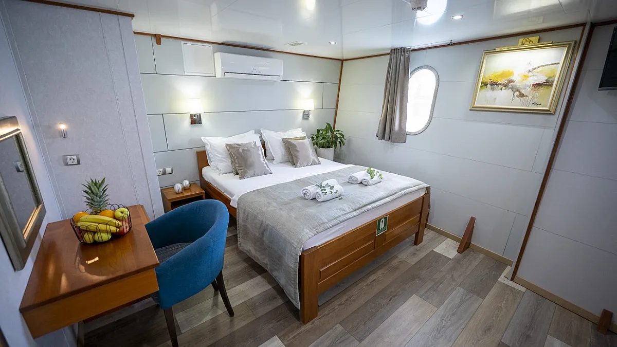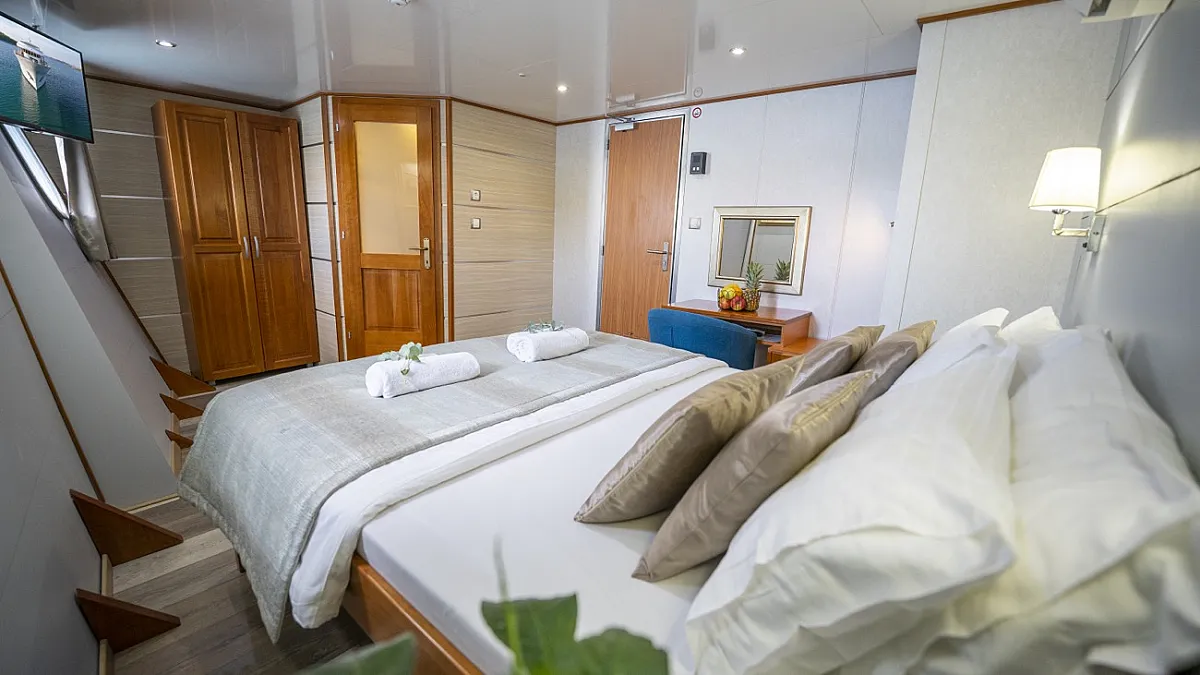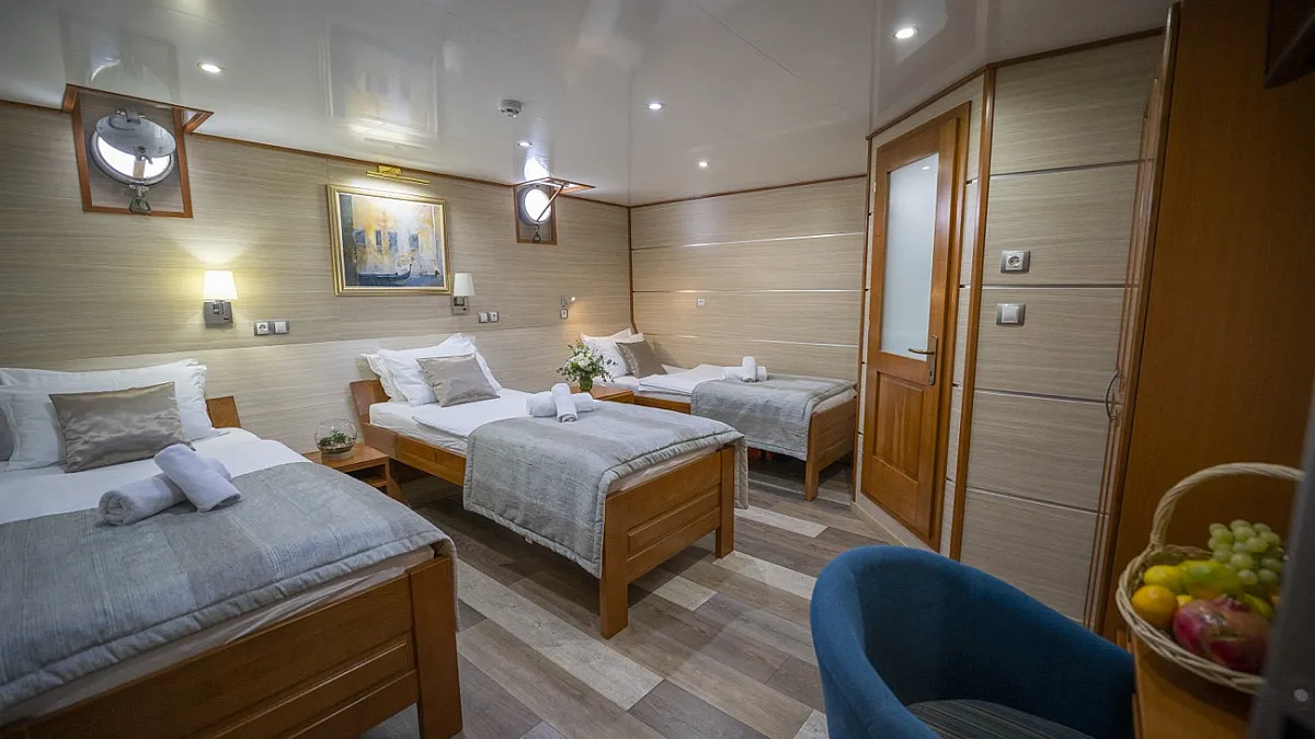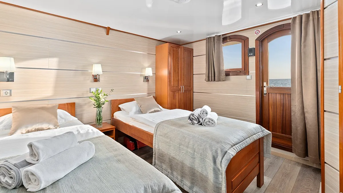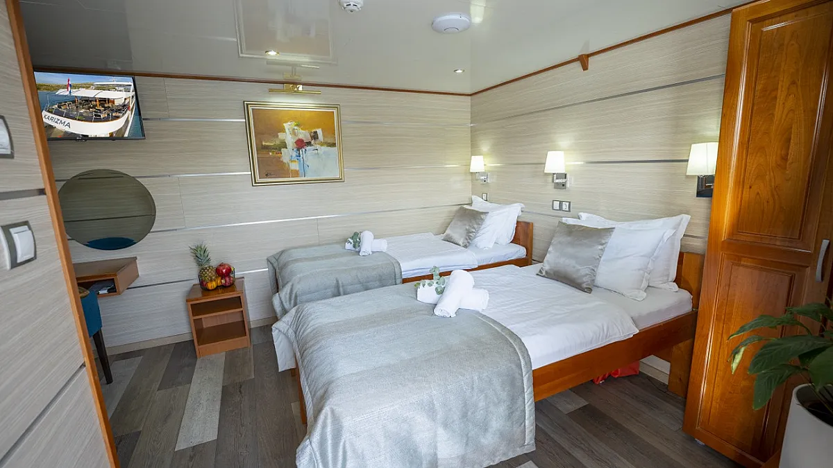 MAIN DECK: 2 Double cabins with double bed. Twin cabin with 2 single beds. 2 Convertible cabins (twin or double). 2 Triple cabins (Convertible).